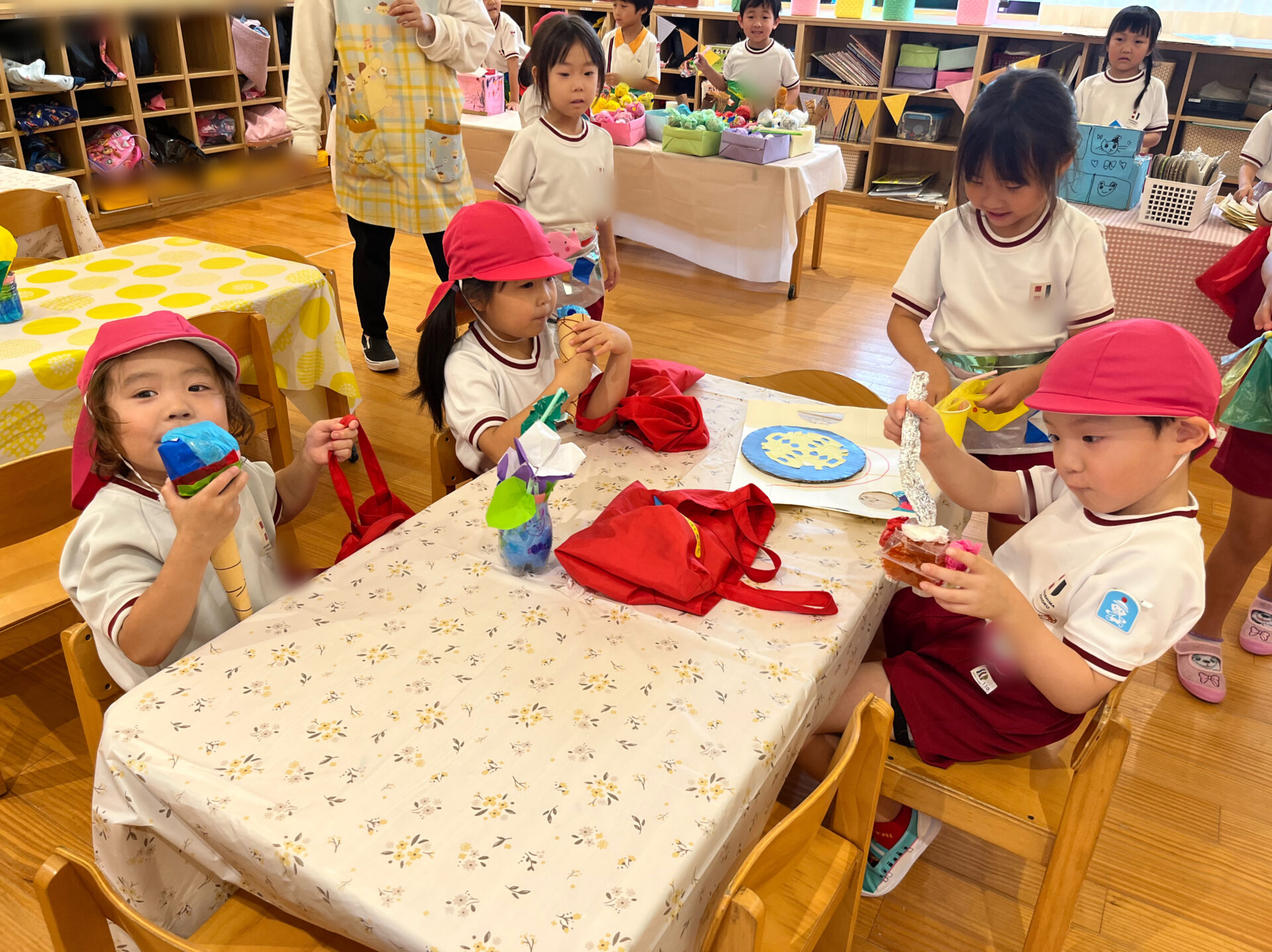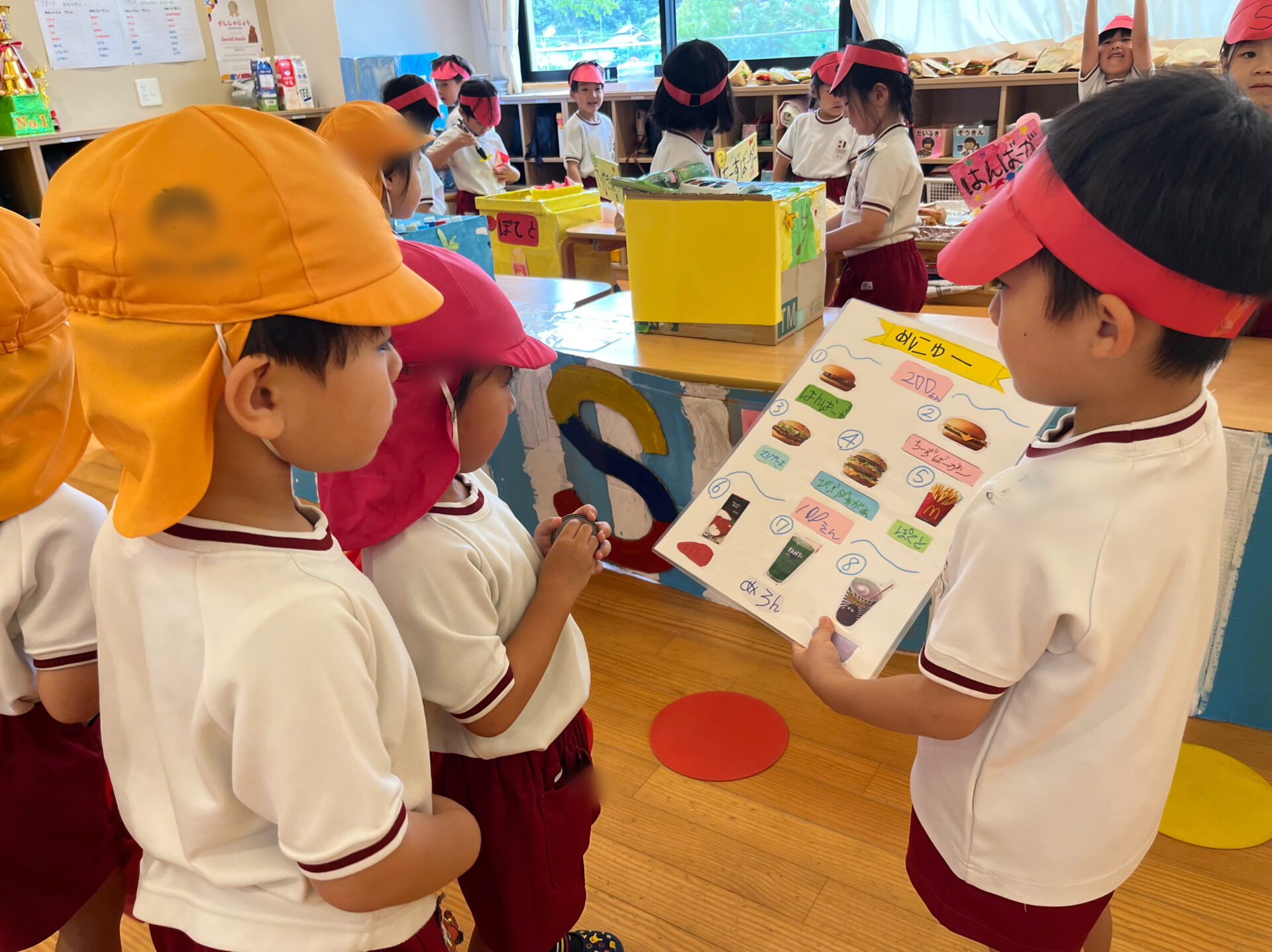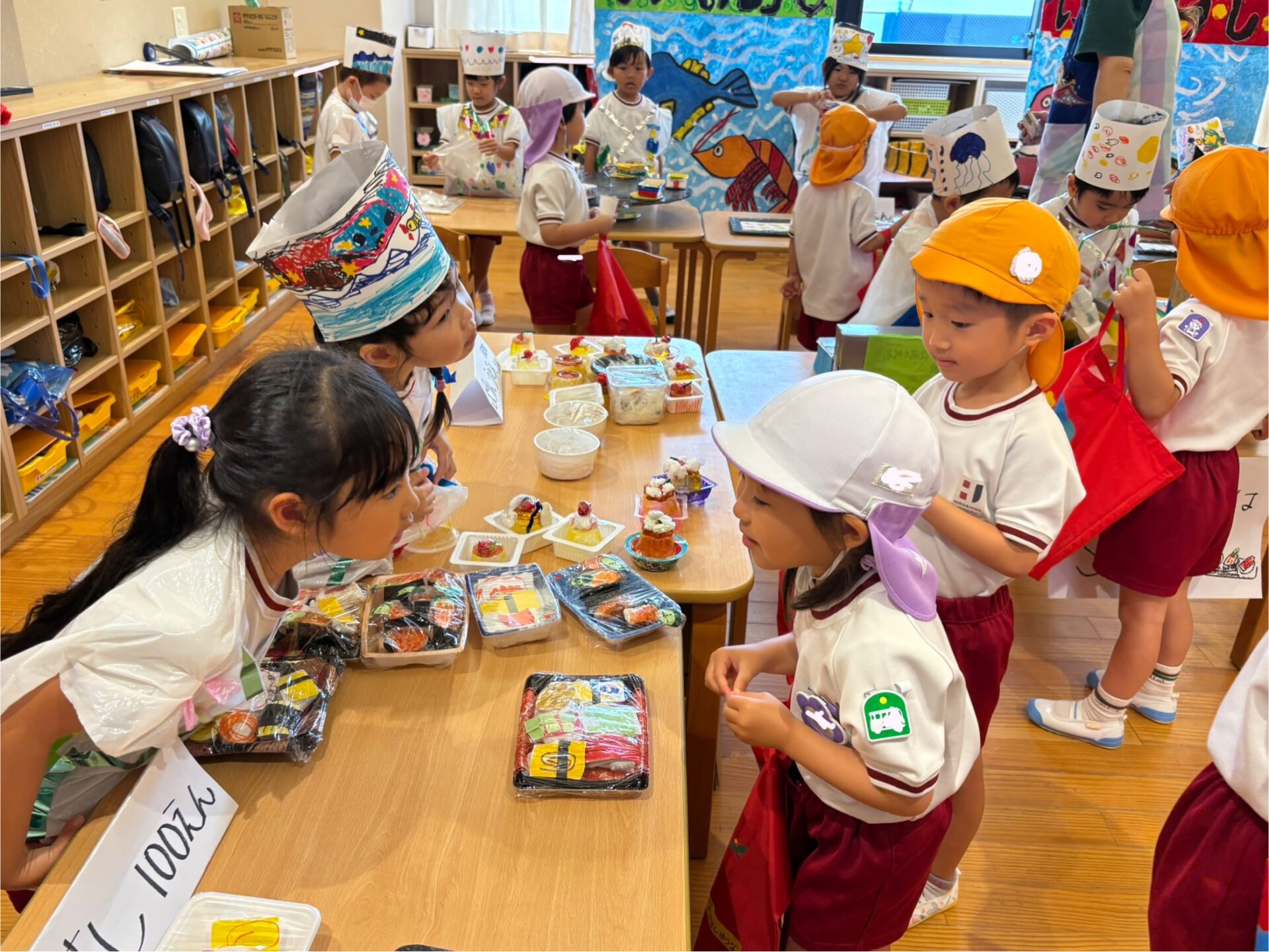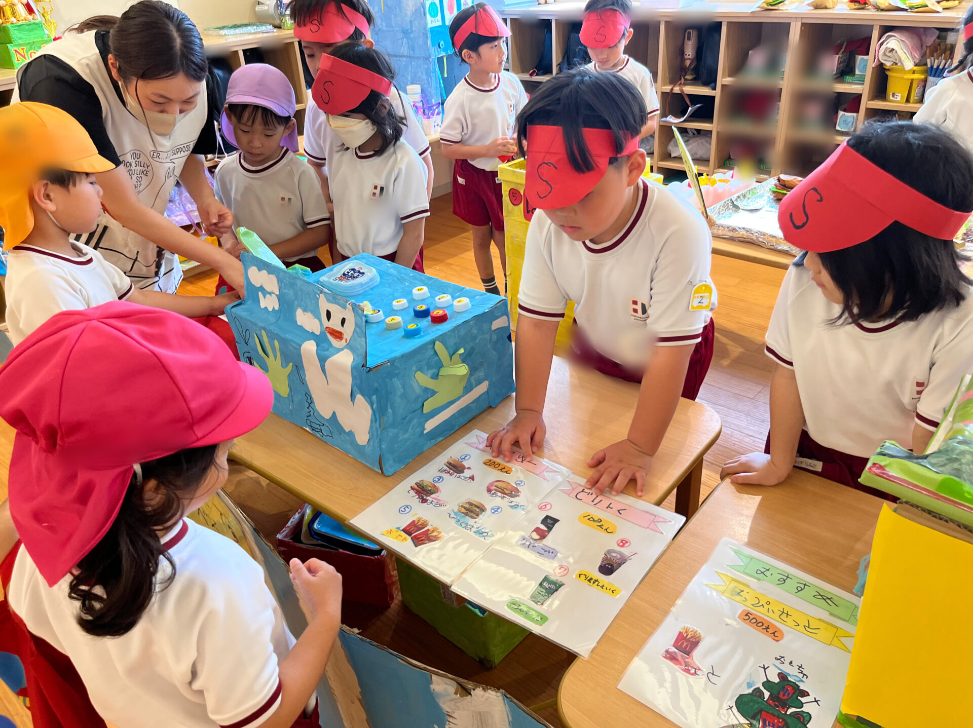 summer day campで各クラスが開店したお店屋さん。とっても大盛況でしたね。こんな楽しい時間、一回で終わりたくない!、、、といういきさつで年中組さんを招待して再びお店屋さん、開店です!