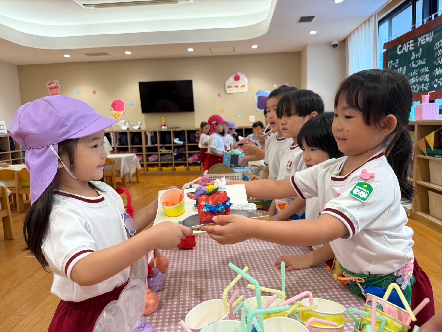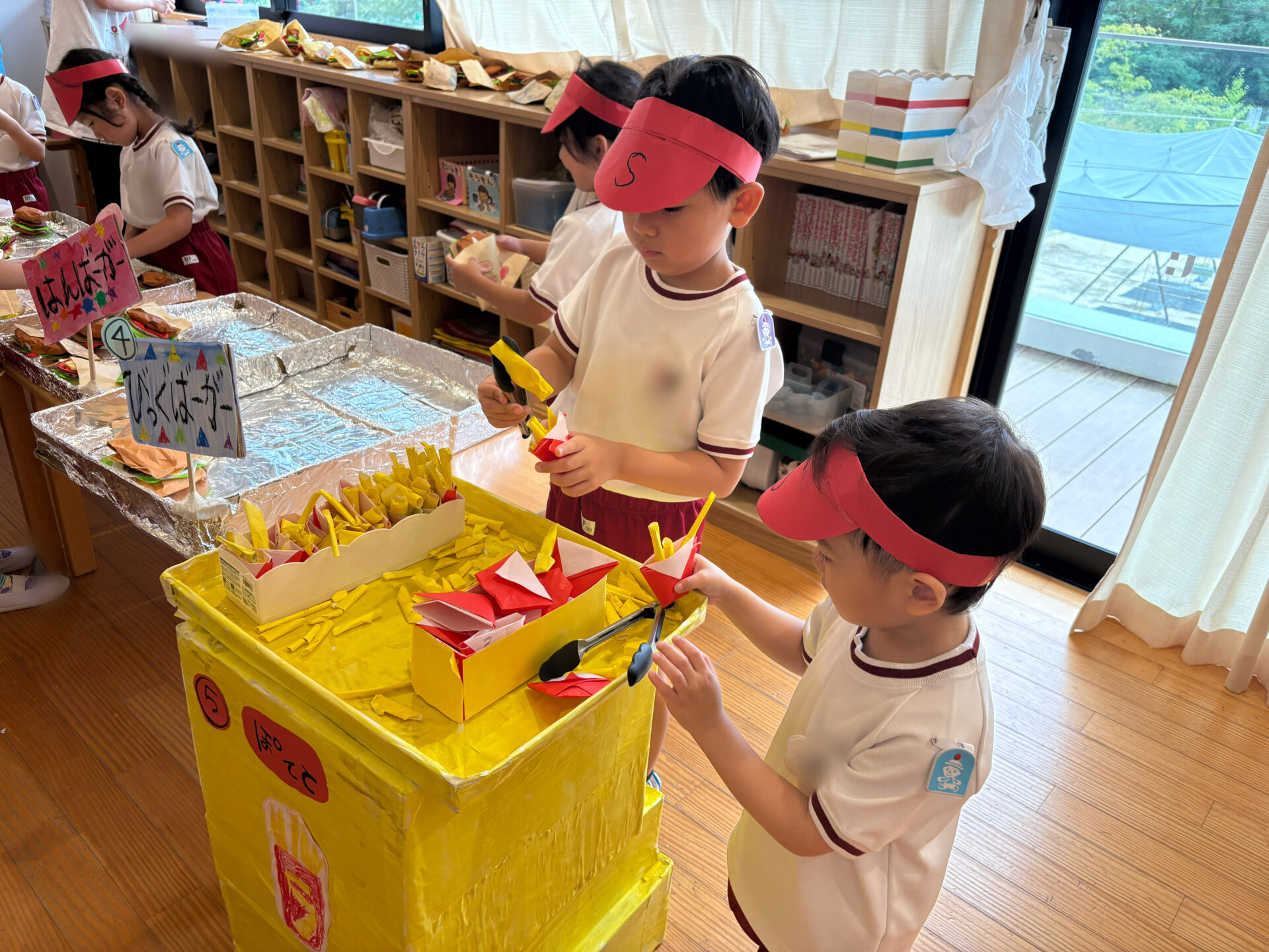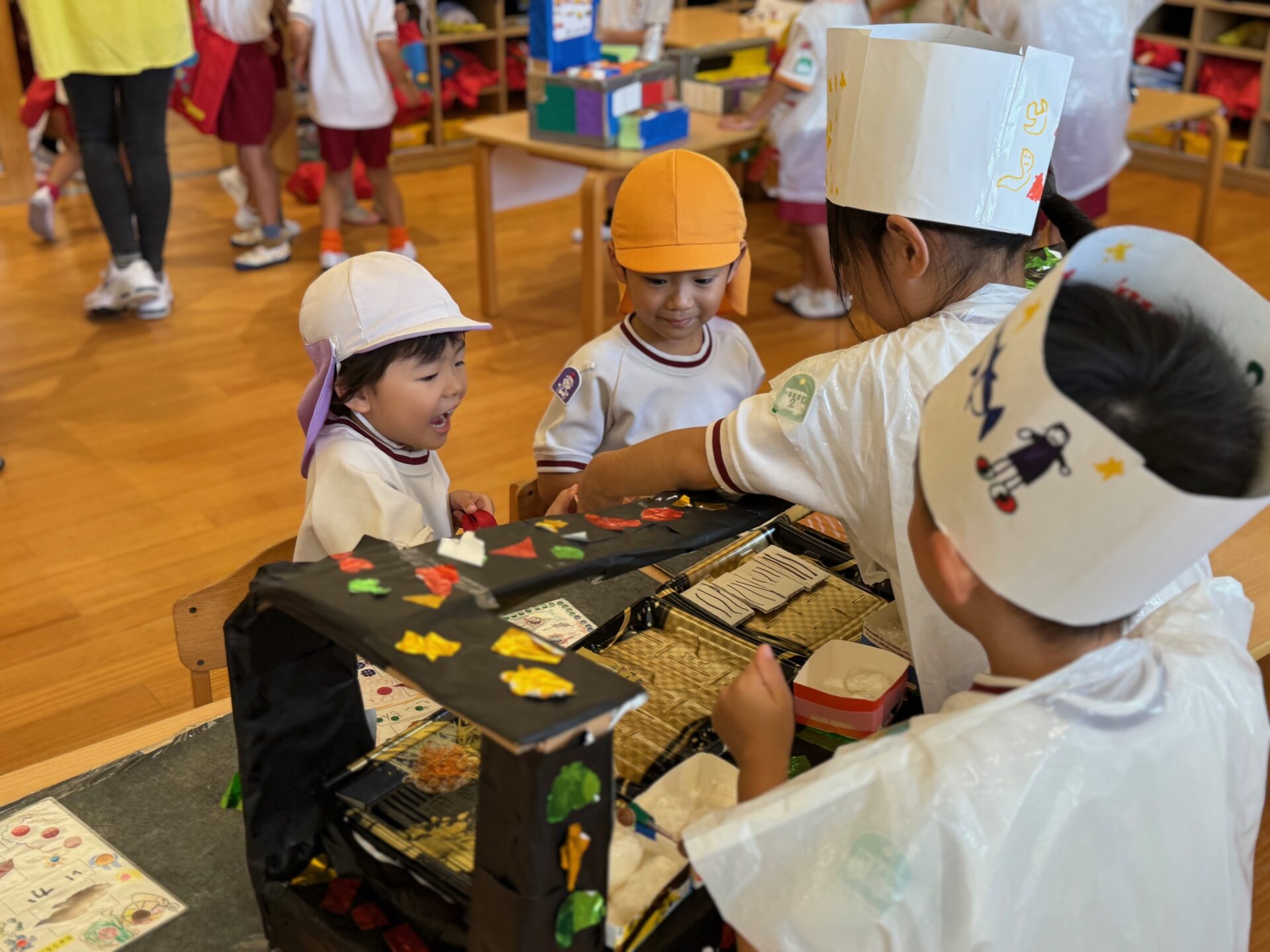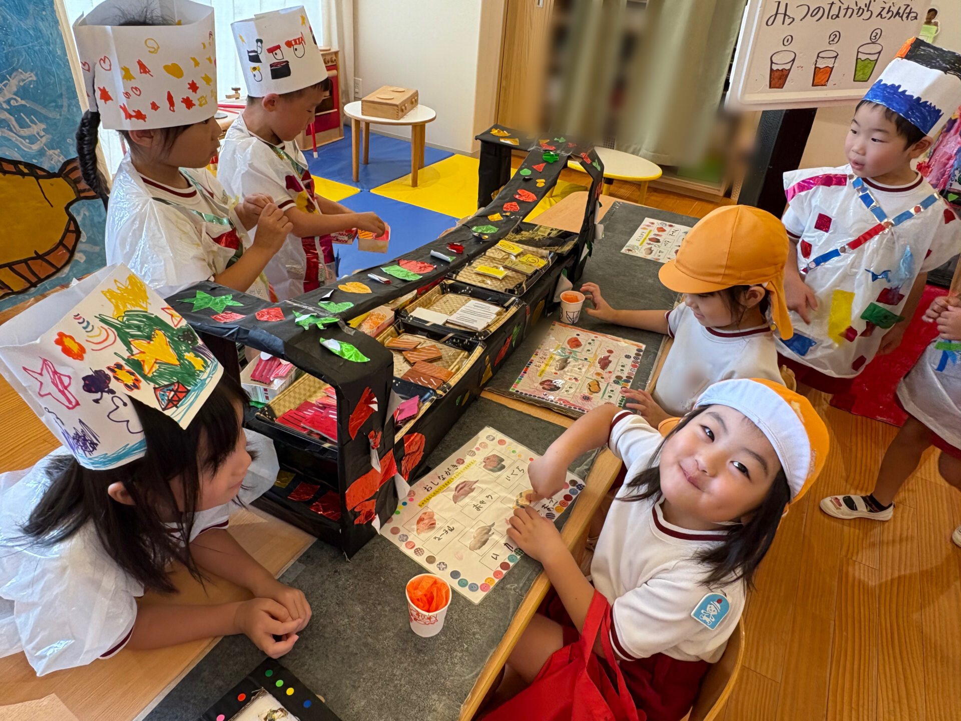 summer day campで各クラスが開店したお店屋さん。とっても大盛況でしたね。こんな楽しい時間、一回で終わりたくない!、、、といういきさつで年中組さんを招待して再びお店屋さん、開店です!