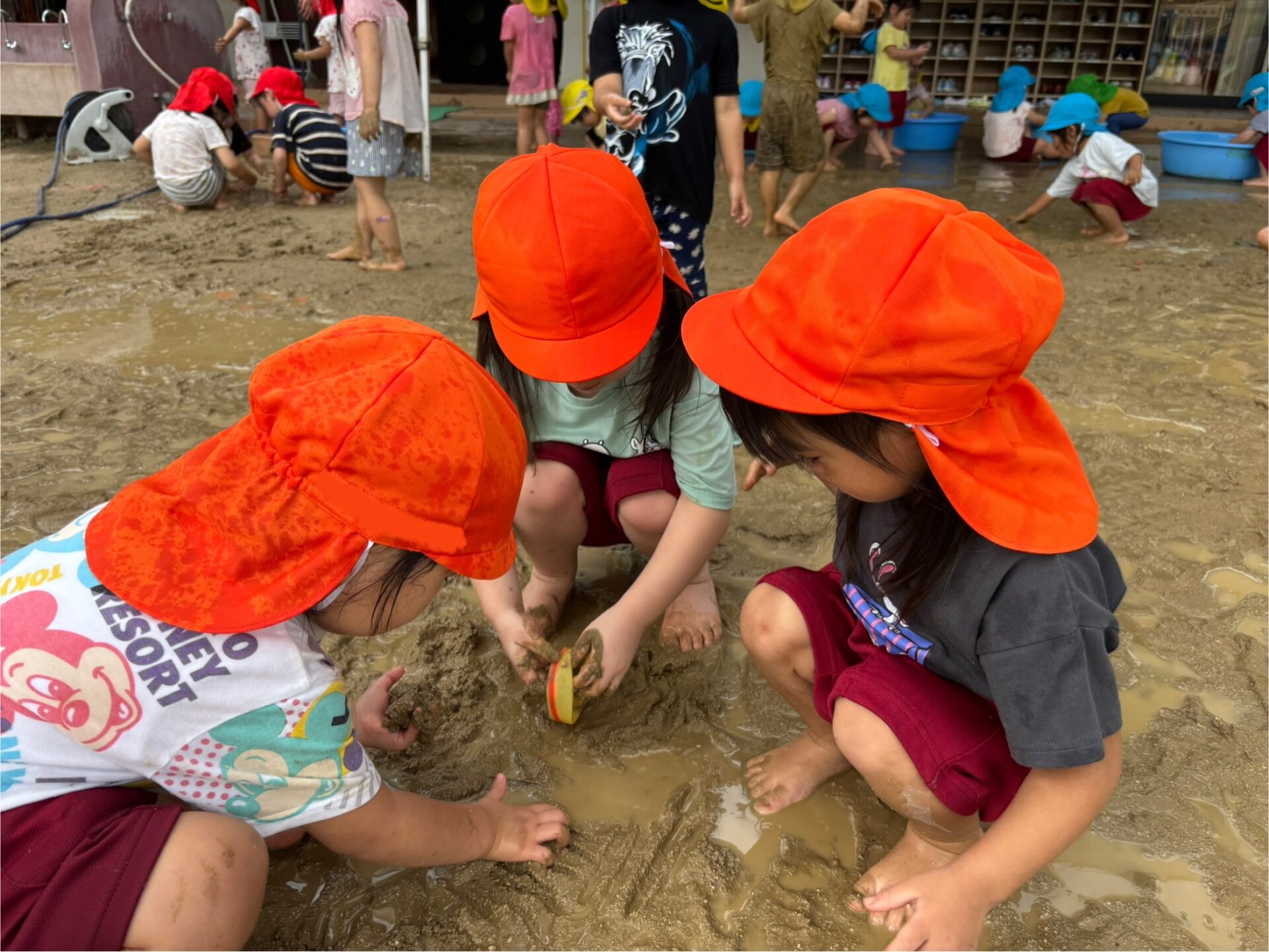 裸足で泥の感触を味わいながら、手でぐにゅぐにゅ… 足でぺたぺた… 全身を使って夢中になって遊びました♪