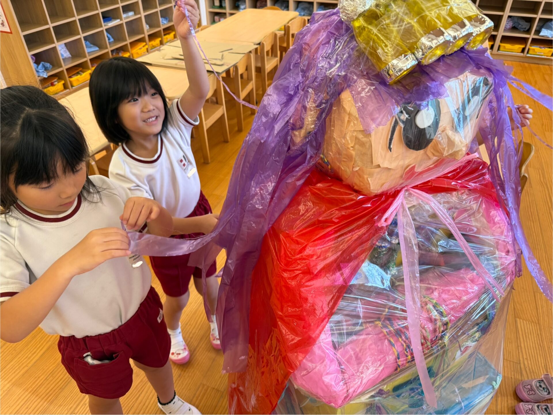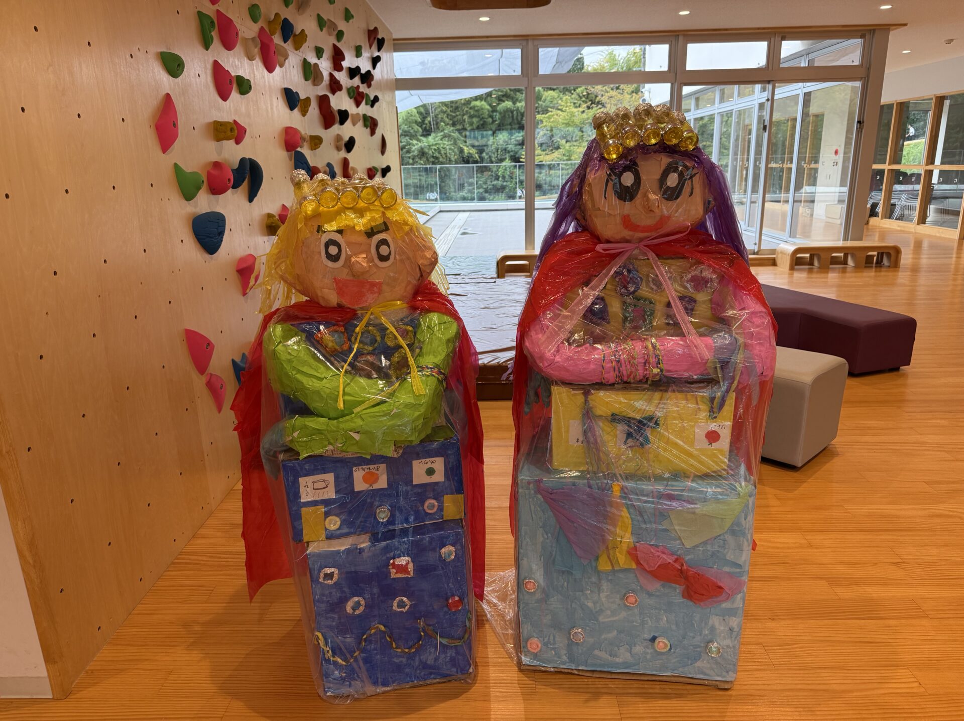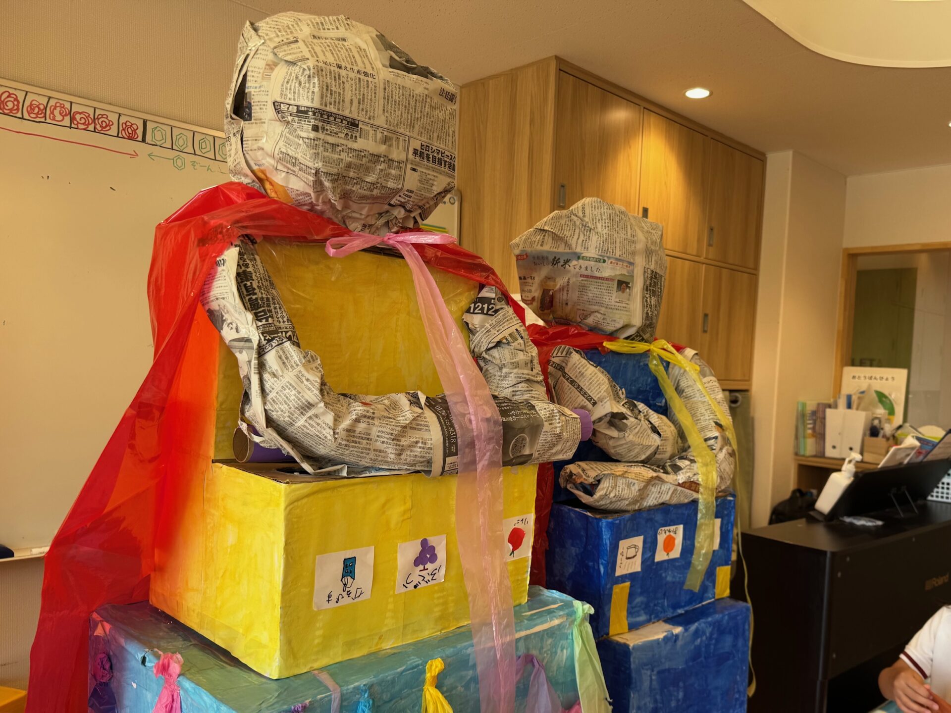 今回のかかしは、summer day campのお買い物ごっこで使った製作物をリサイクルして作ったものです。思い出のつまった材料が新しい形になり、子どもたちのアイデアと工夫で生まれ変わりました。