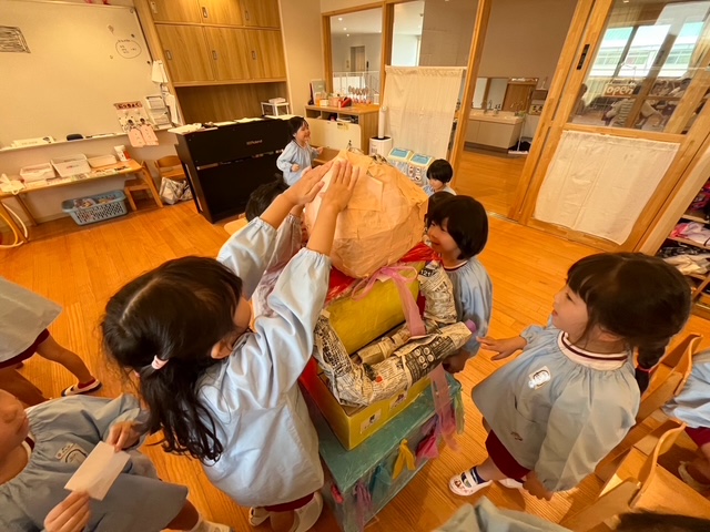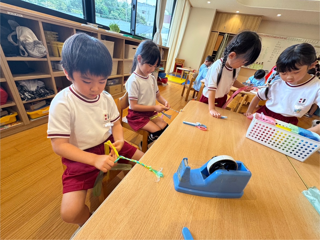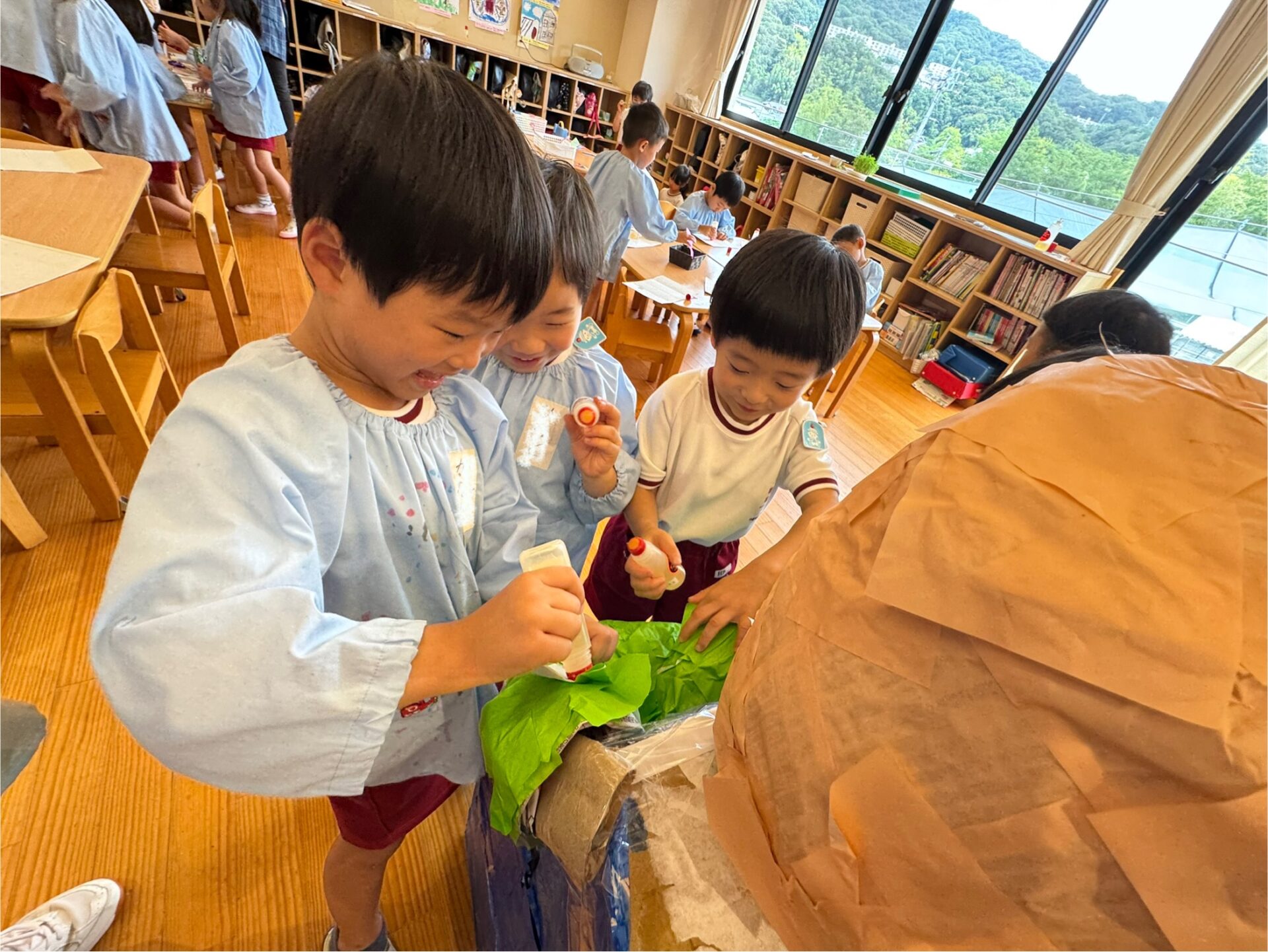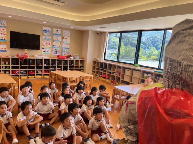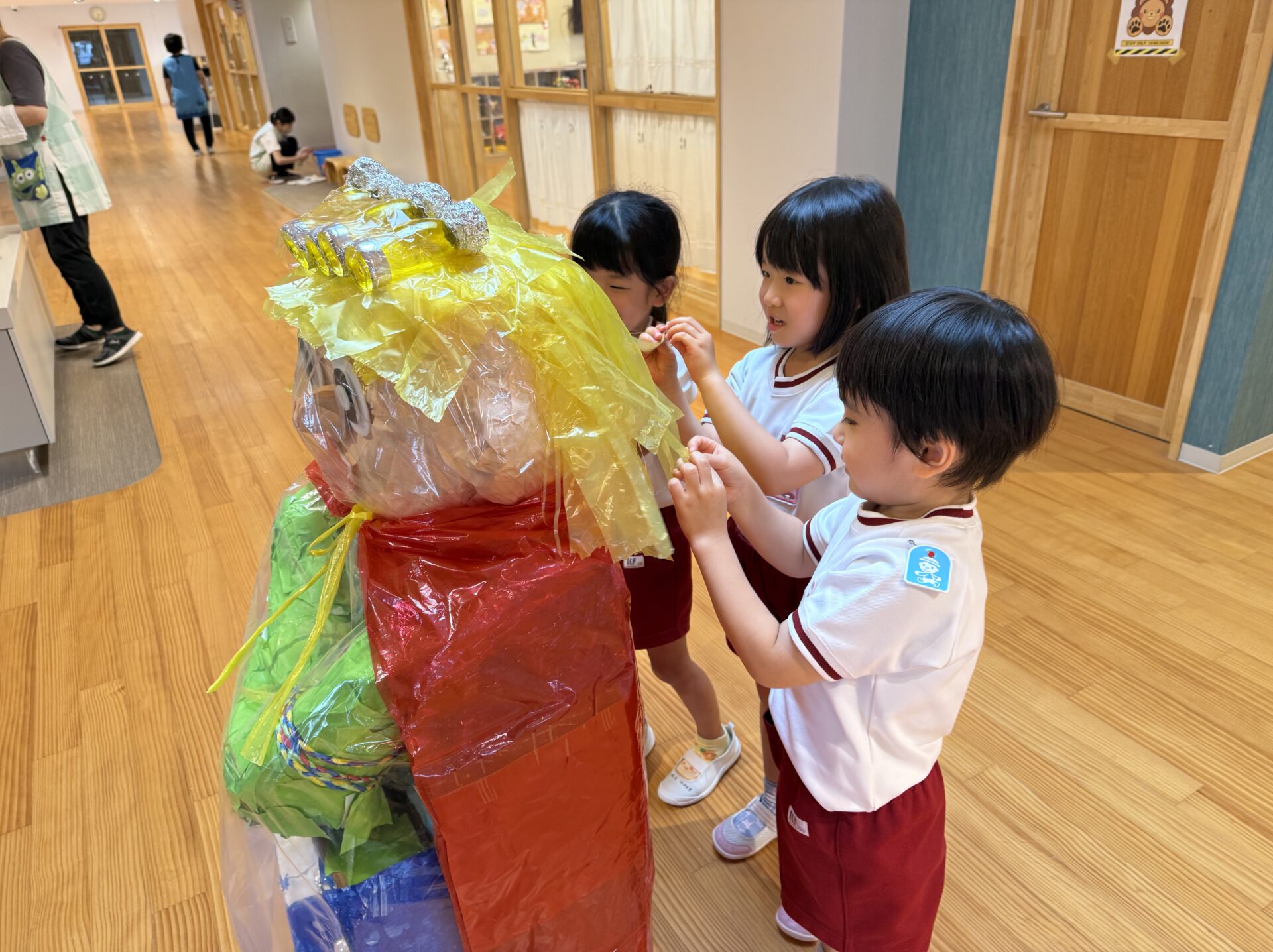 今回のかかしは、summer day campのお買い物ごっこで使った製作物をリサイクルして作ったものです。思い出のつまった材料が新しい形になり、子どもたちのアイデアと工夫で生まれ変わりました。