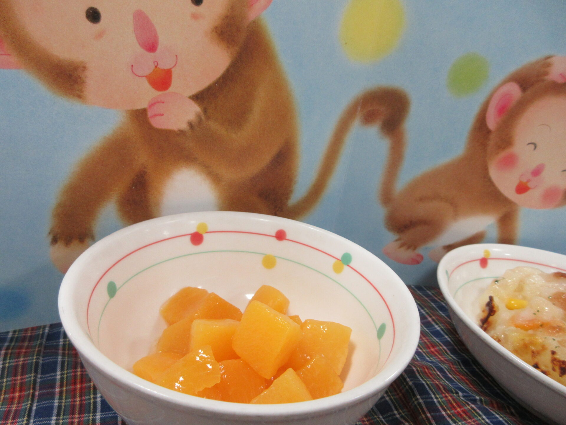 【🥕にんじんご飯 ポテトの豆乳チーズ焼き 豆苗野菜スープ 黄桃缶】