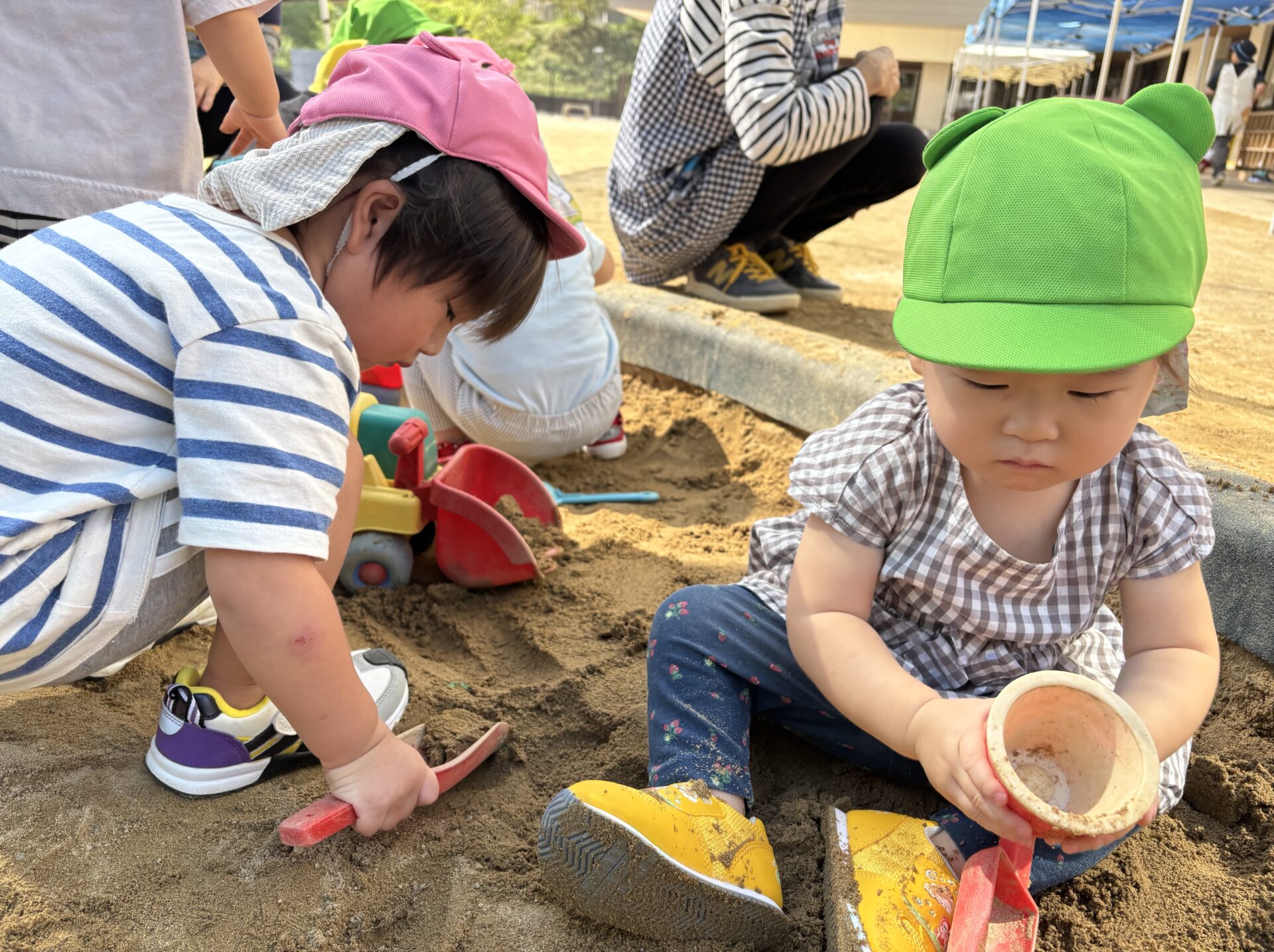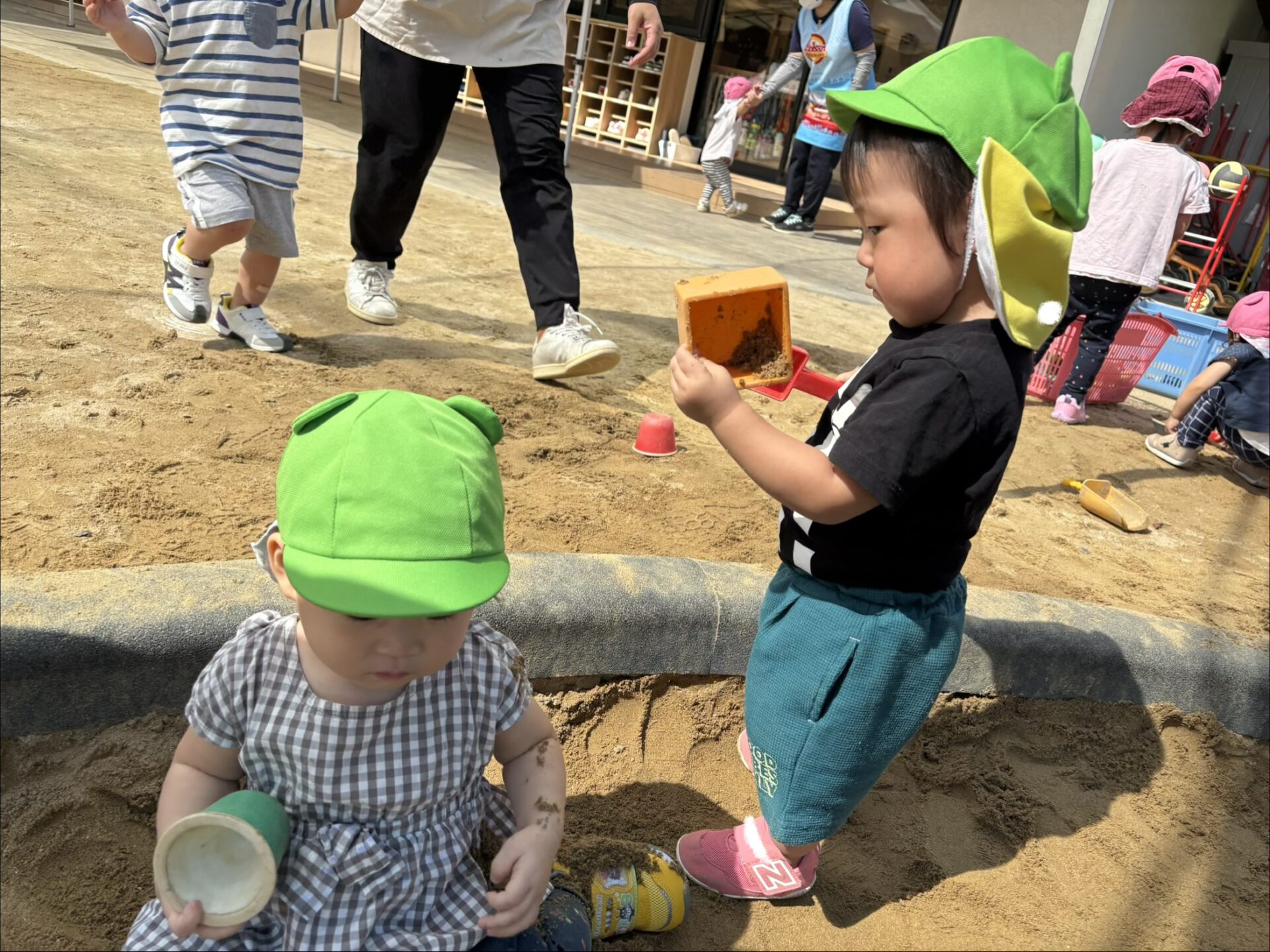 嬉しそうに靴をはき、砂場まで手を繋いで歩いて行きました♪