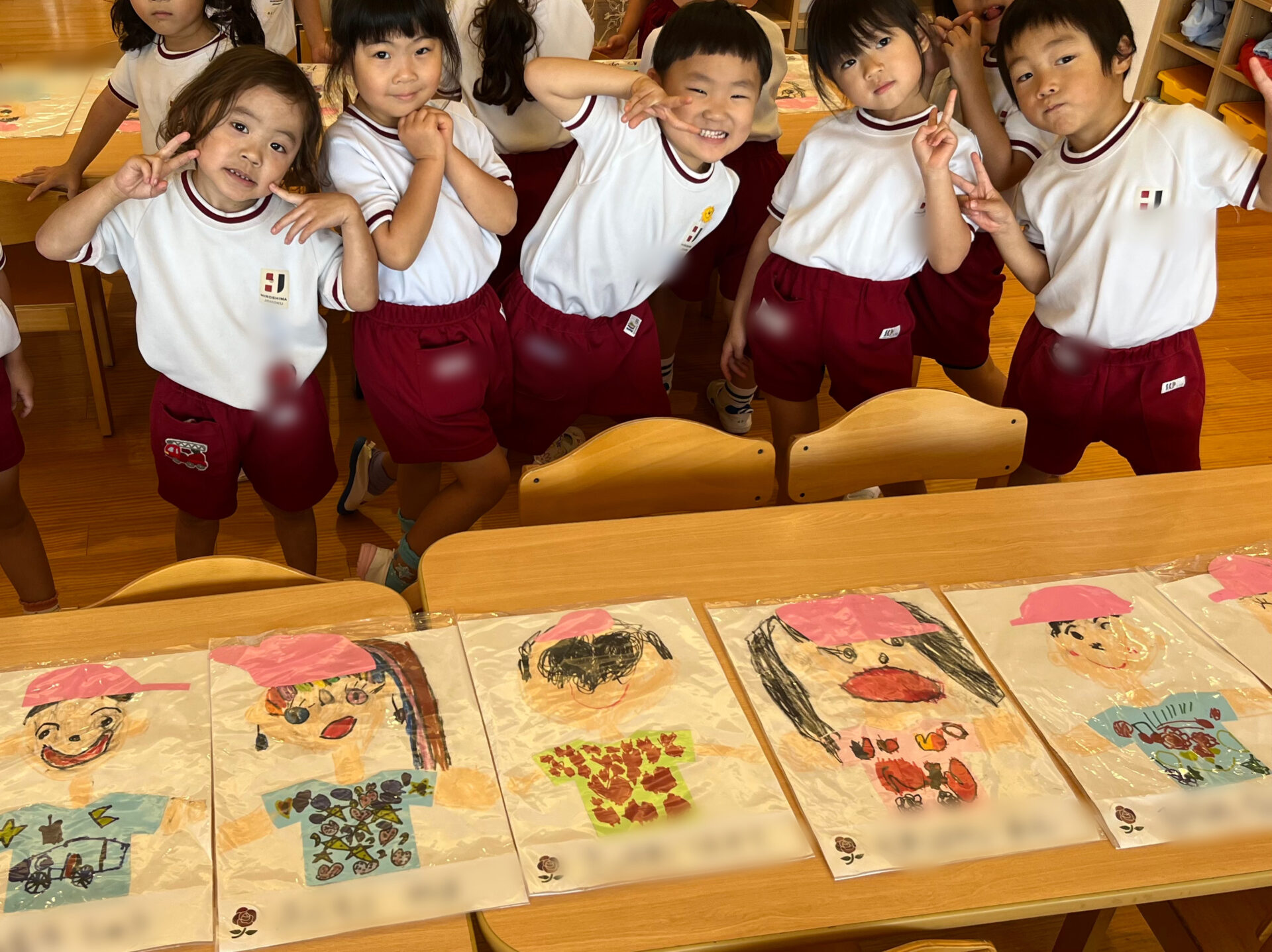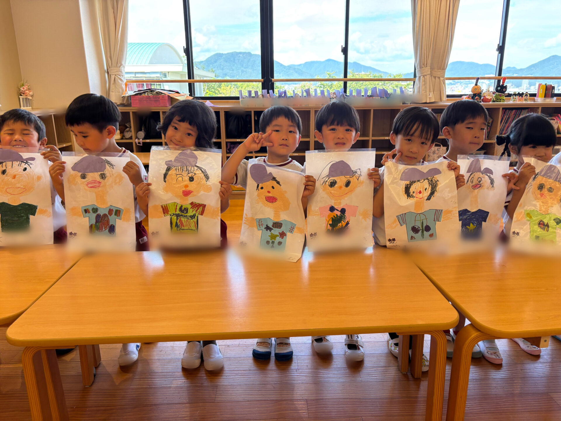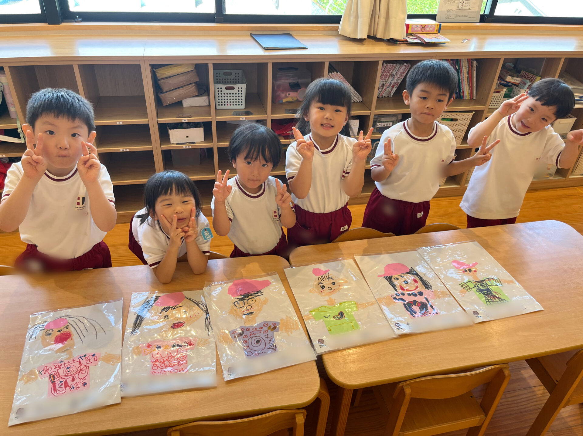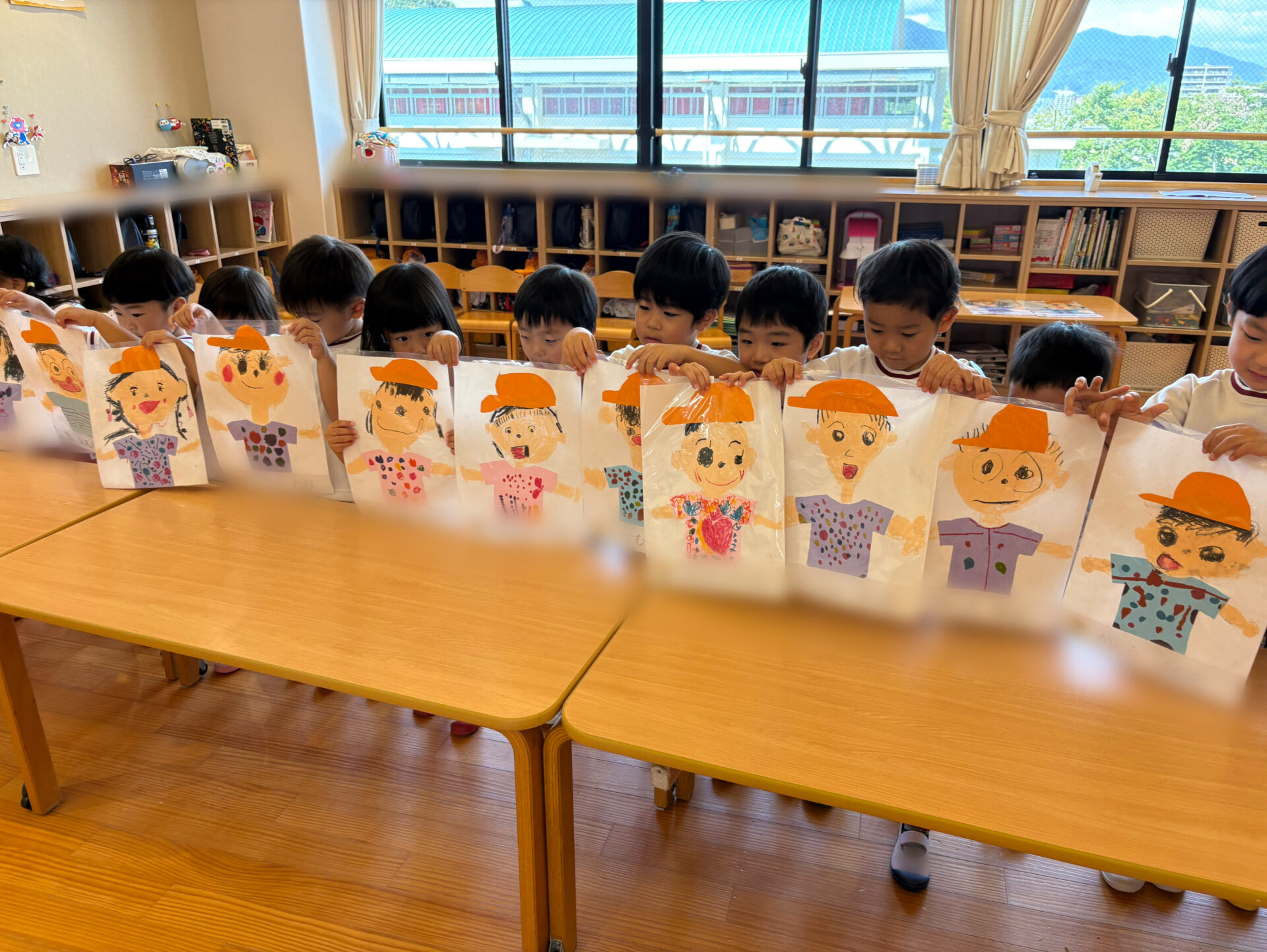 洋服や帽子はハサミで丁寧に切り、顔や首、手はクレパスで描きました。色も力強く塗り込めるようになり、手や首の位置もよく考えて表現できるようになりました。
