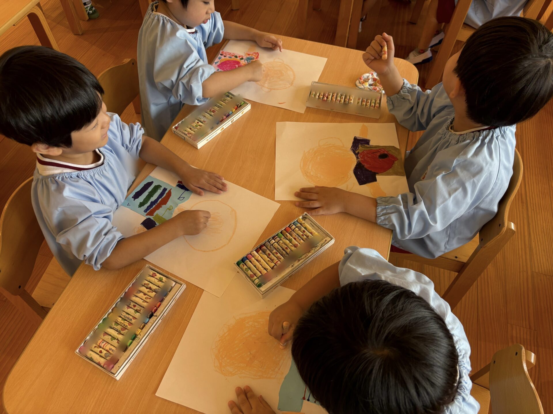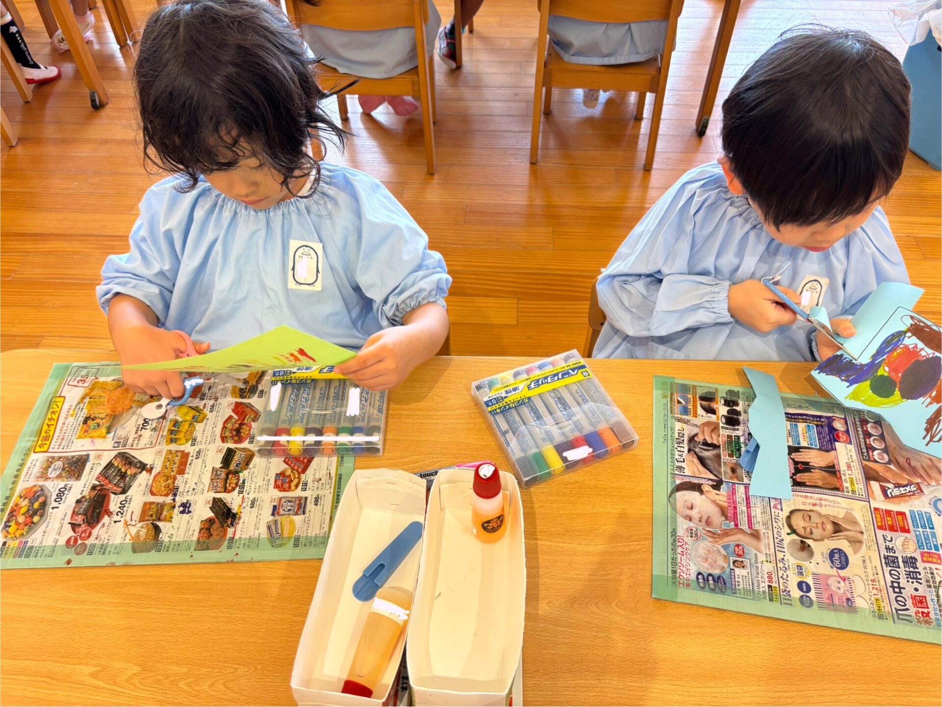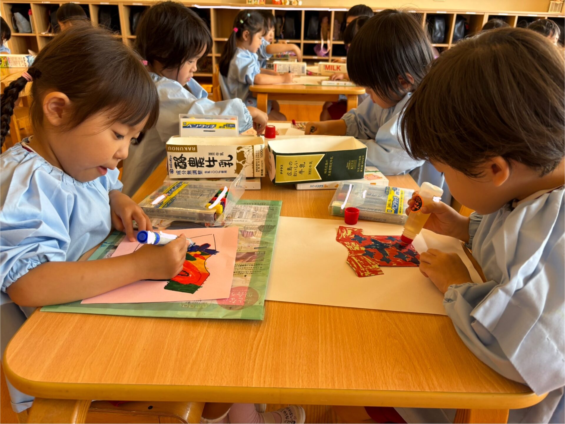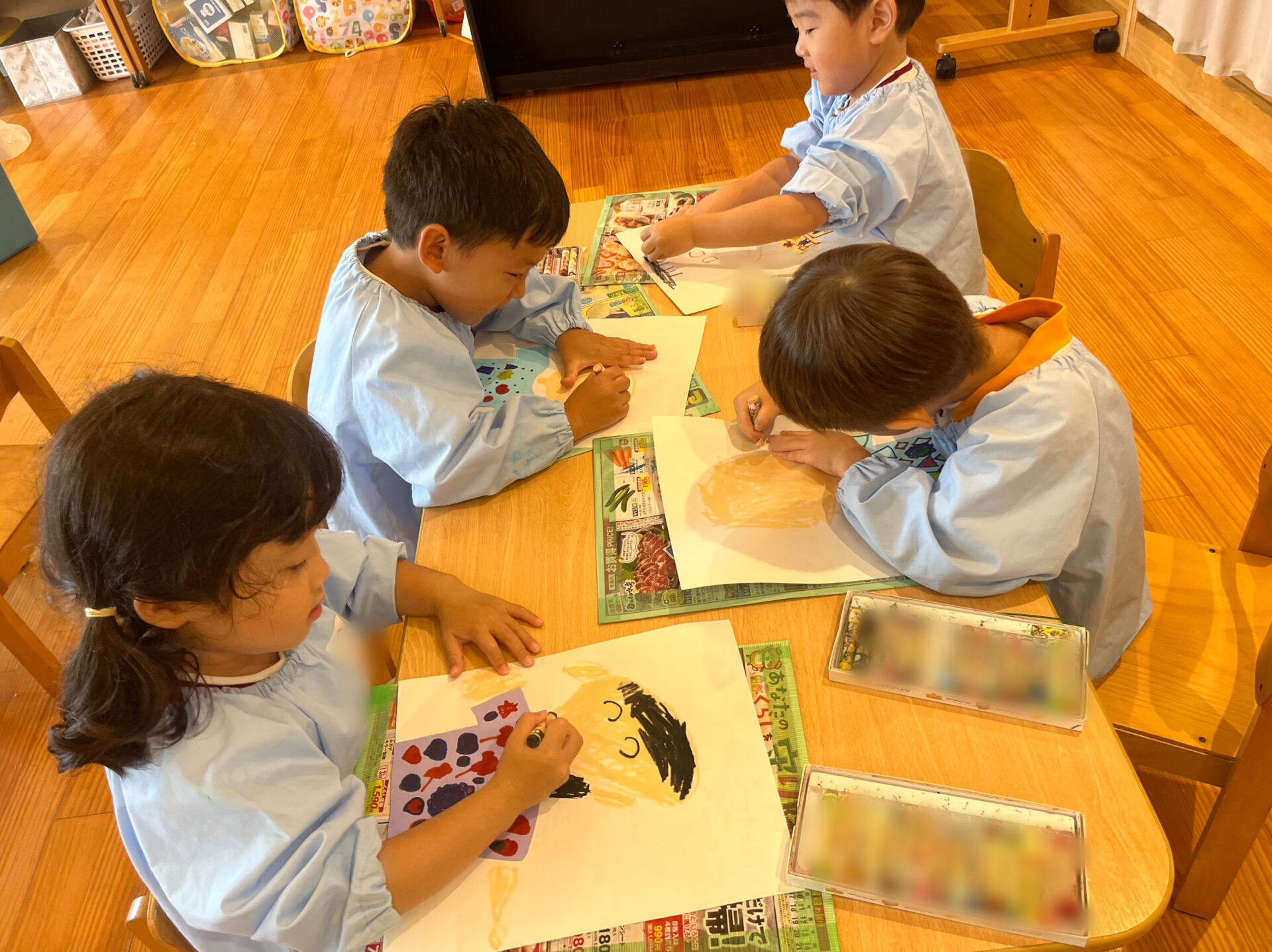 洋服や帽子はハサミで丁寧に切り、顔や首、手はクレパスで描きました。色も力強く塗り込めるようになり、手や首の位置もよく考えて表現できるようになりました。