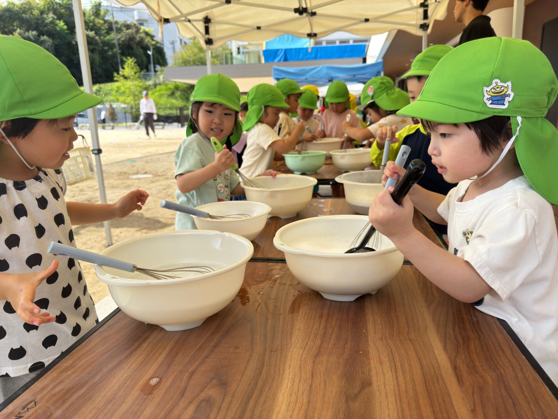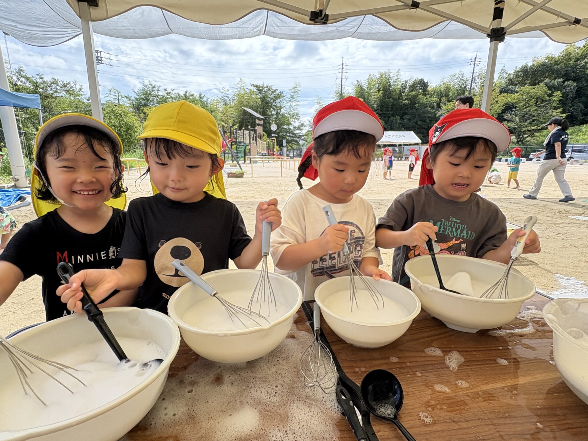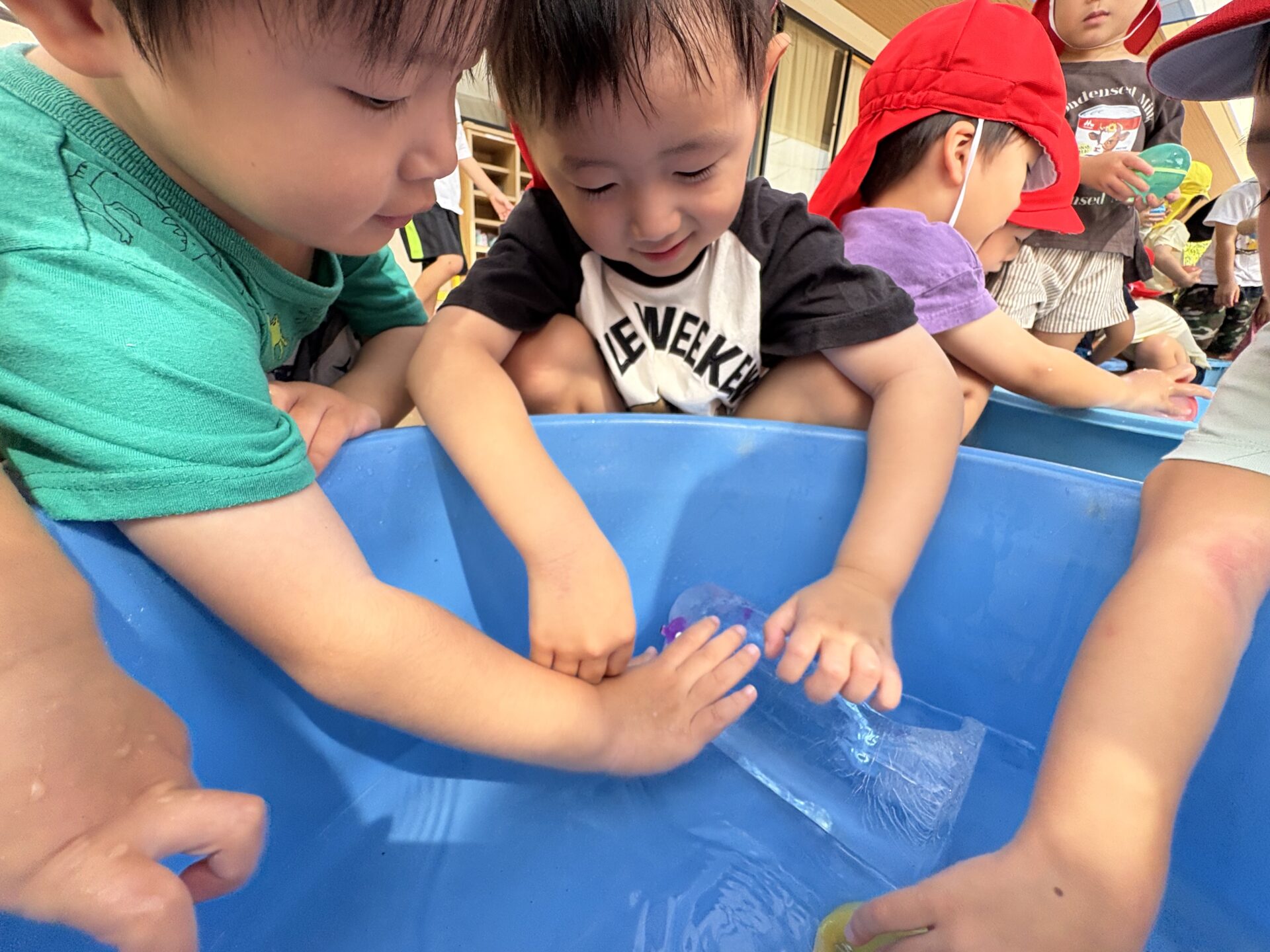 今年度最後の水遊びをしました。泡や泥の感触、氷の冷たさや溶ける様子など様々な感触を楽しんでいる様子がみられました。どのように混ぜると泡がたくさんできるか、どのくらいの水加減にすると泥の硬さが変わるかなど、実際に体験し気づいたことを保育教諭に嬉しそうに伝えたり、友達と共有してかかわりを広げたりしている様子も見られました。