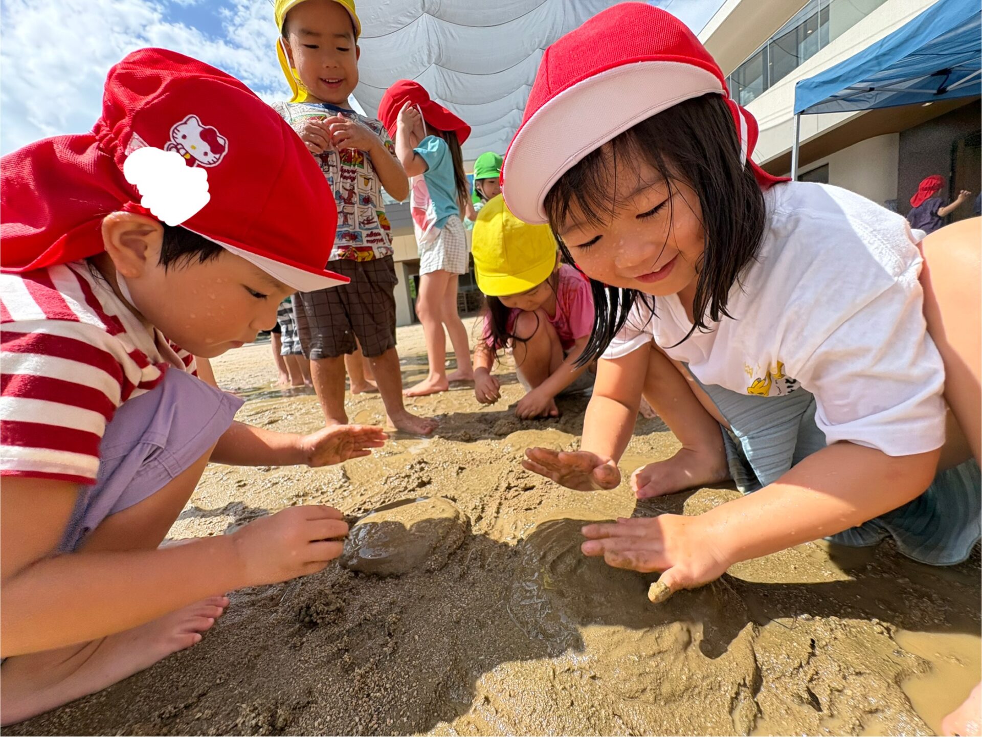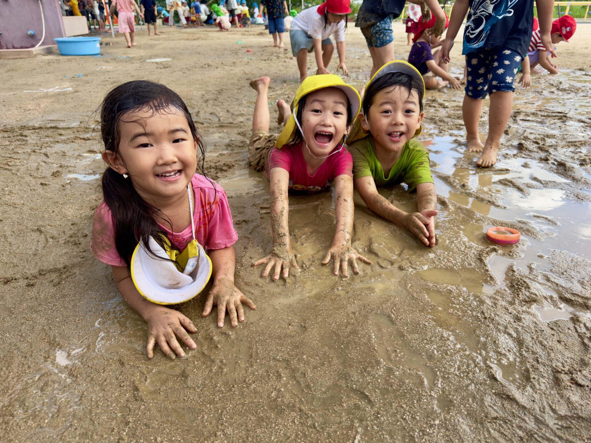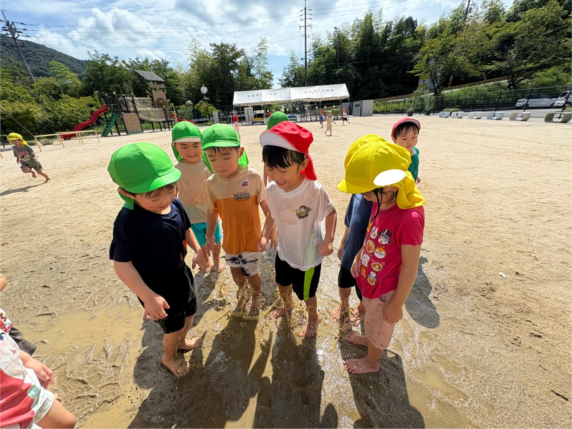 初めは水で濡れたり、泥が付いたりすることに躊躇していた園児も、友達の楽しそうな姿を見て遊びの輪に加わることができました。最後は豪快に泥の感触を楽しむ園児もいましたよ‼ 来年の水遊びもまた楽しみです♪