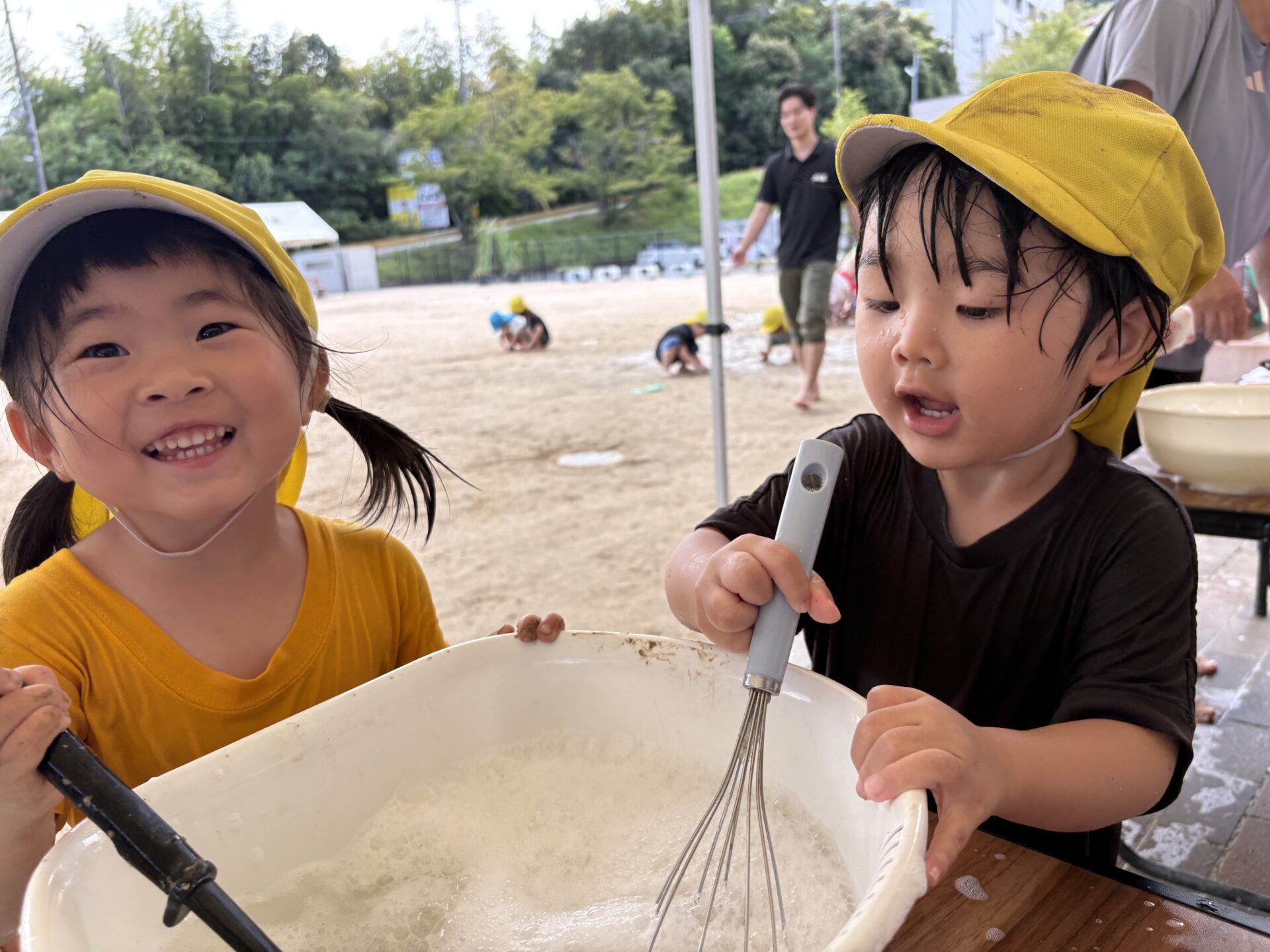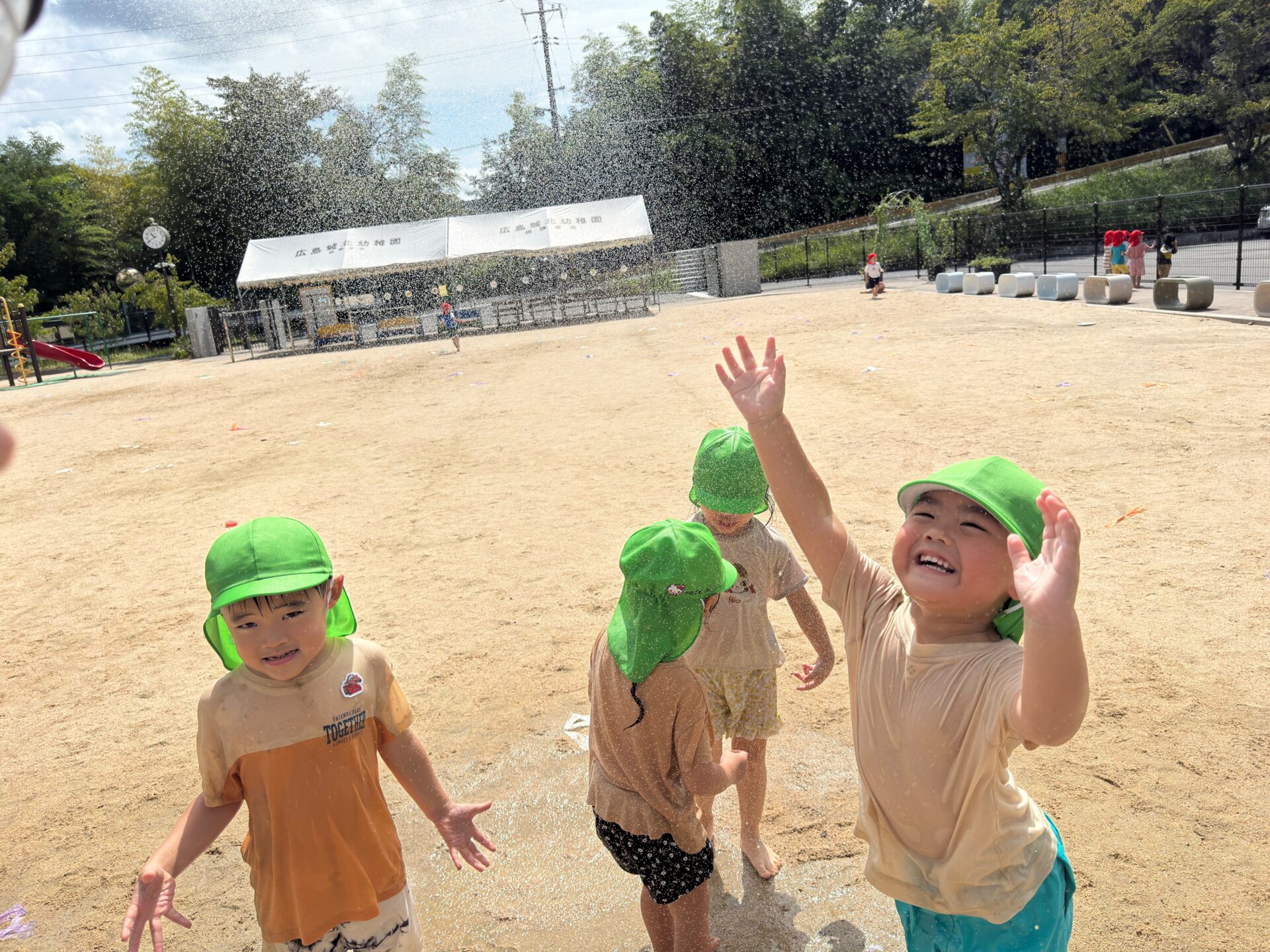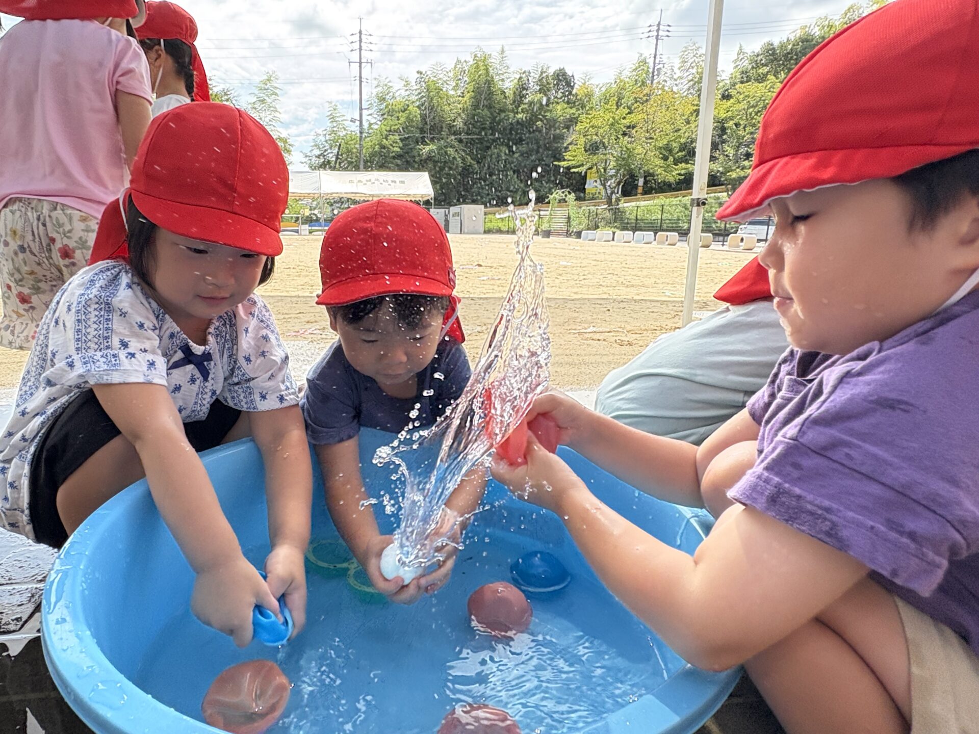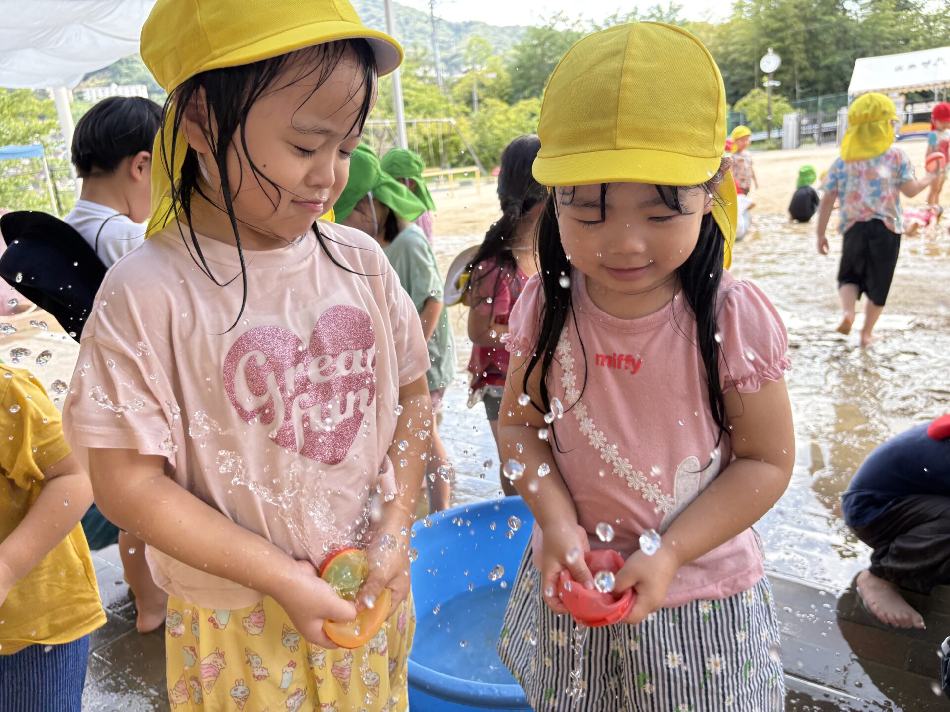 初めは水で濡れたり、泥が付いたりすることに躊躇していた園児も、友達の楽しそうな姿を見て遊びの輪に加わることができました。最後は豪快に泥の感触を楽しむ園児もいましたよ‼ 来年の水遊びもまた楽しみです♪