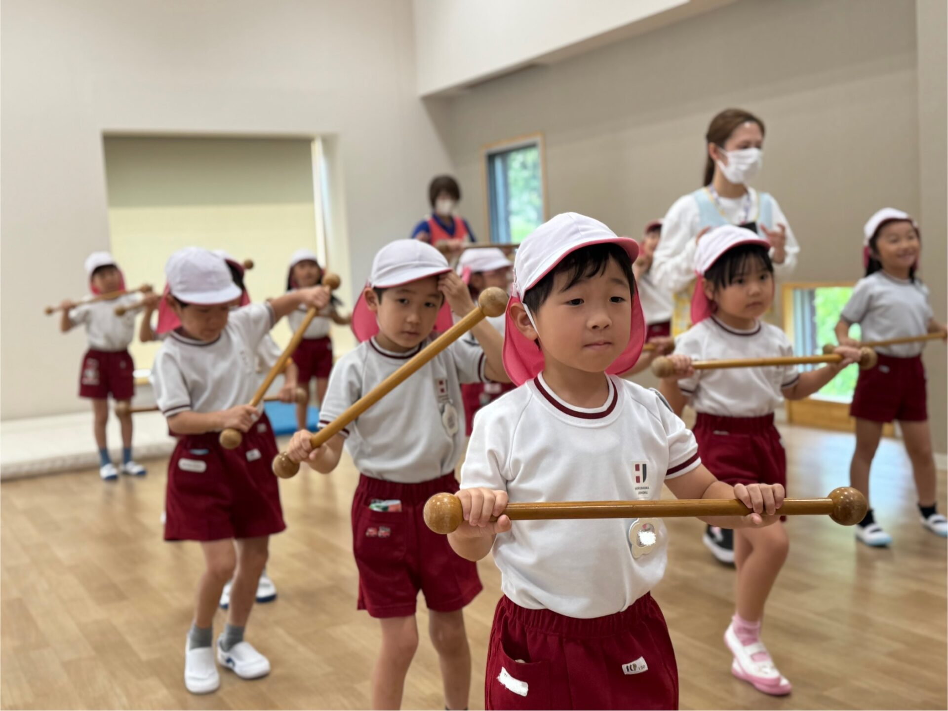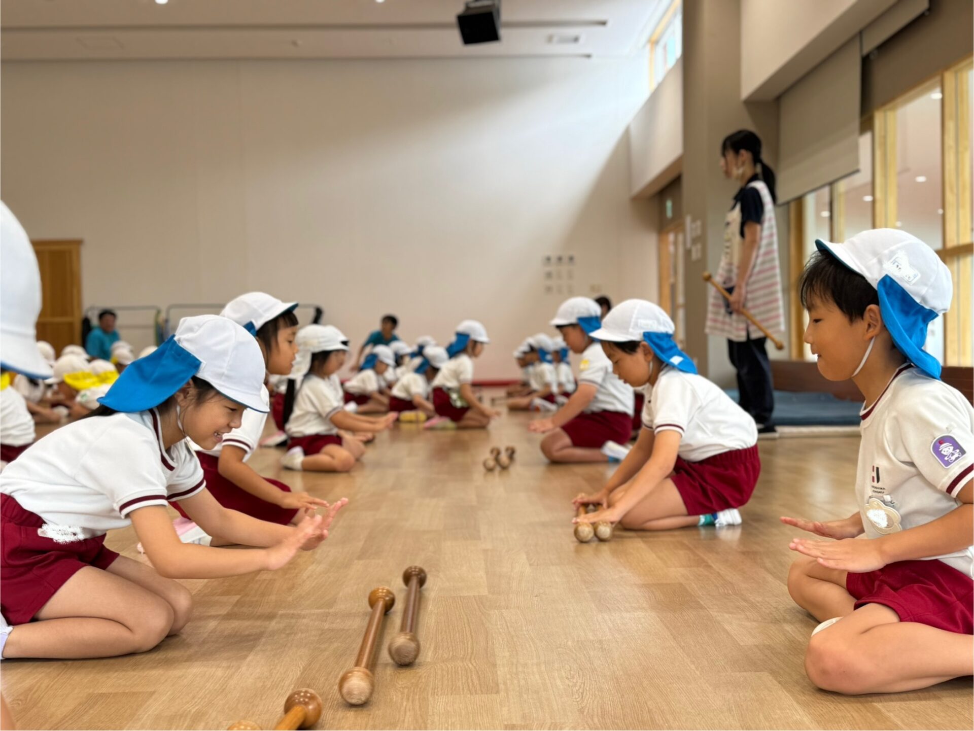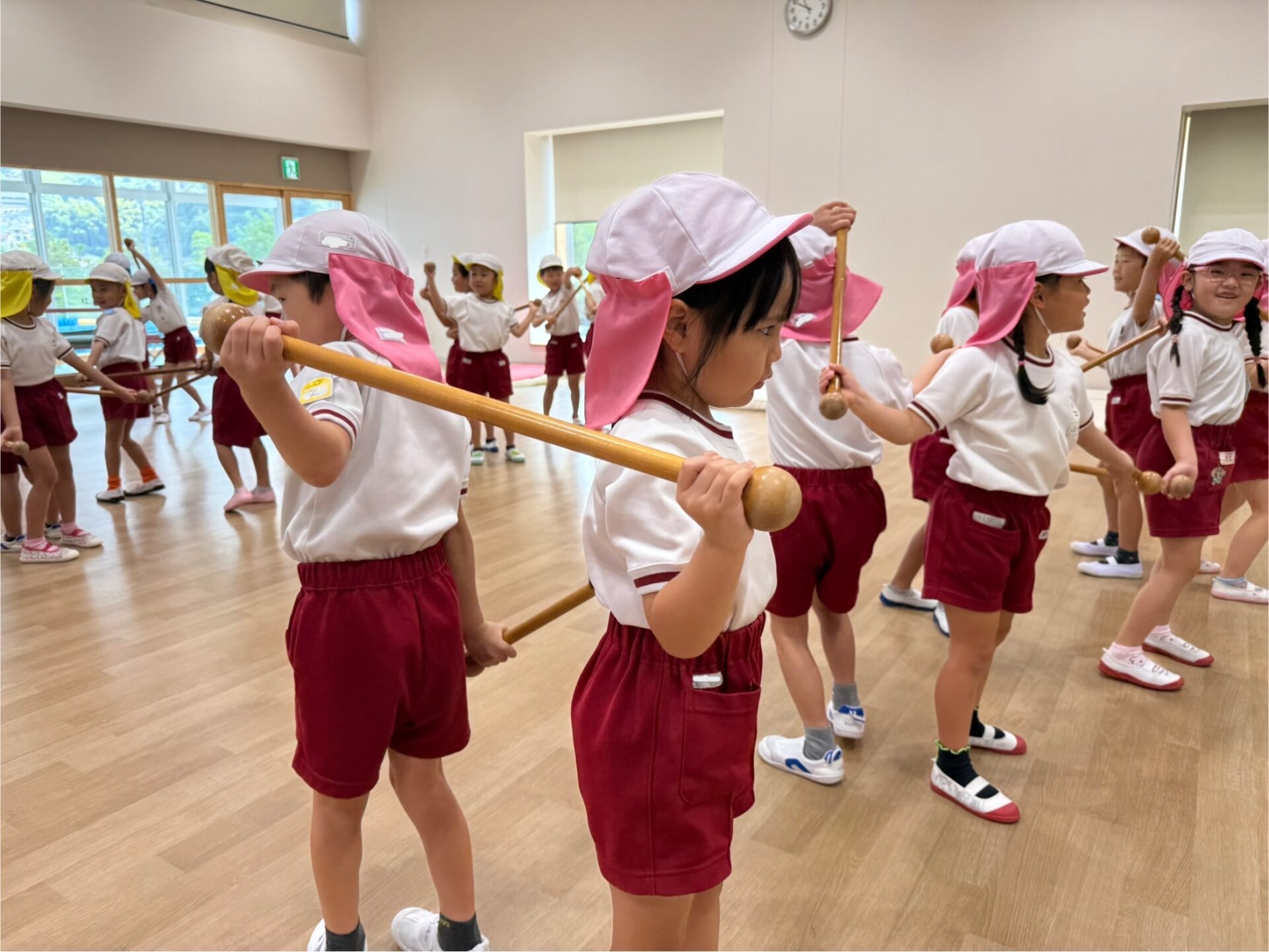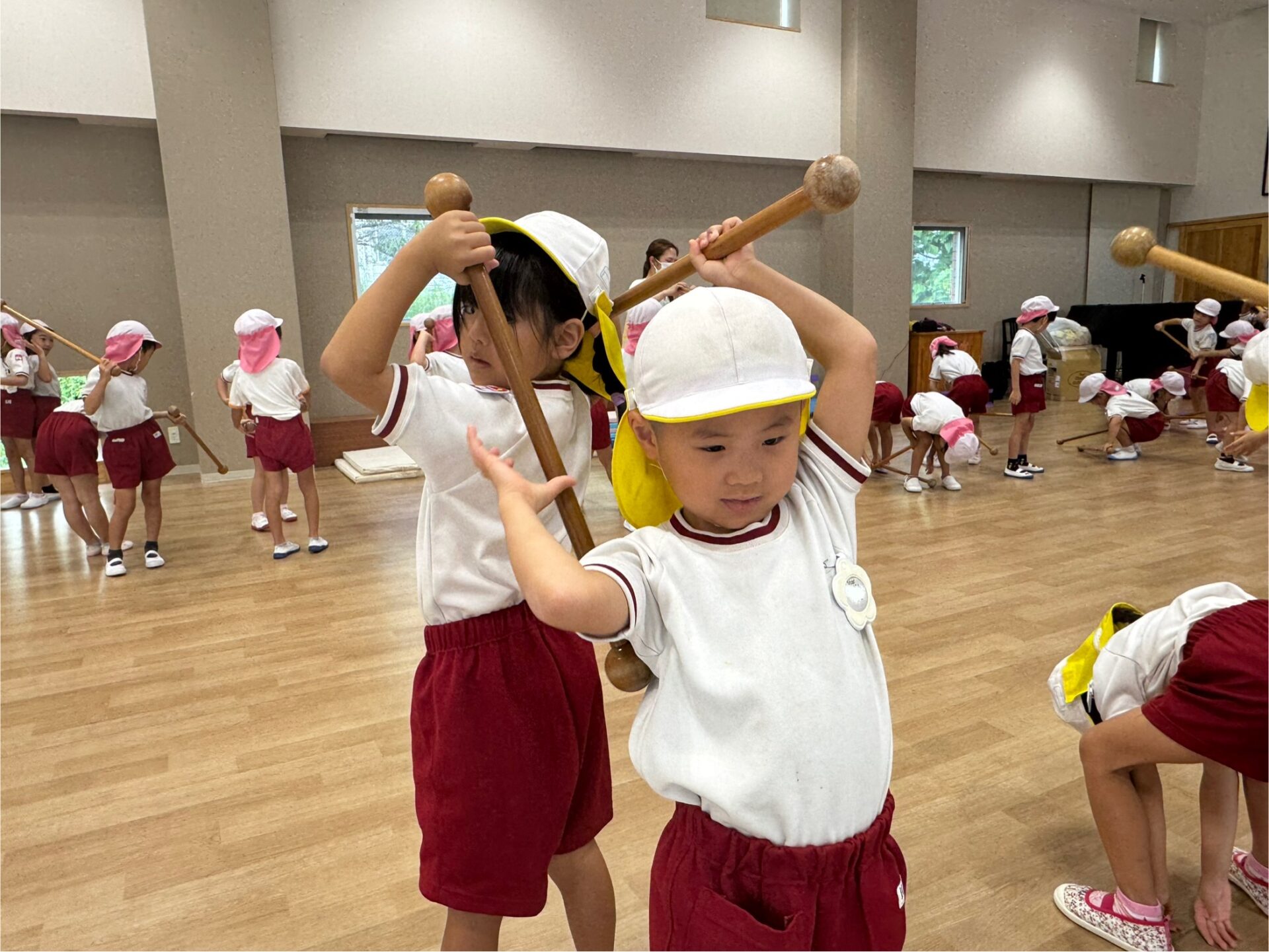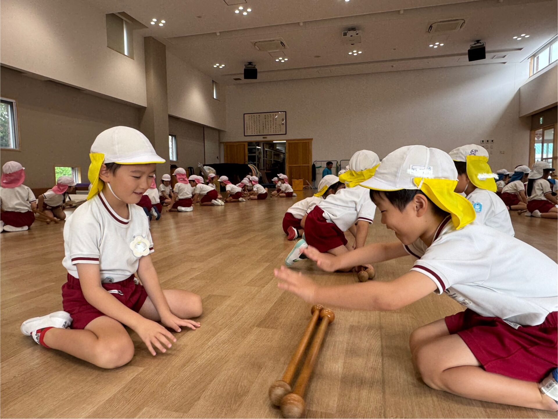 今日は棒体操の日!友達とペアになって、棒転がし。