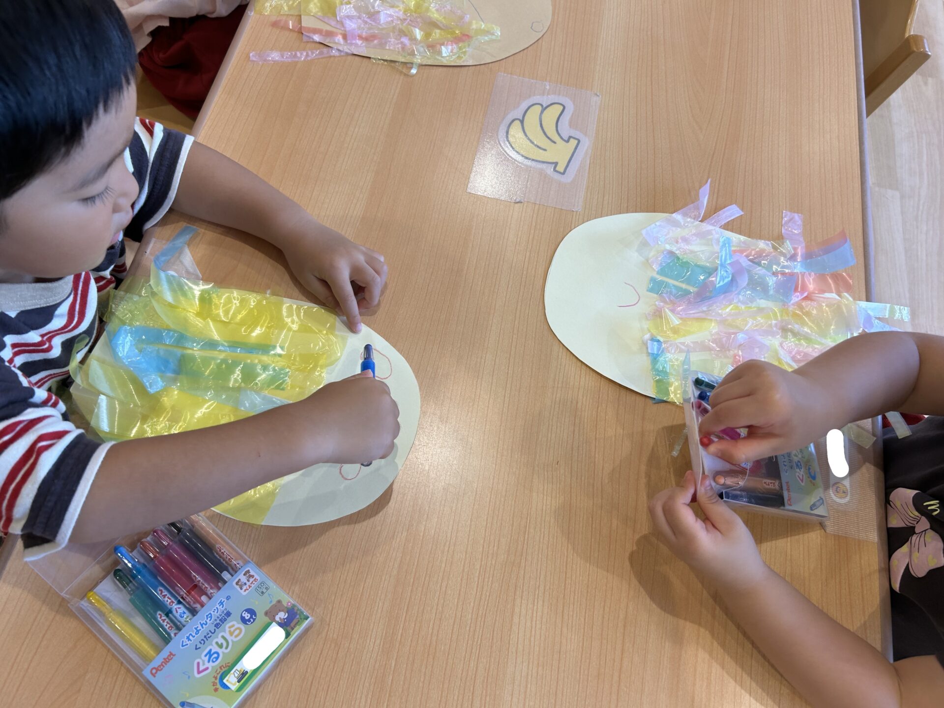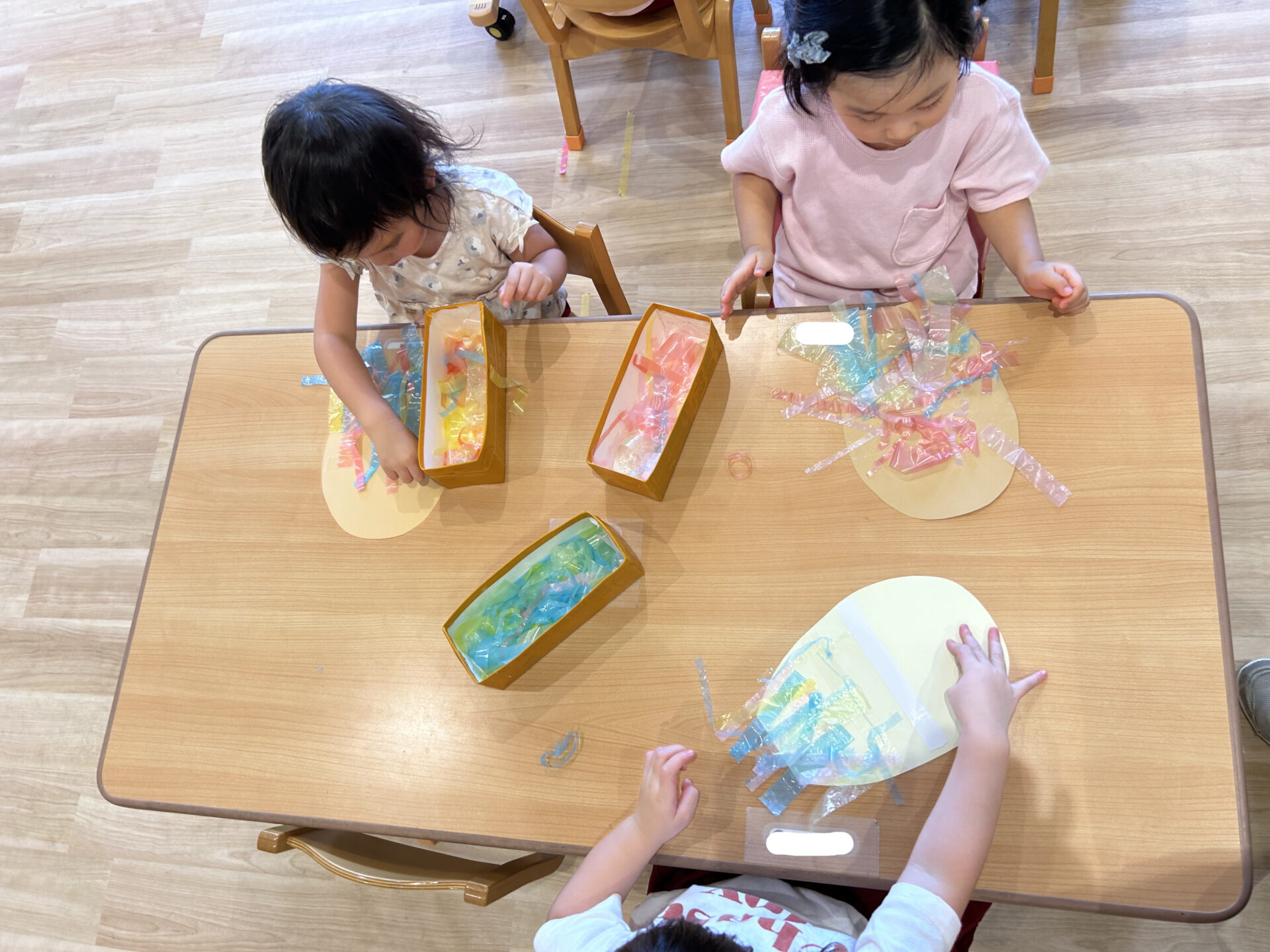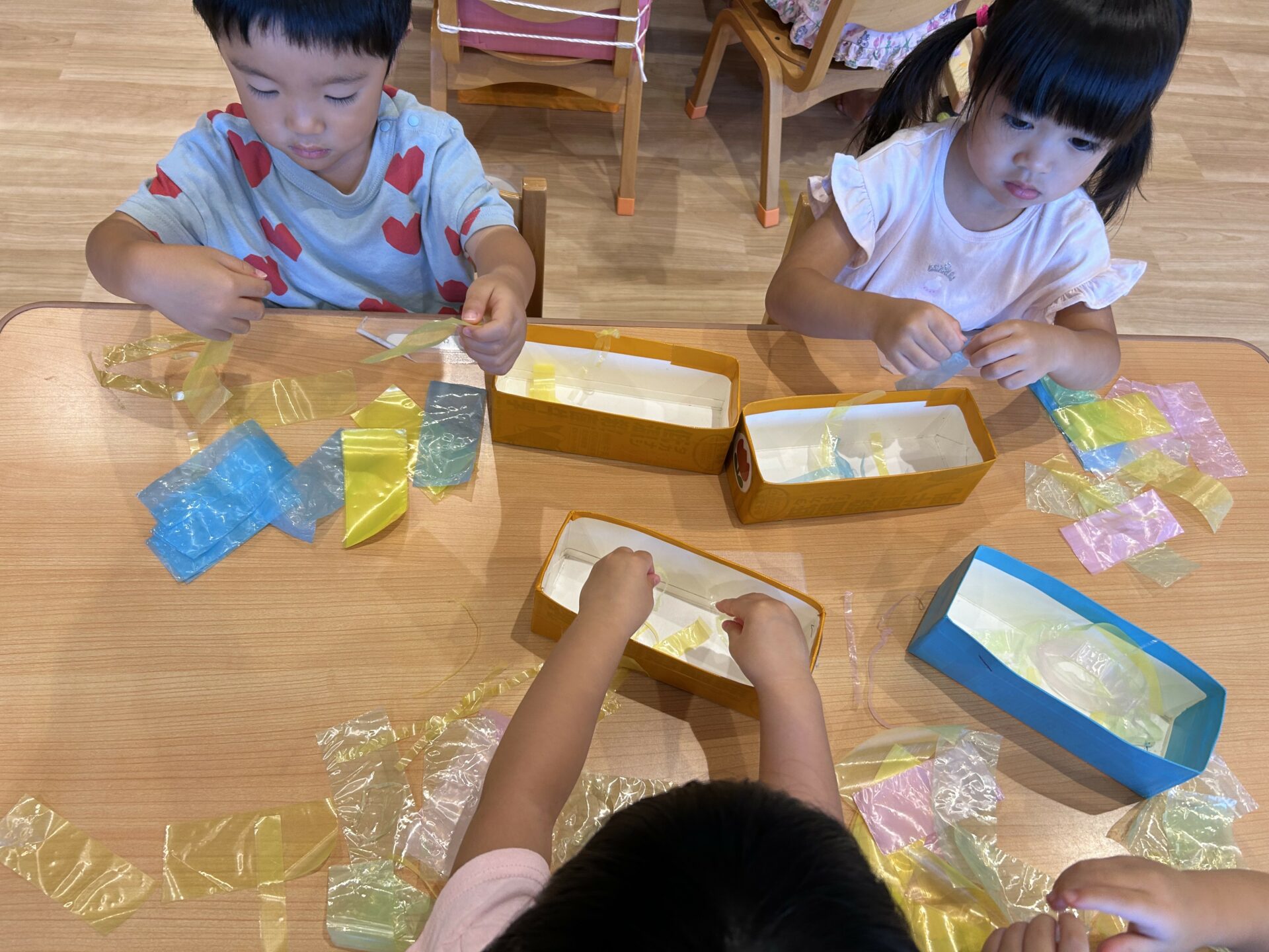 好きな色の画用紙を選び、裸のミノムシにスズランテープで服を着せてあげました。製作しながら「裸はかわいそうだよね」、「服着ないと寒いよね」「いろんな色できれいだね」と話が広がっていきました。スズランテープを細くビリビリと裂き、一列ずつ丁寧に貼りました。