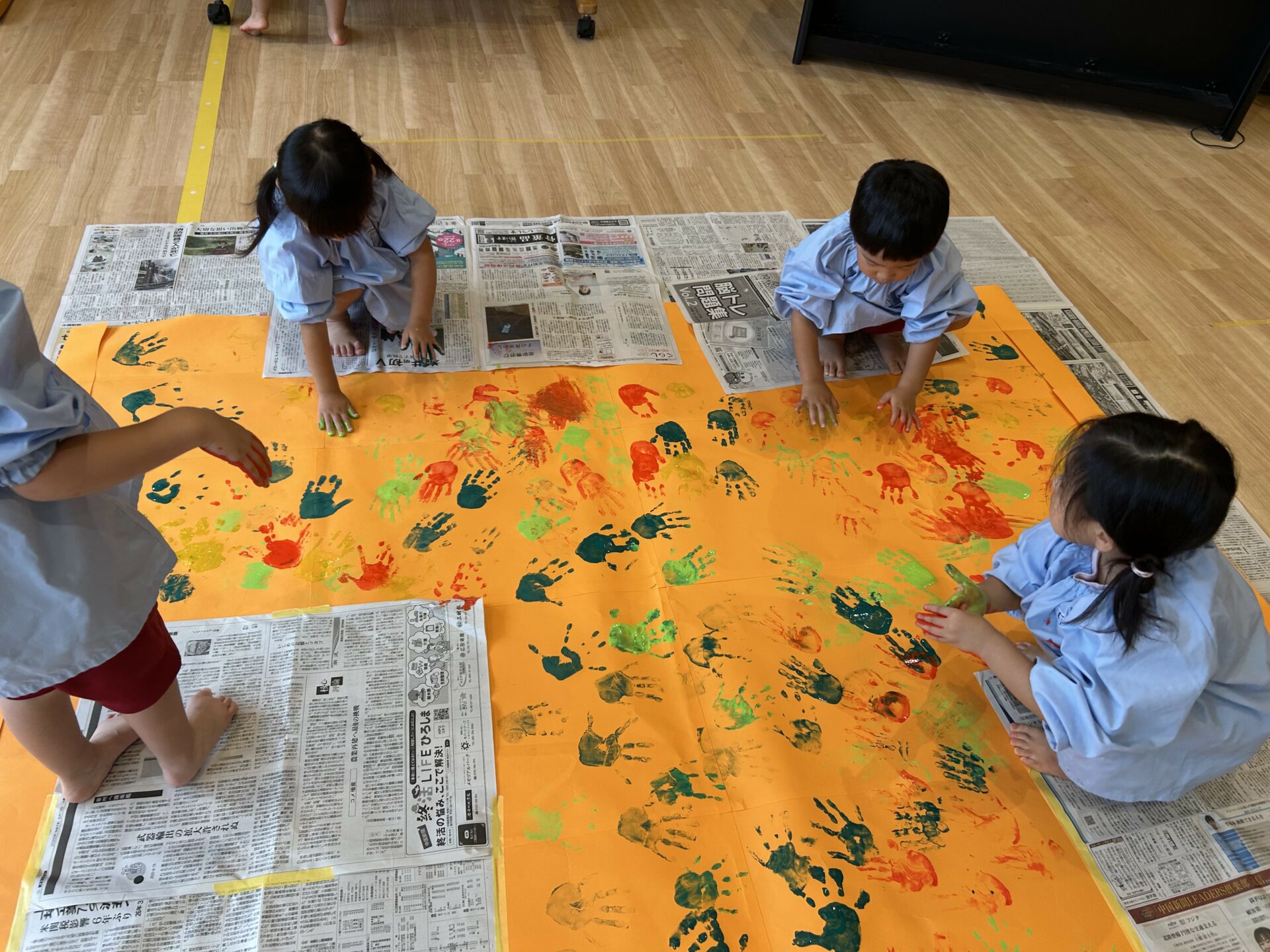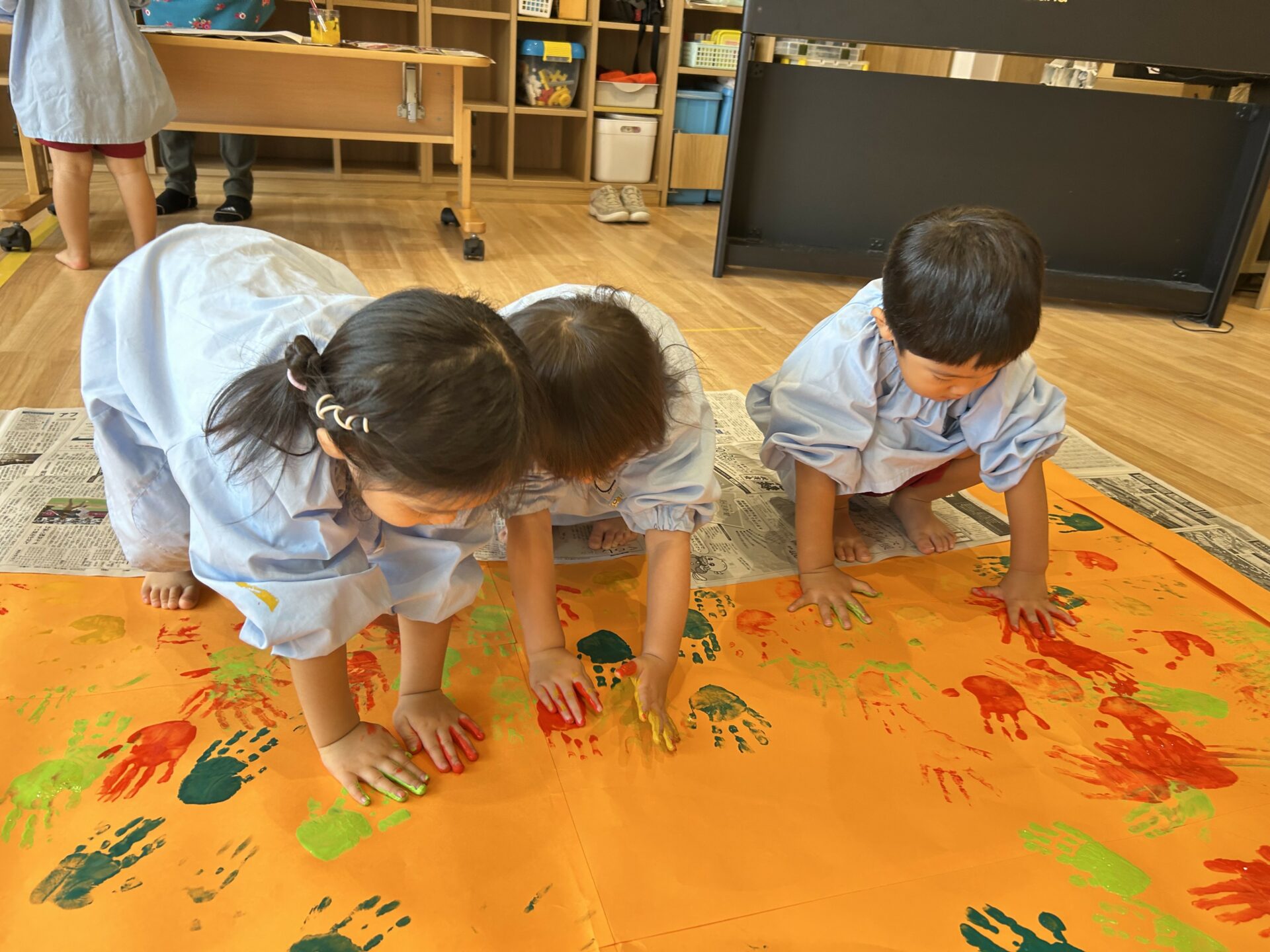 朱色・黄色・黄緑色・緑色などで葉っぱの色をイメージして手形を好きなところに付けました。だんだんと色づいていく様子に「いっぱいになったね」と喜ぶ姿が見られました。