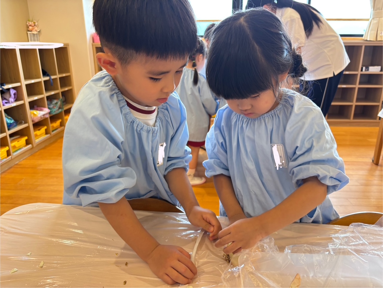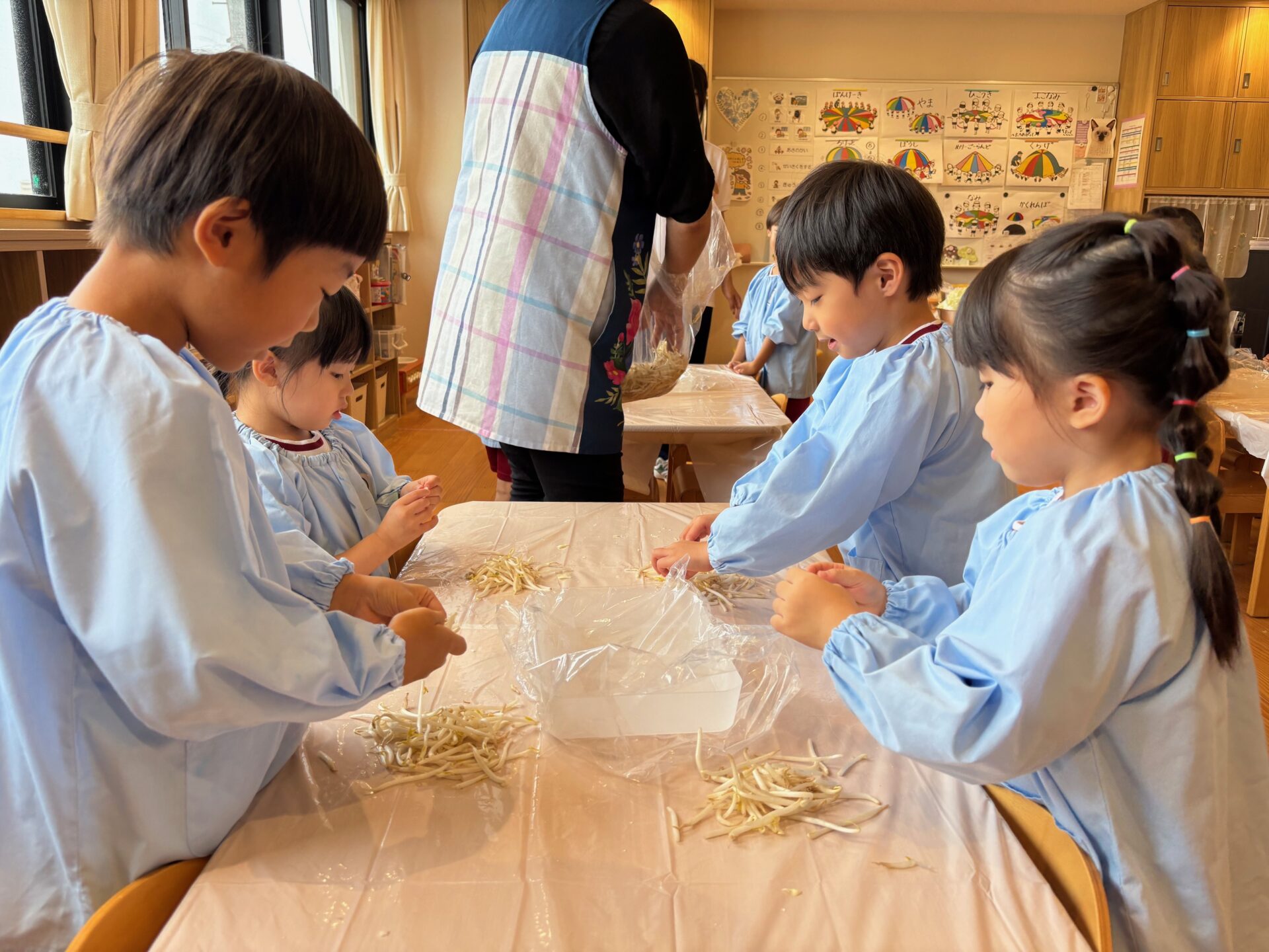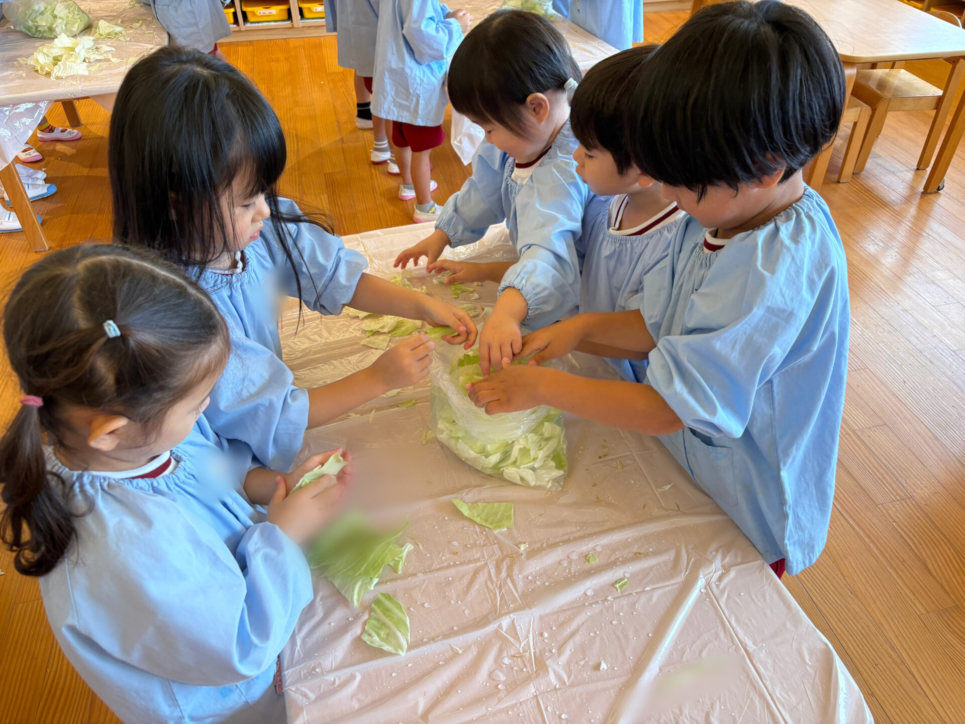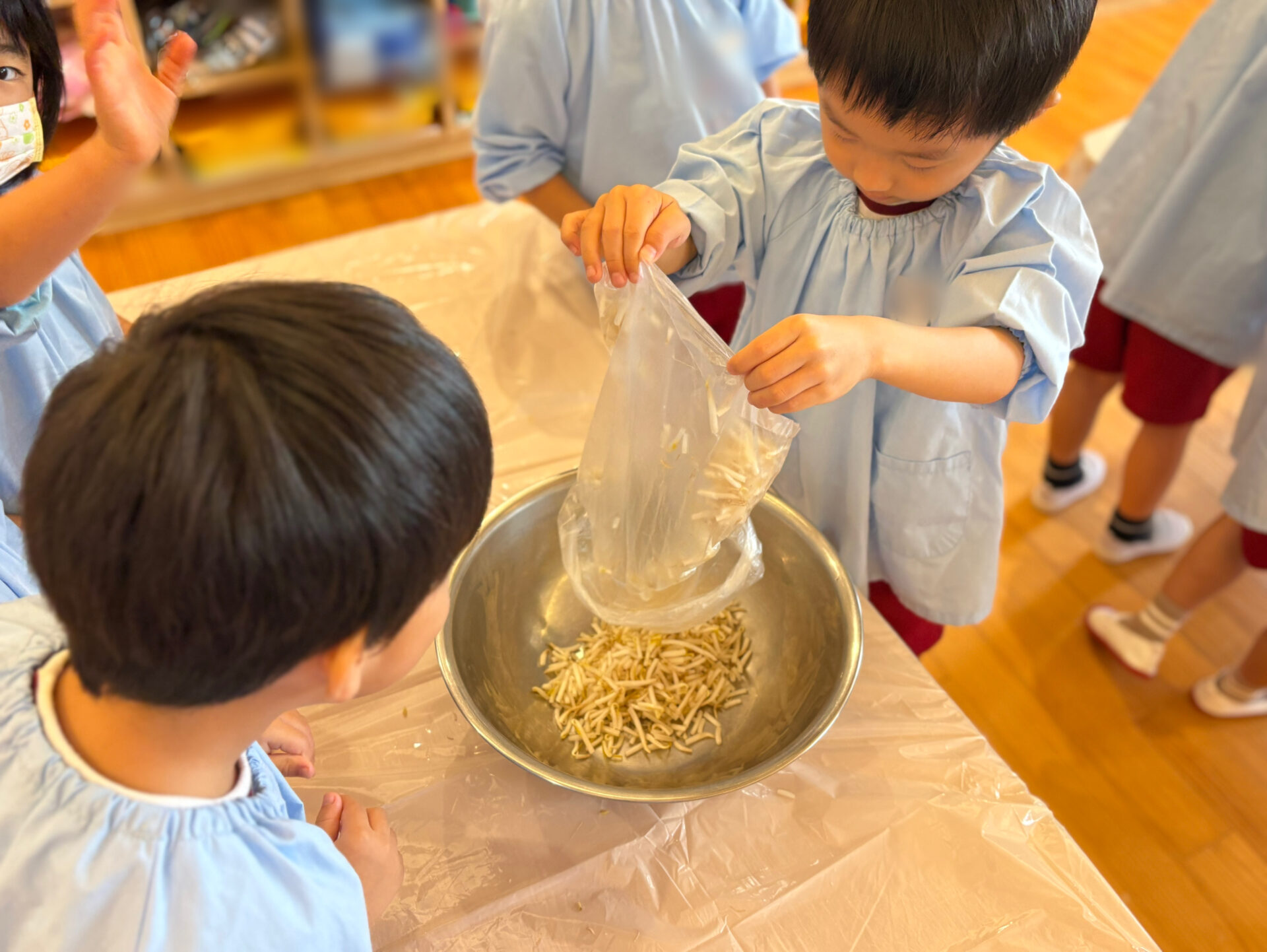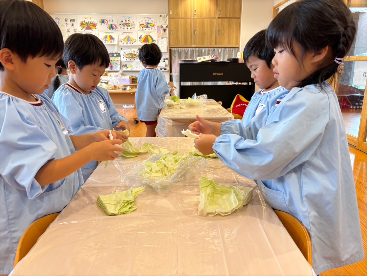 指先を上手に使いポキッと折ったり、ビリビリとちぎったりしながら、「おいしくなぁ〜れ!」と野菜に声をかける姿がとても微笑ましかったです。初めは、「むずかしいかな?」と戸惑う子もいましたが、やってみると夢中になり、「もっとやりたい!」と友達と協力しながら取り組みました✨