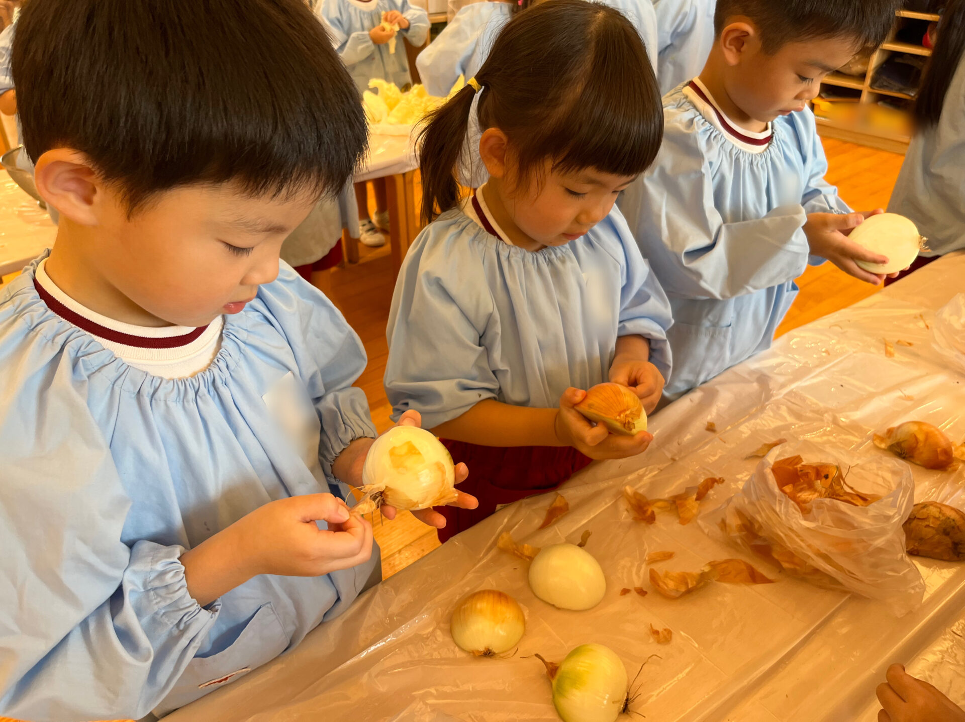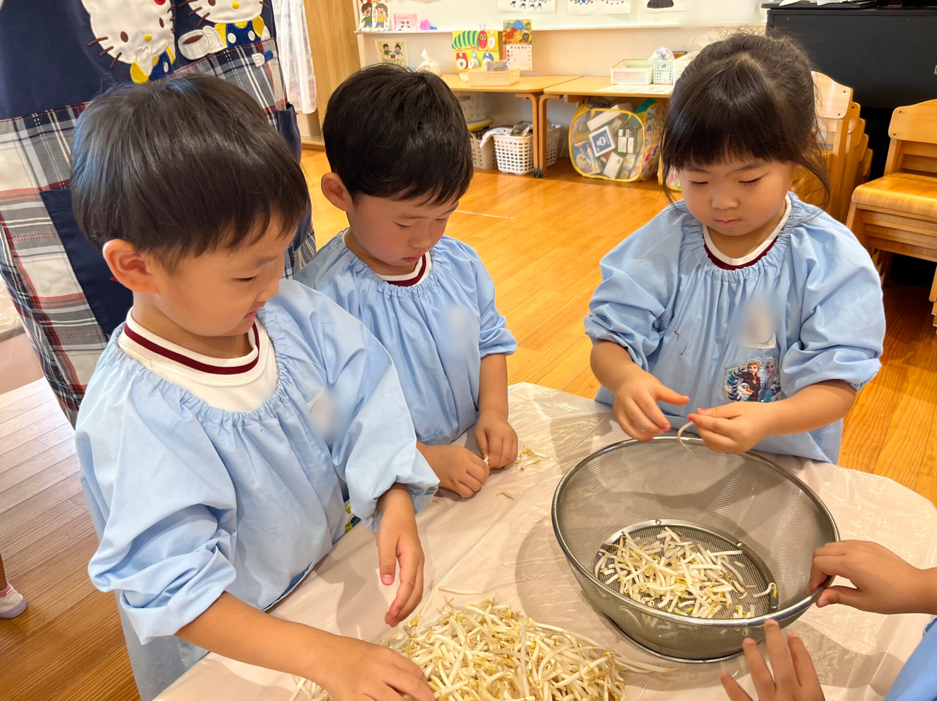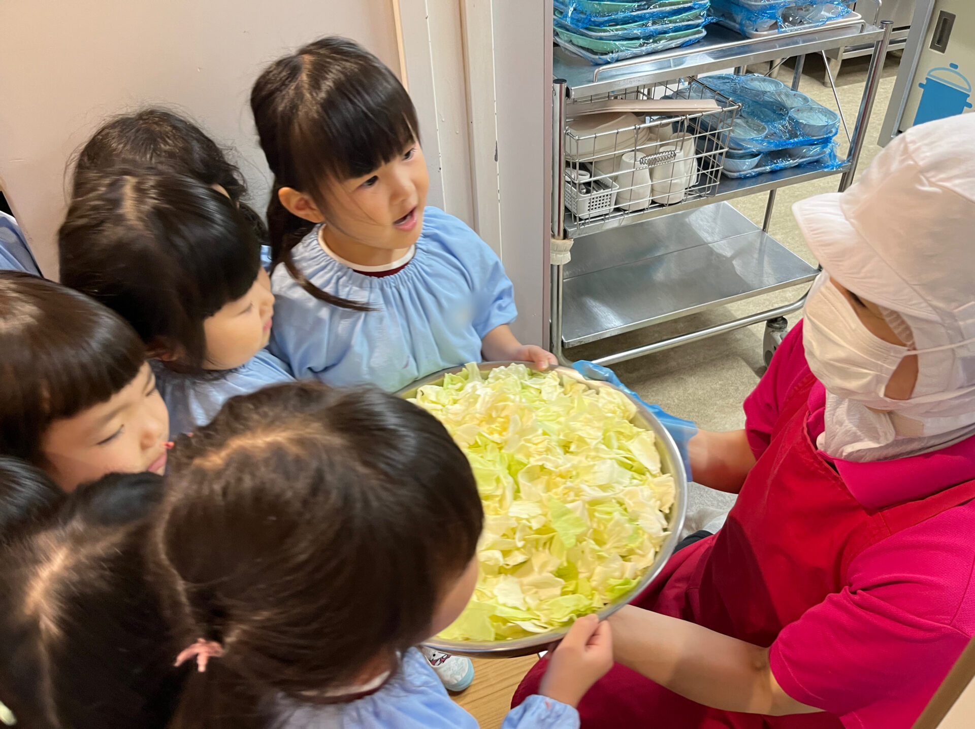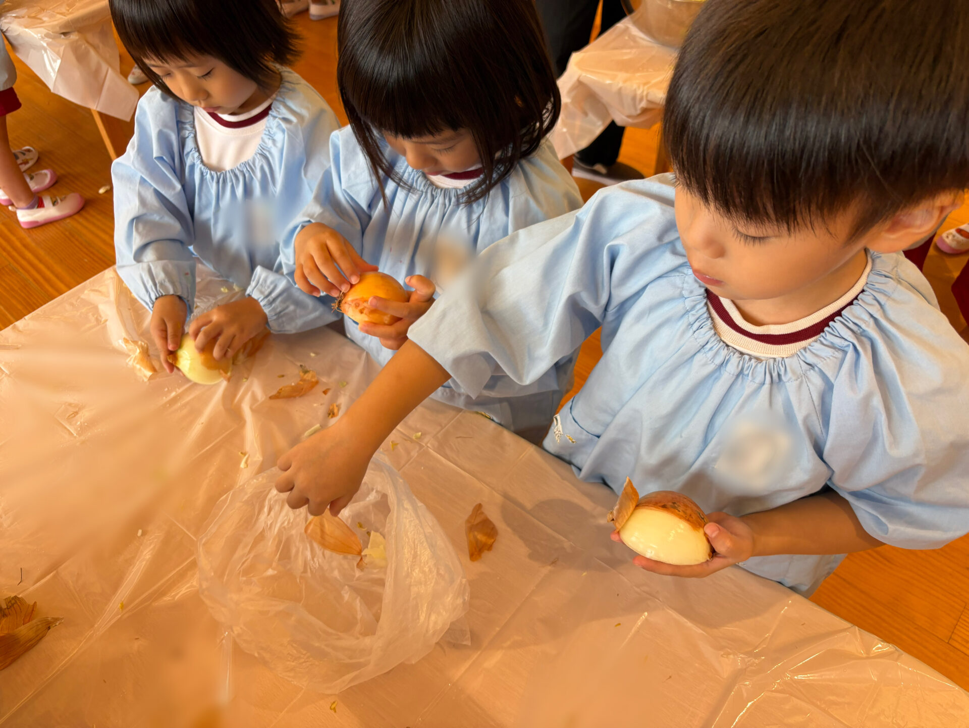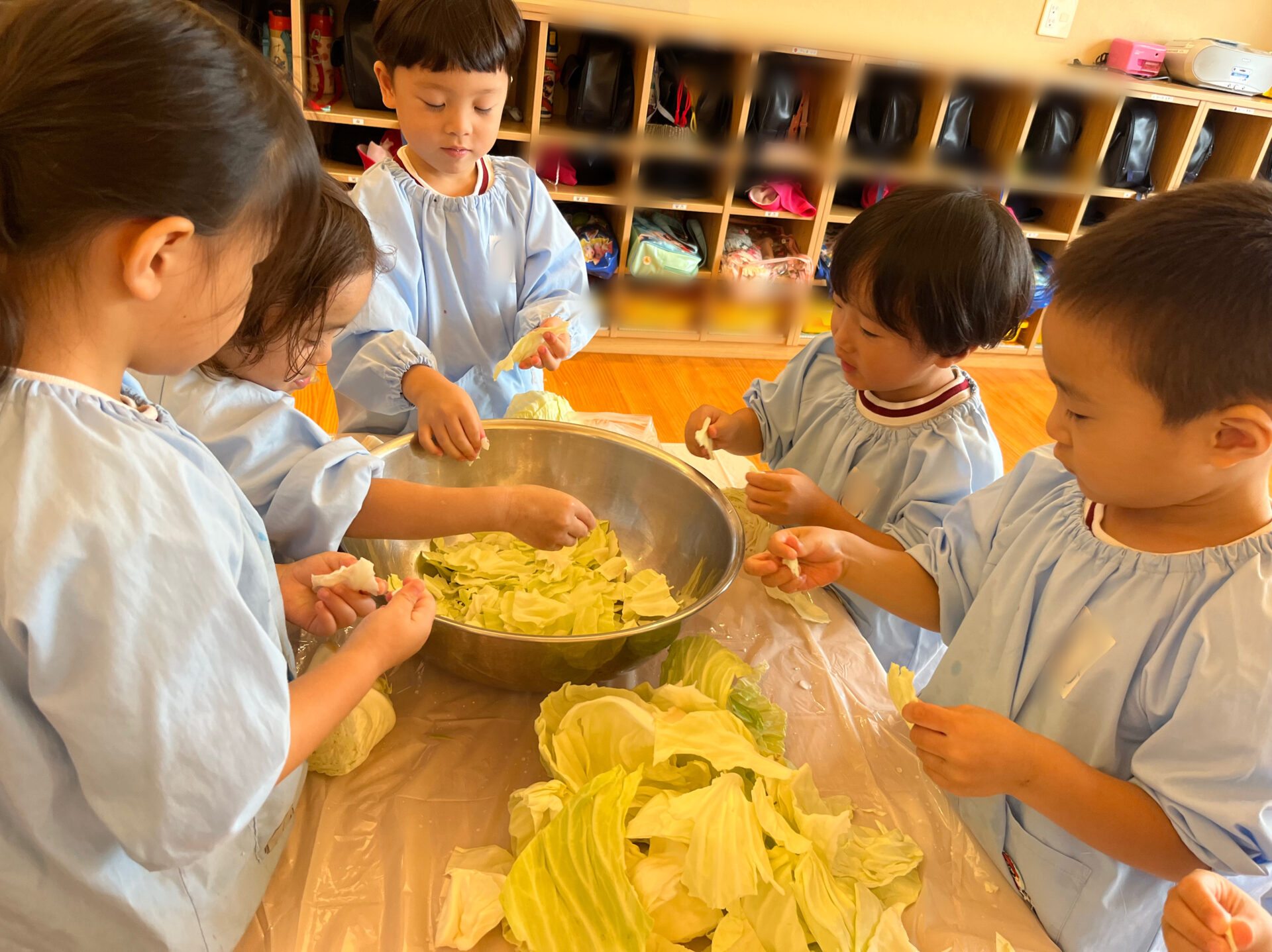 指先を上手に使いポキッと折ったり、ビリビリとちぎったりしながら、「おいしくなぁ〜れ!」と野菜に声をかける姿がとても微笑ましかったです。初めは、「むずかしいかな?」と戸惑う子もいましたが、やってみると夢中になり、「もっとやりたい!」と友達と協力しながら取り組みました✨