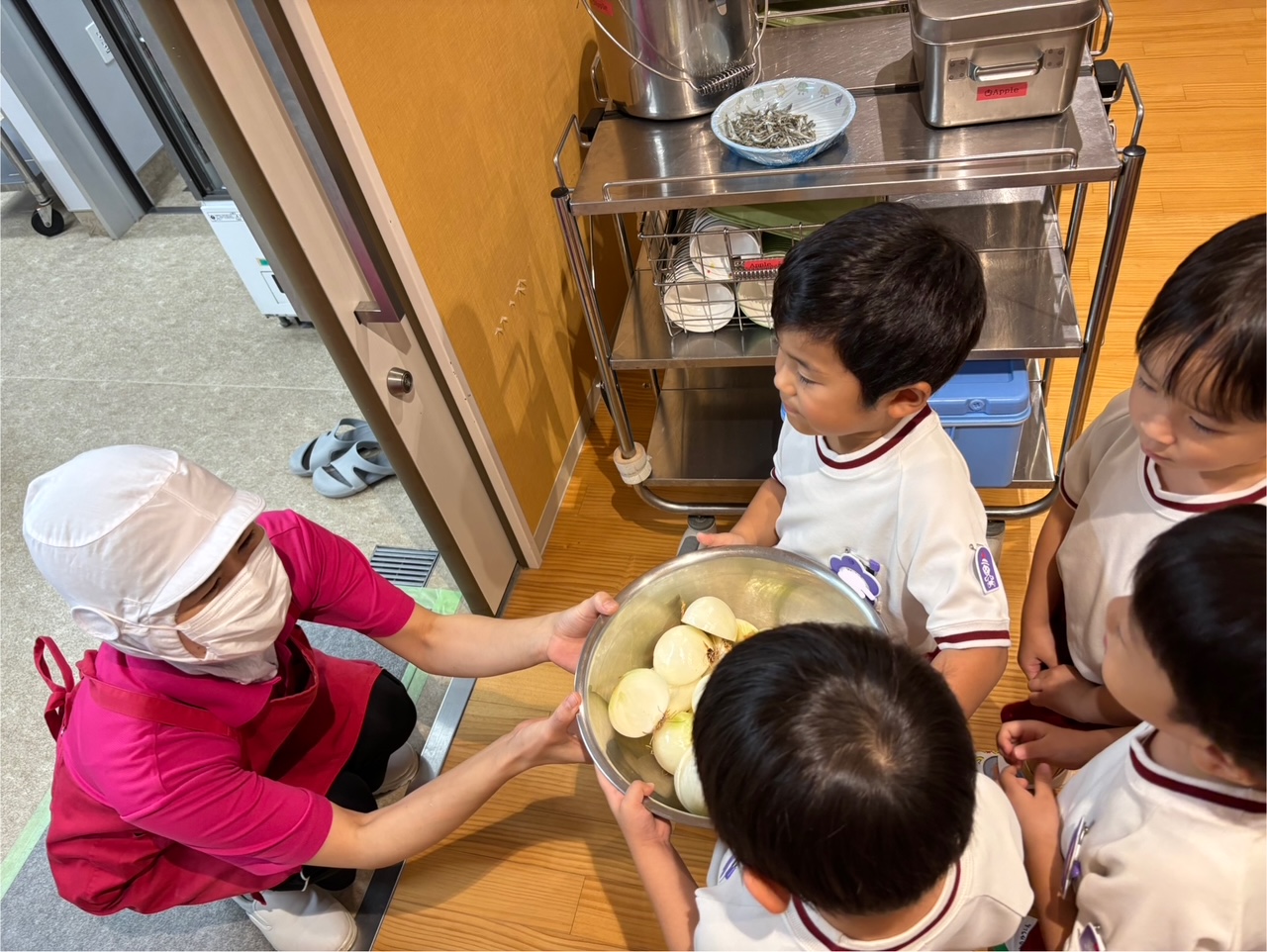 出来上がった野菜を給食室に持っていくと給食の先生から「ありがとう!」と声をかけてもらいとても嬉しそうな表情でした。「自分が手伝った野菜が給食に入っている」と思うことで、給食をより楽しみにし、食べる喜びや感謝の気持ちを感じることが出来ています。