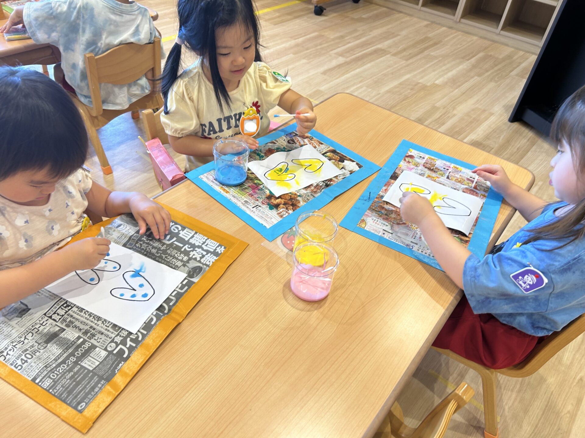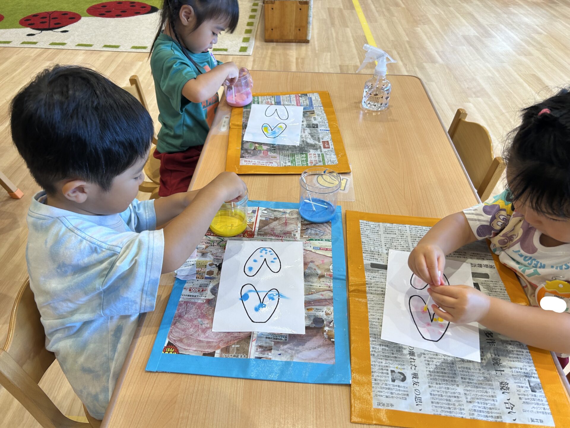 霧吹きで濡らした画用紙に絵の具を綿棒でちょんちょんすると色がじゅわーっと広がりました。色がじゅわーっと広がると、「見てみて!」と嬉しそうな姿が見られました。