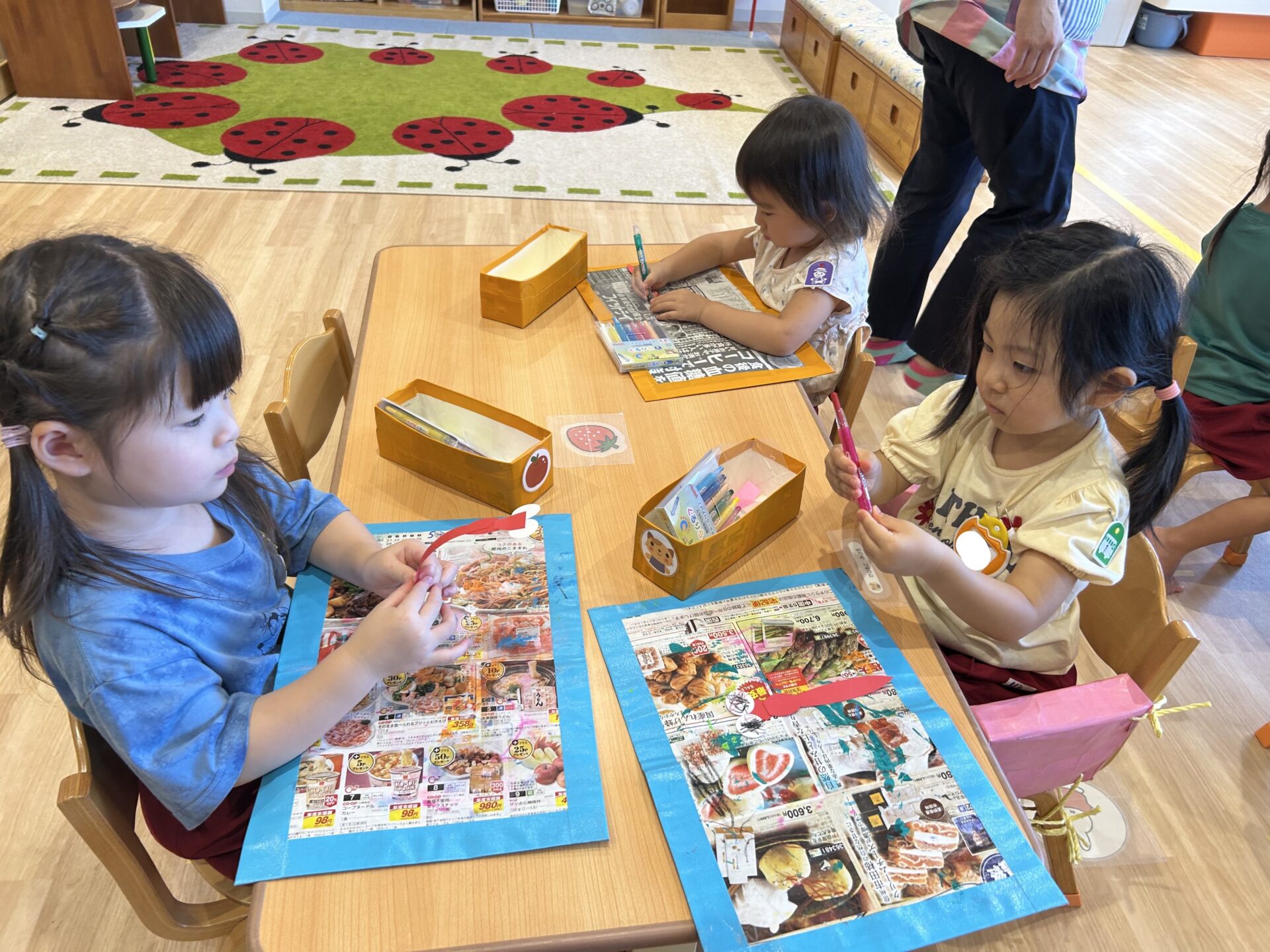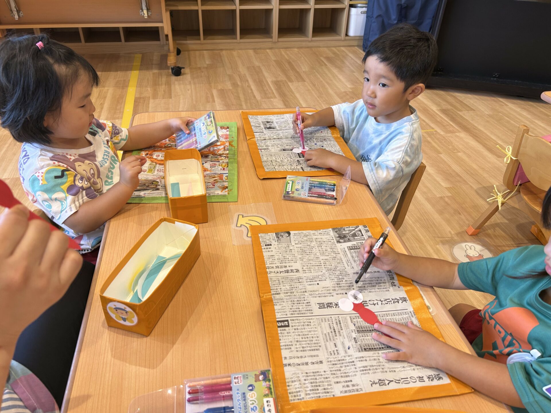 今日はとんぼの製作をしました。目と羽のない赤とんぼにくるりらと絵の具を使って製作をしました。