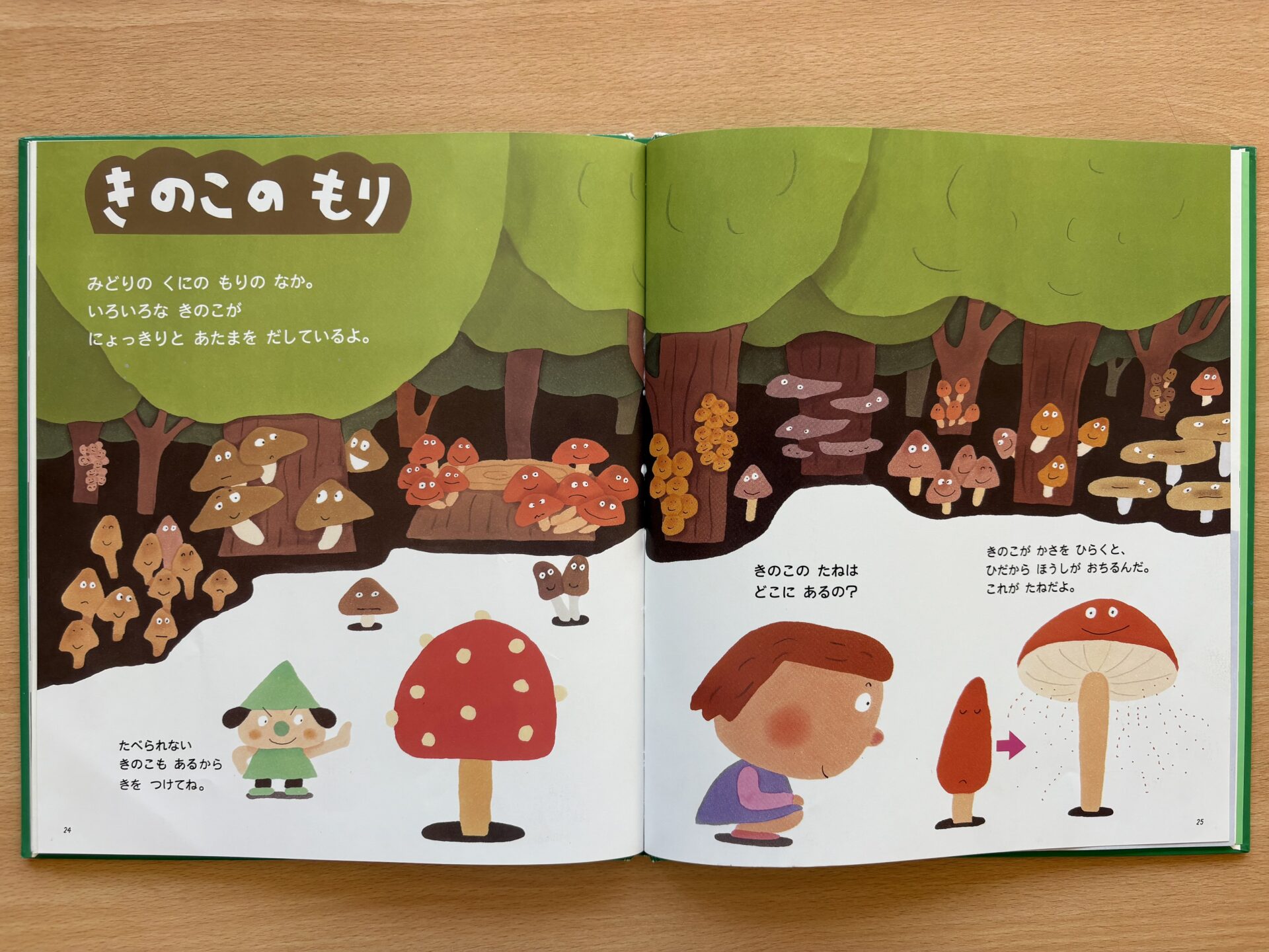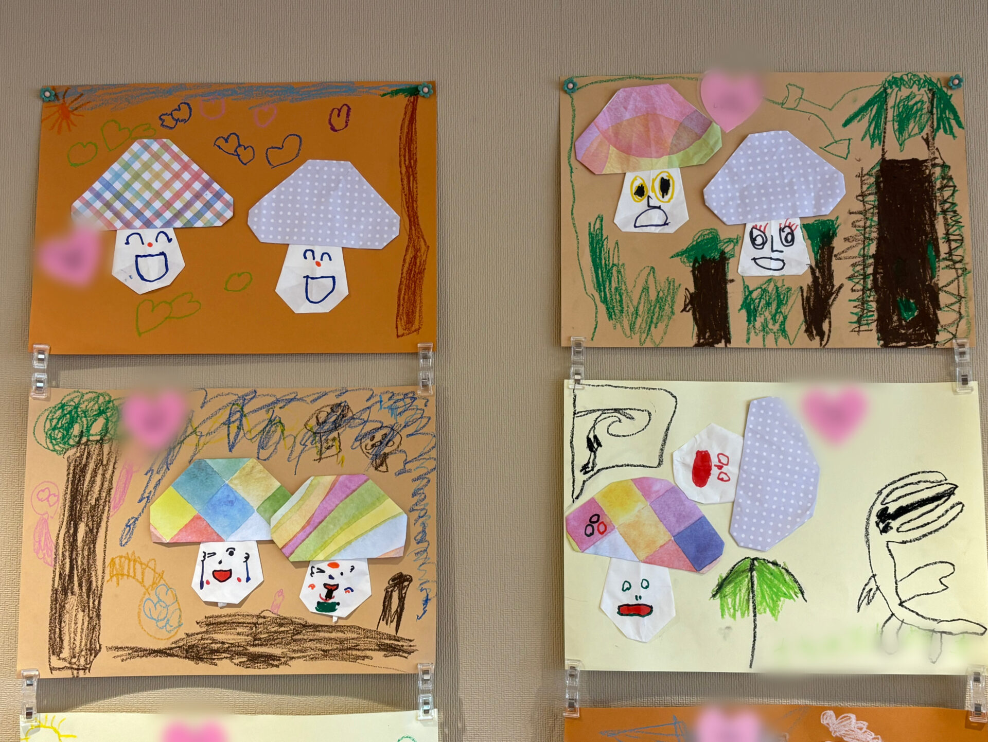 少しずつ秋🍁を感じながら森の絵を描く園児👦👧!きのこは、体を病気から守ってくれる食べ物で食品群の緑の仲間ということを知り、給食に登場する『きのこ類』にも関心をもっている園児👦👧!