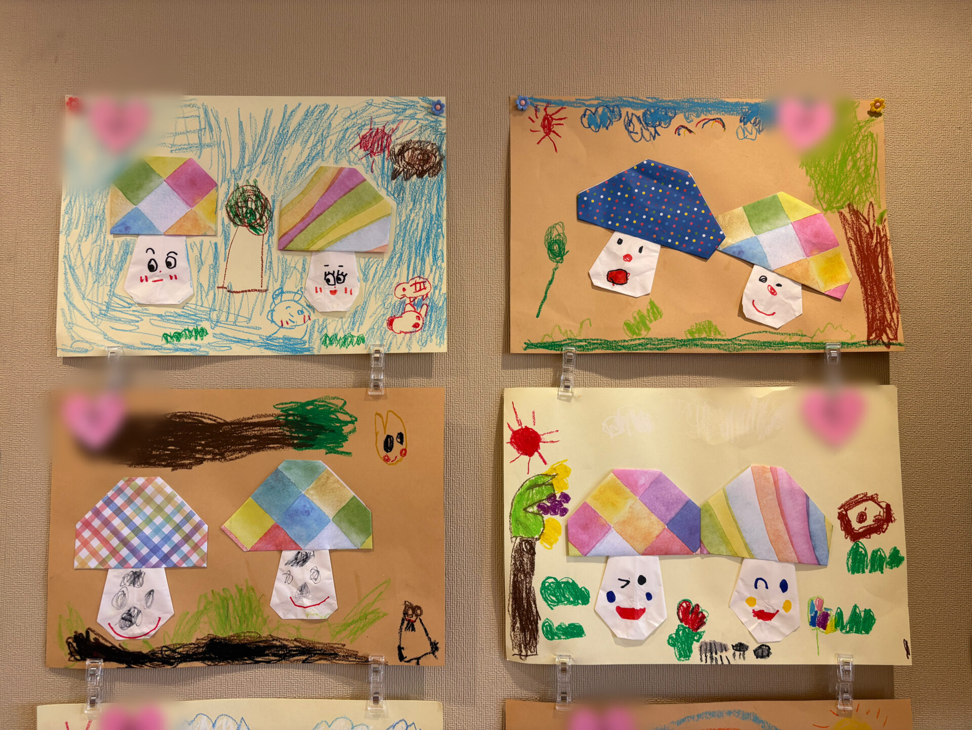 園児は、好きな柄の折り紙を選び、折り紙を丁寧に折って形を整えていました。製作をしながら「森の中にあるかな?」、「きのこって美味しいよね!」、「食べられないきのこもあるよ。」と話が広がり、食べ物や自然への関心も深まっている様子が見られました。