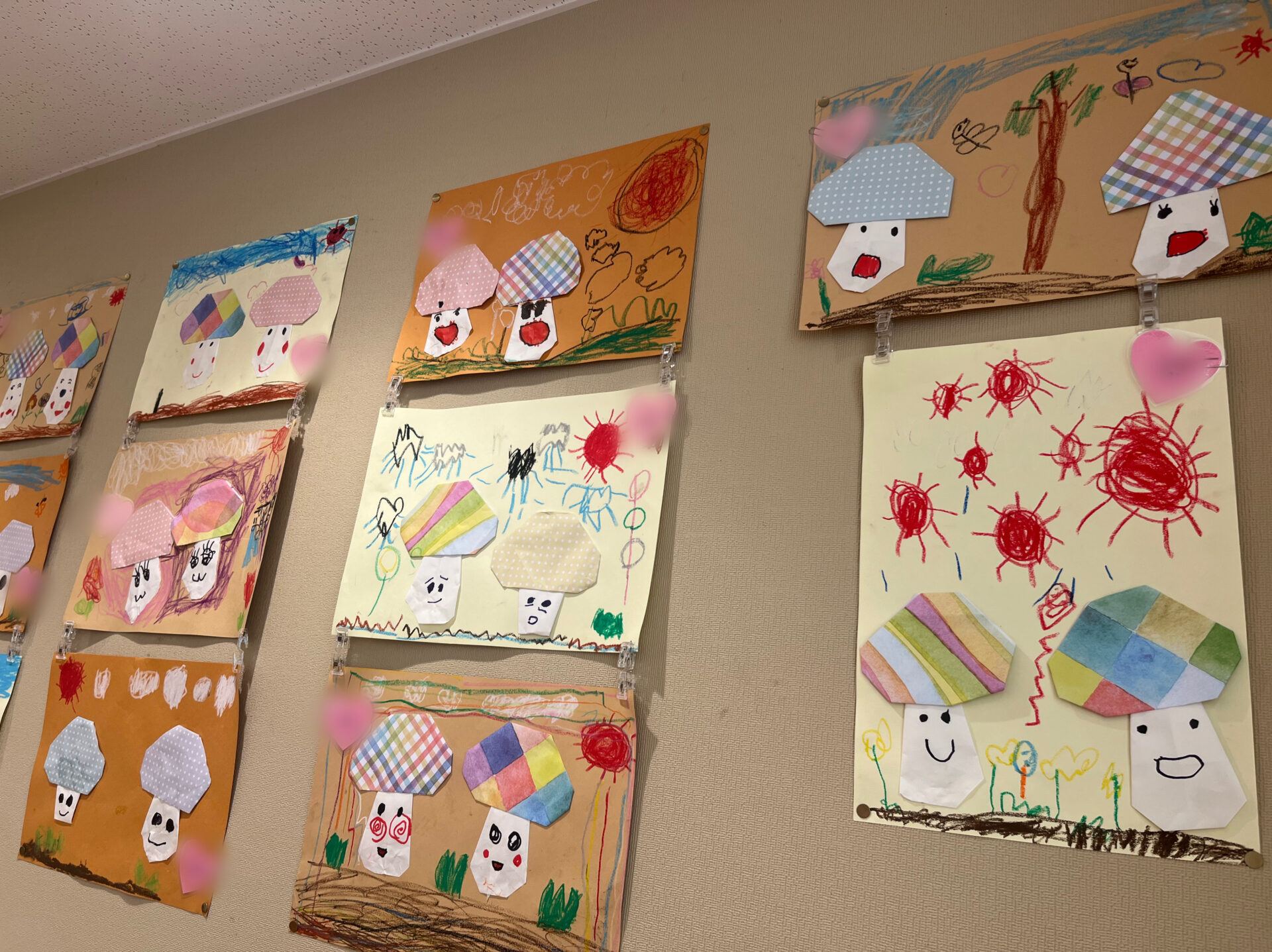 マジックで顔を描き、最後にクレパスで絵を描きました。とても可愛いきのこワールドの完成です。