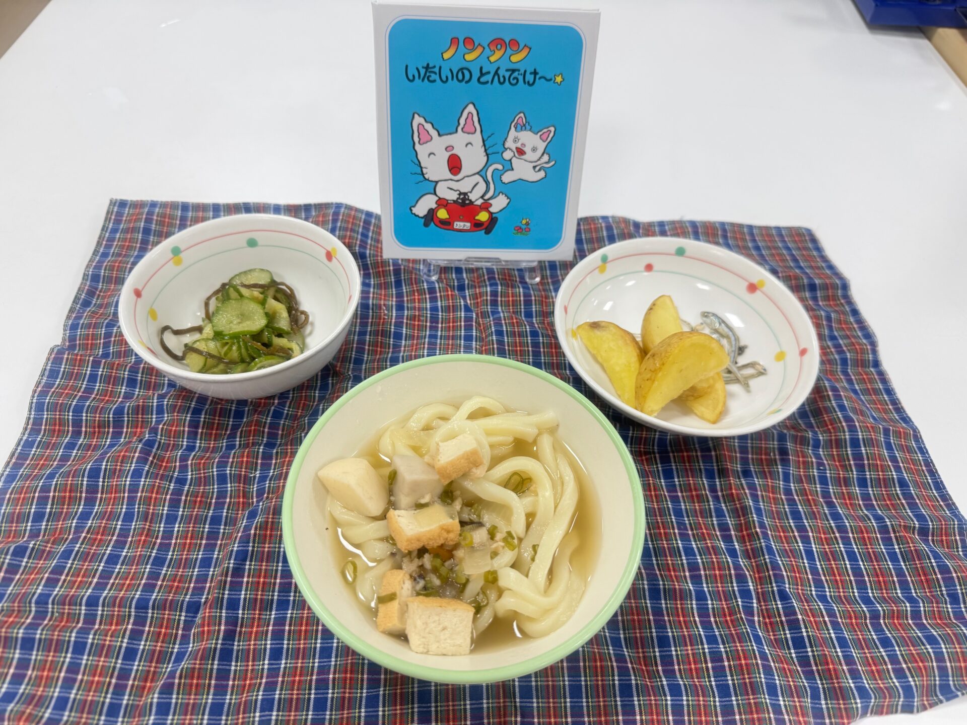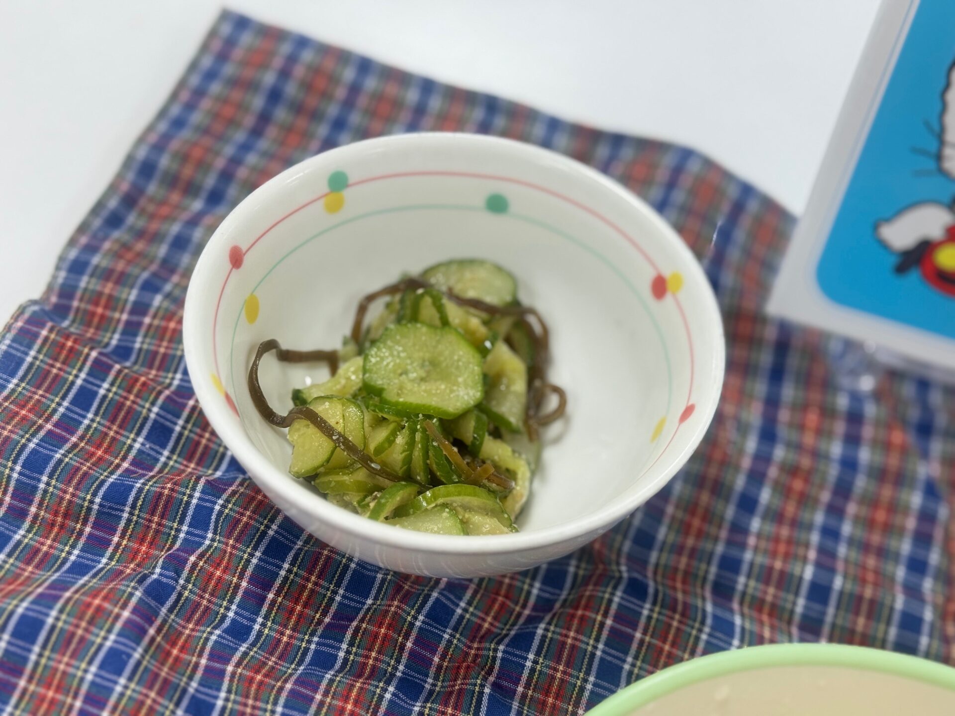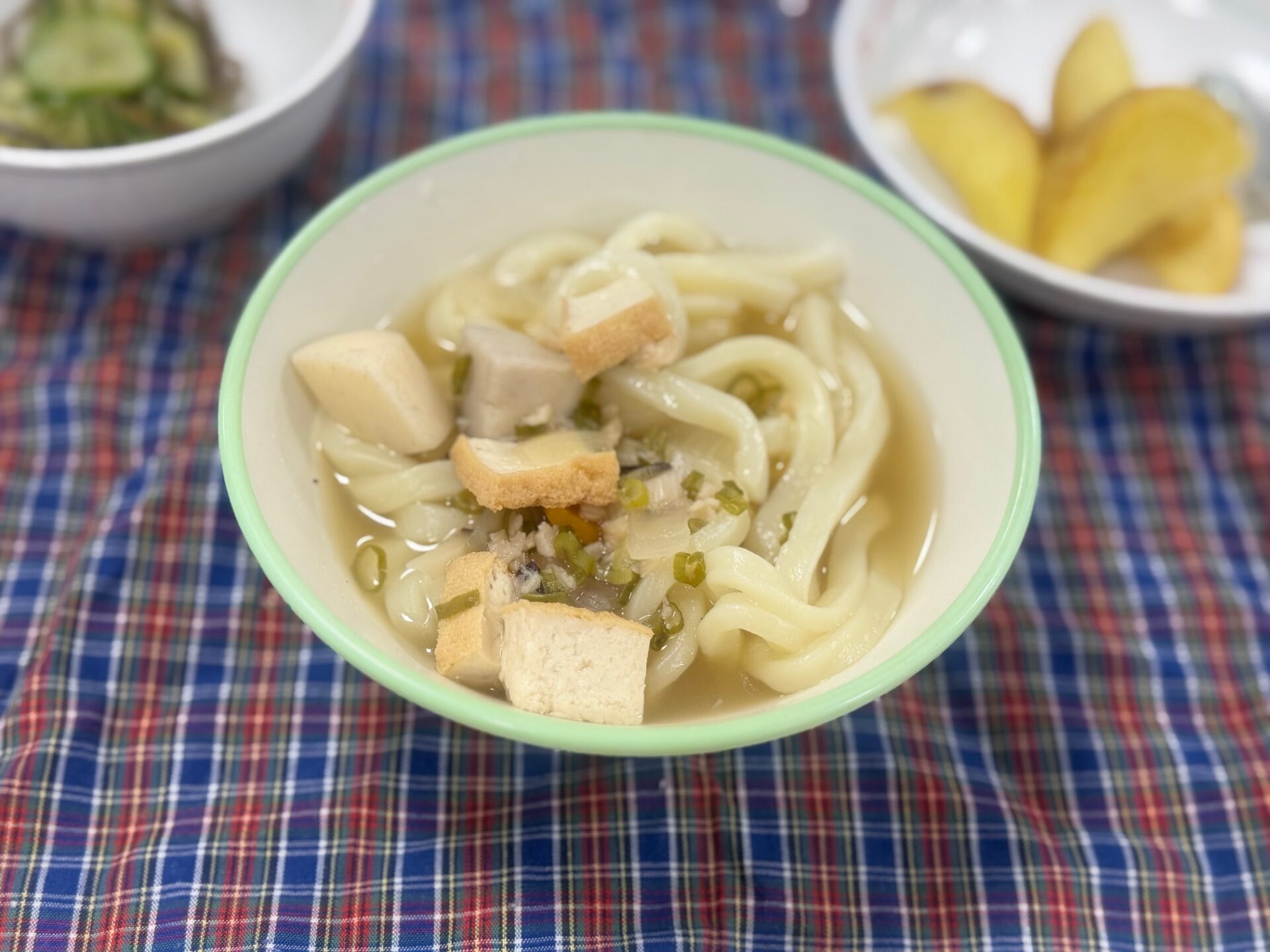 里芋、大豆ミンチ、厚揚げ、椎茸等の美味しいだしで栄養豊かな田舎うどんを食べました。🥒きゅうりの昆布和えはさっぱり味でした。