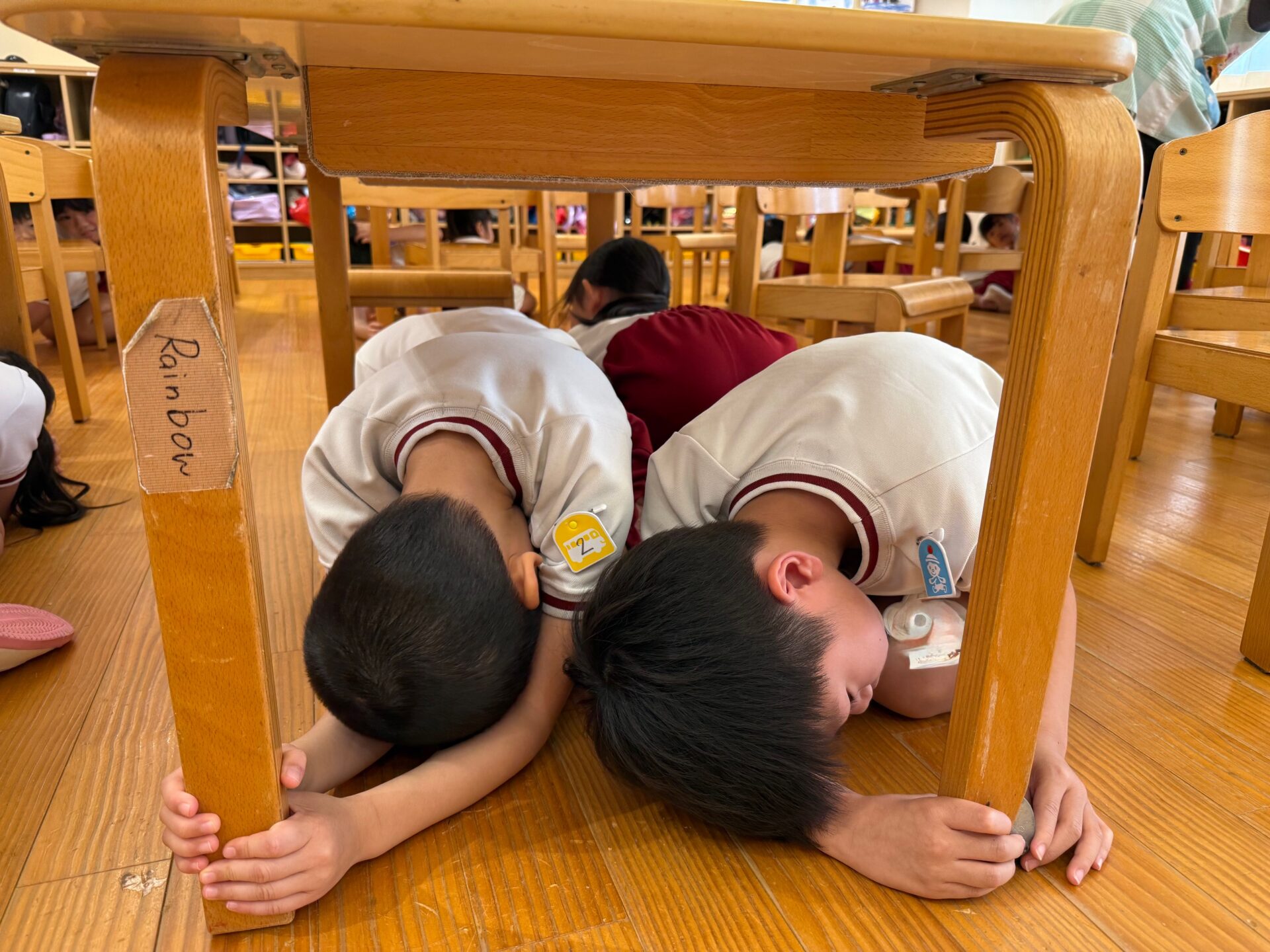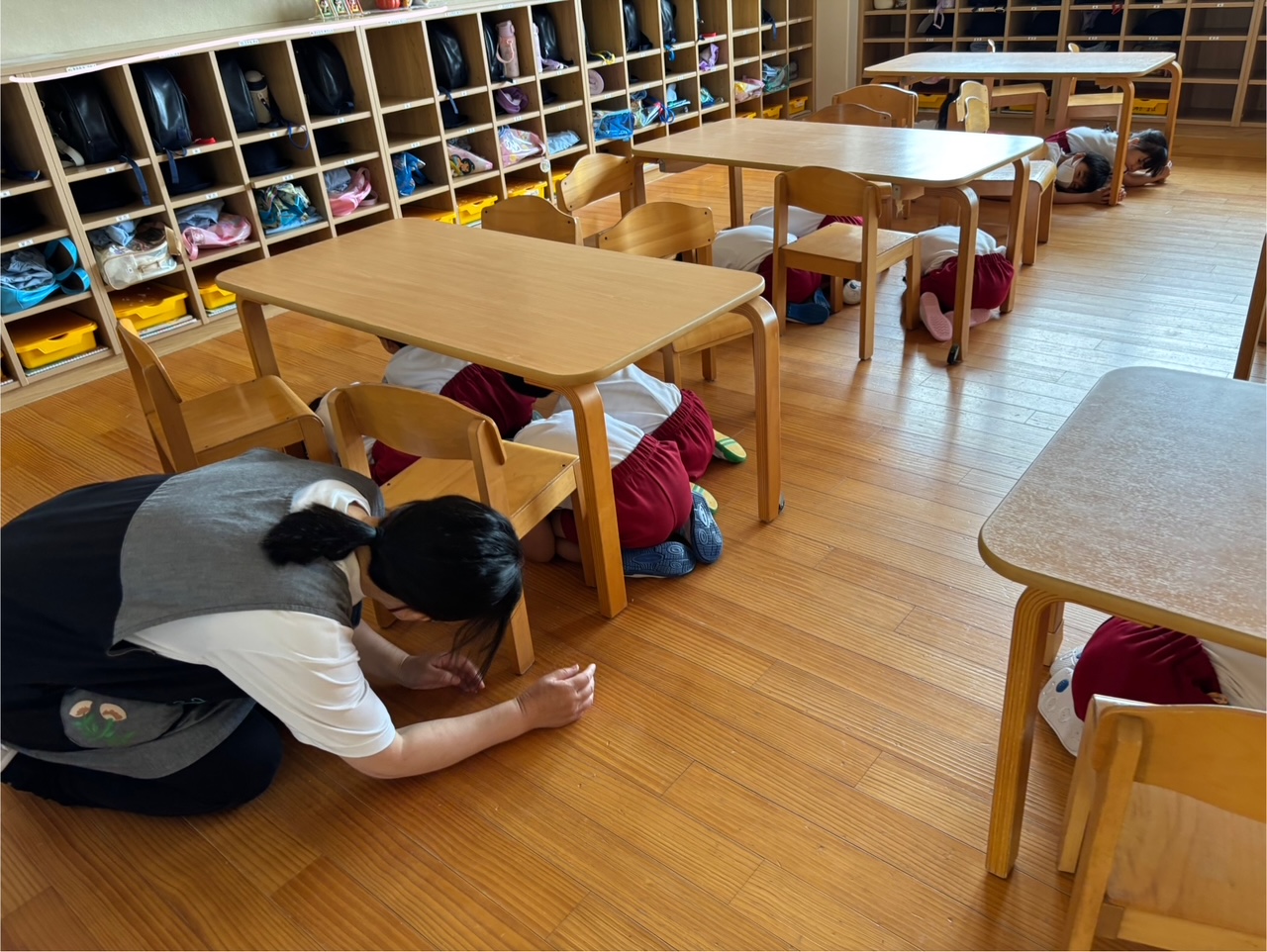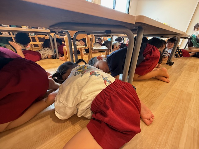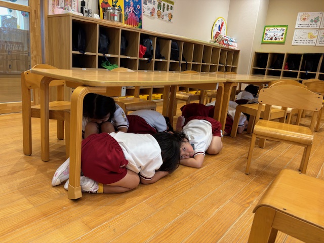 先日、地震の避難訓練を行いました。地震発生の放送が流れると机の下などに入り『ダンゴムシポーズ』になり頭を守る園児たち・・・。