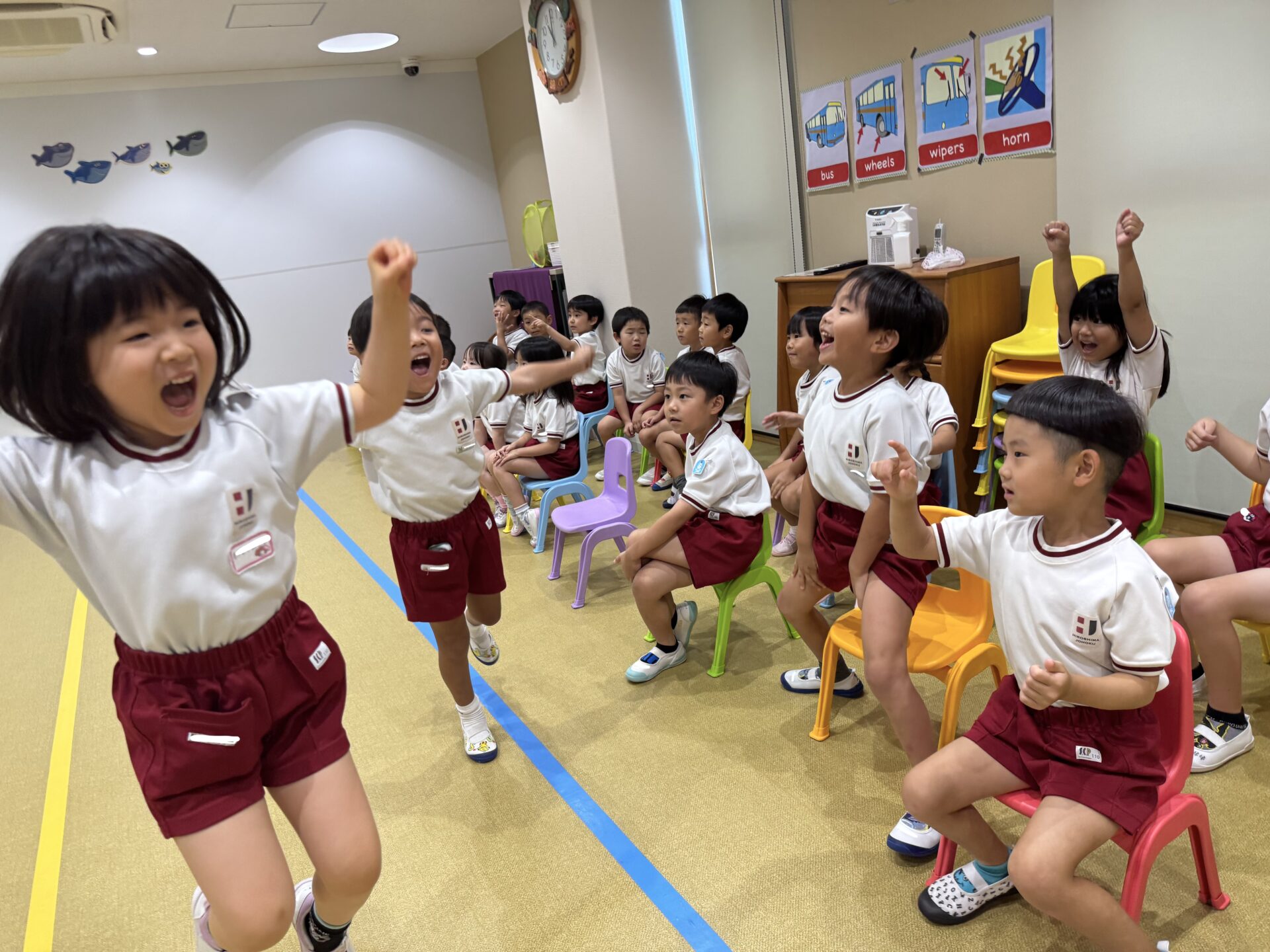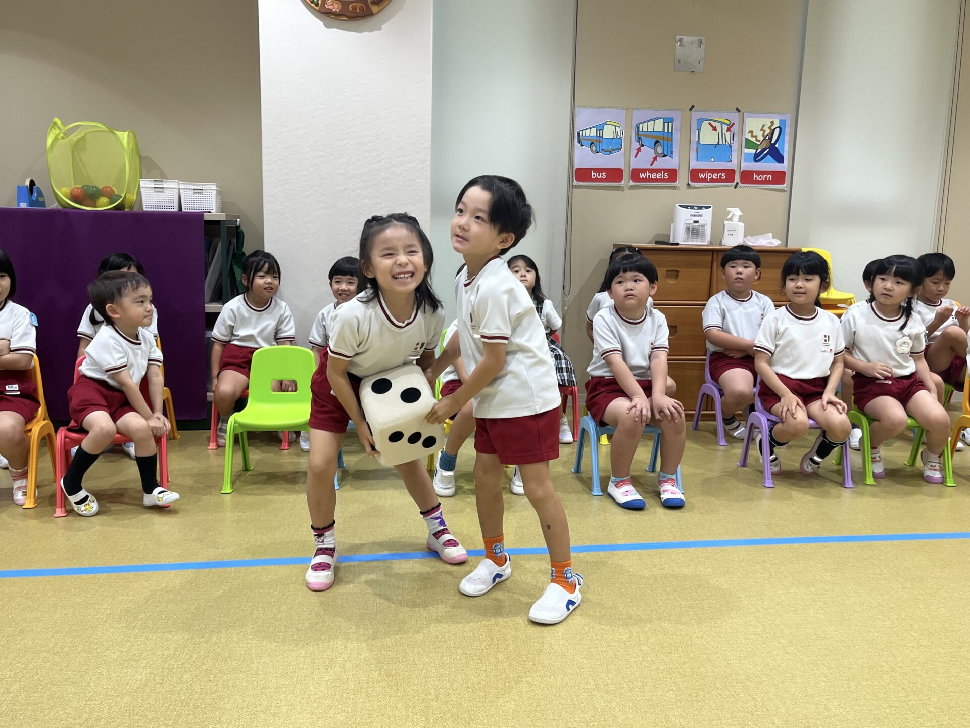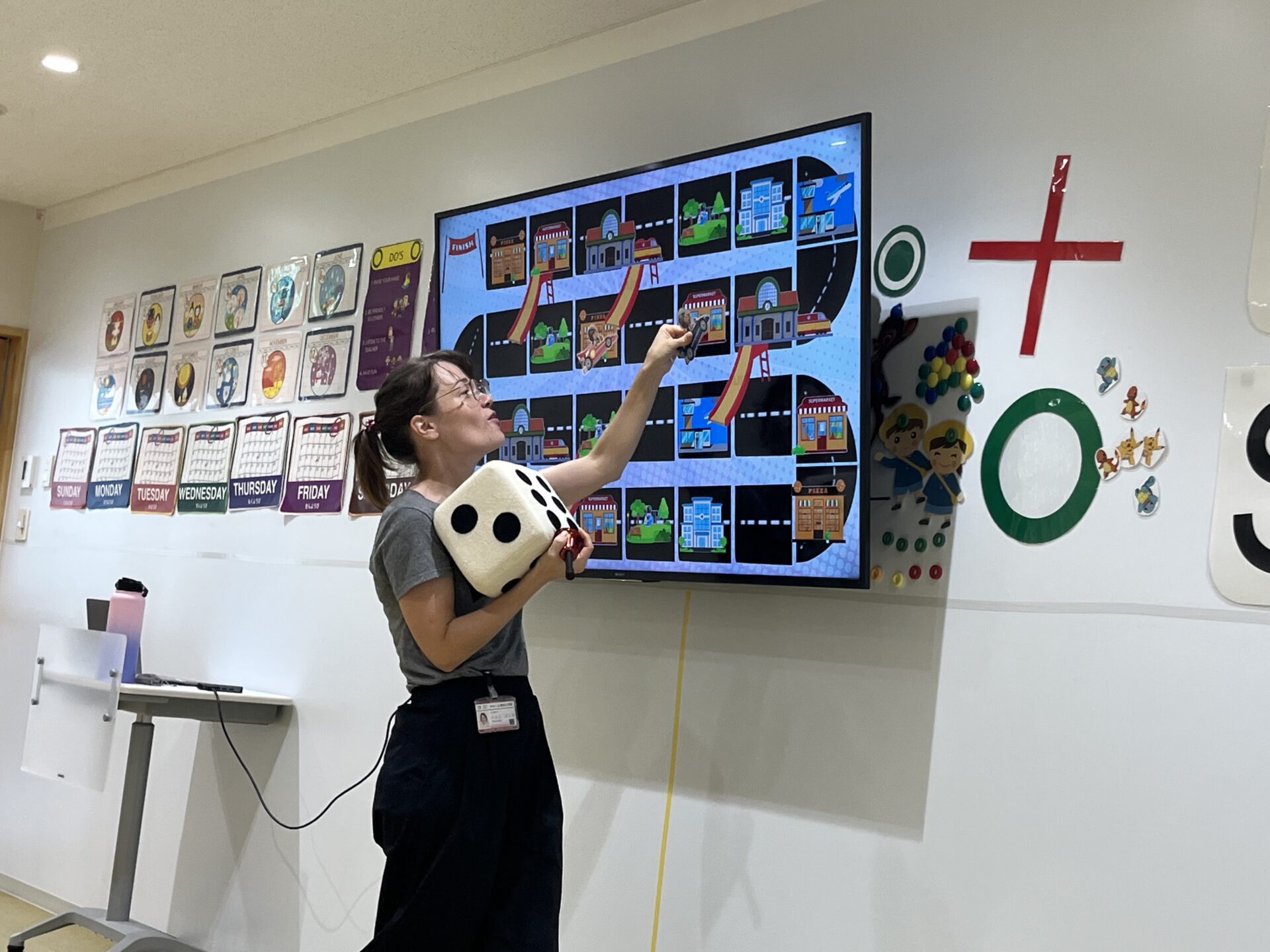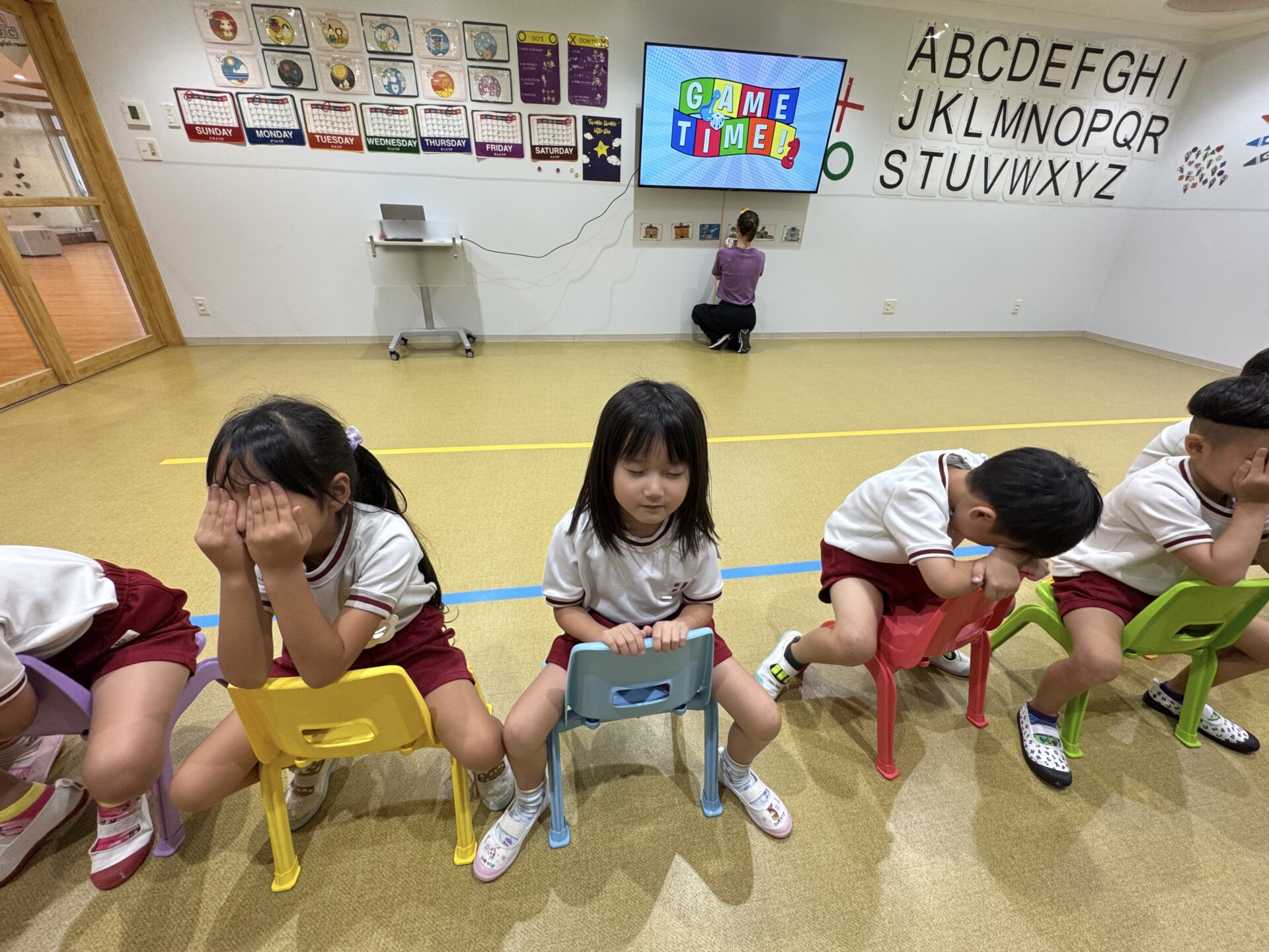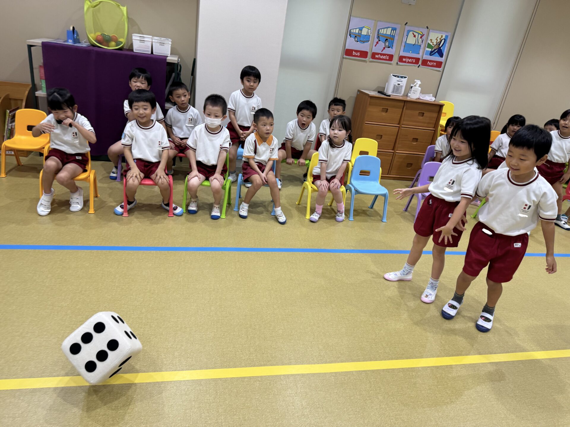 年長組は、ホットポテトとかくれんぼポケモン🫣をして、いろいろな街の場所を覚える練習をしました。年長組の発音は特にスーパーマーケットと駅の発音が上手で、もちろんみんなピザレストランを覚えています。まずはマンスリーの歌「左と右」を楽しみ、アリサ先生の言葉に合わせて目を閉じて左か右を向くミニゲームをしました。それで、このテーマの最後の英語遊びでは、レースゲームをしました🎉 2つのチームがゴールラインを目指して競争し、着地した場所を叫びました。ただし、滑り台🛝に着地すると、車がさらに後ろの場所に滑り落ちてしまうというルールがありました!クラスによってはとても接戦で、何度も滑り台に着地するチームもありました。興奮したり😆、悲しんだり😭、そしていつものように英語の楽しさがありました🤩!