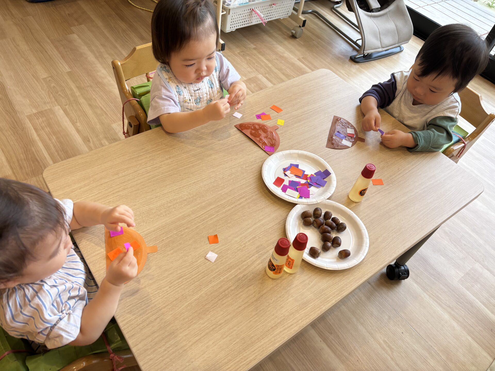 カラフルな折り紙をどんぐり帽子に貼り、顔や口をつけてあげました!