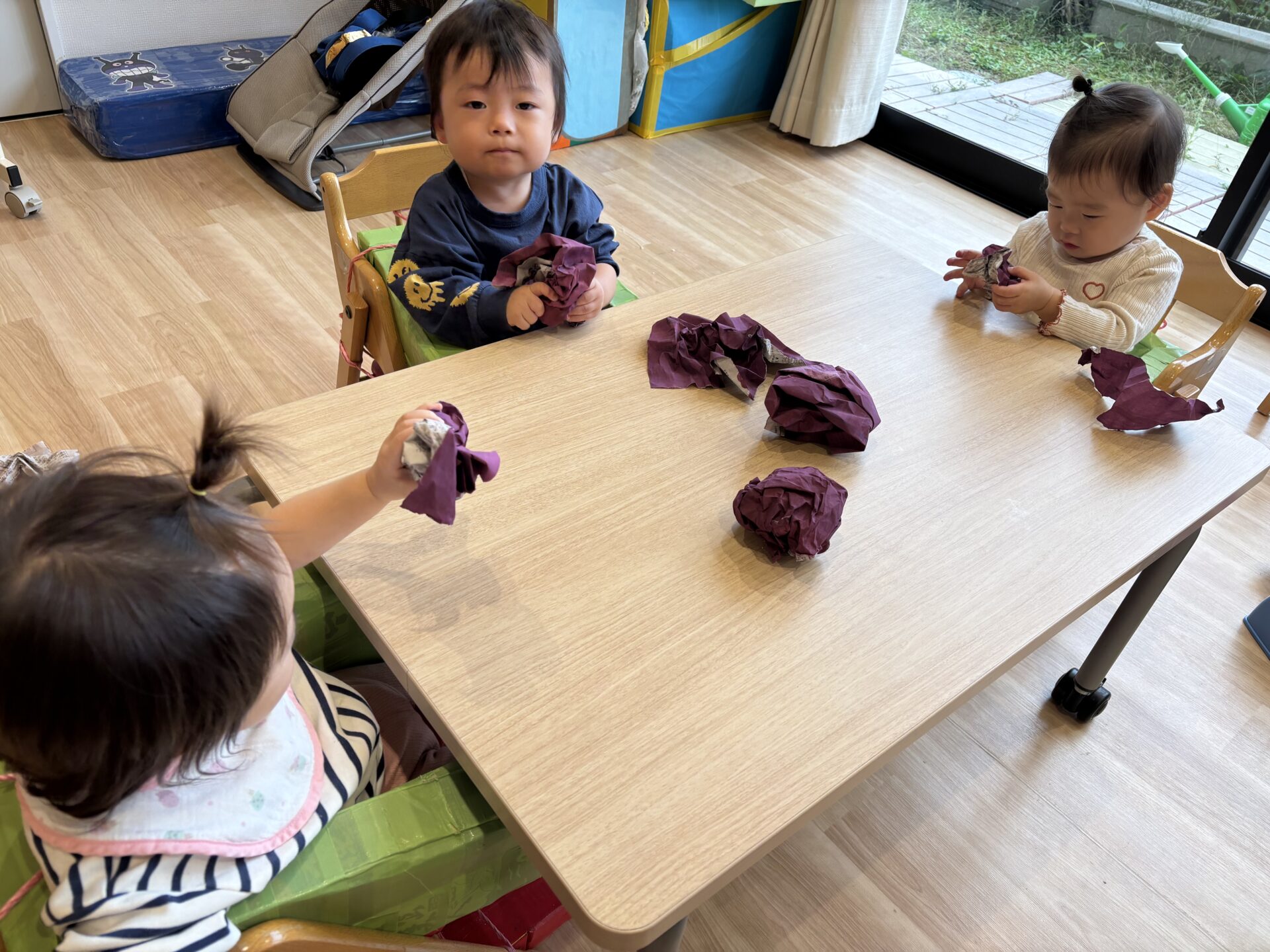 紫色に塗られた新聞紙を”ギュっギュッギュッ”と丸めるとさつまいもの完成です✨