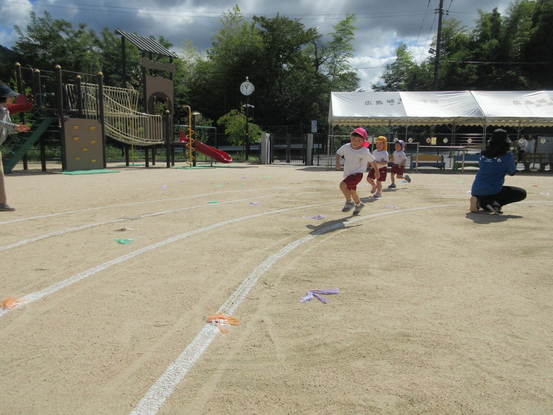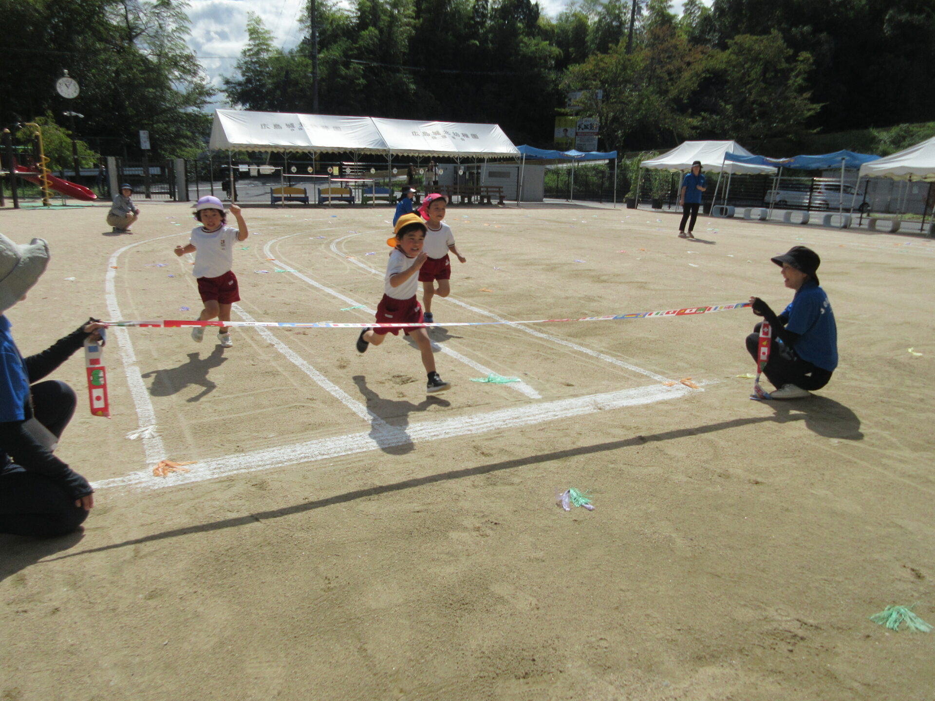 かけっこでは、一人ひとりがゴールをめざして力いっぱい走ります。年少では、直線でのかけっこでしたがカーブにも挑戦しています。