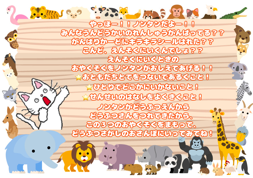 遠足に行くときの3つの約束が書かれていました!【お友達と手を繋ぐこと】【ひとりでどこかに行かないこと】【先生の話をよく聞くこと】そして…【ノンタンが動物園から動物を連れてきたから散歩に行って探してみてね♪】というお願い事も書いてあります。。。!