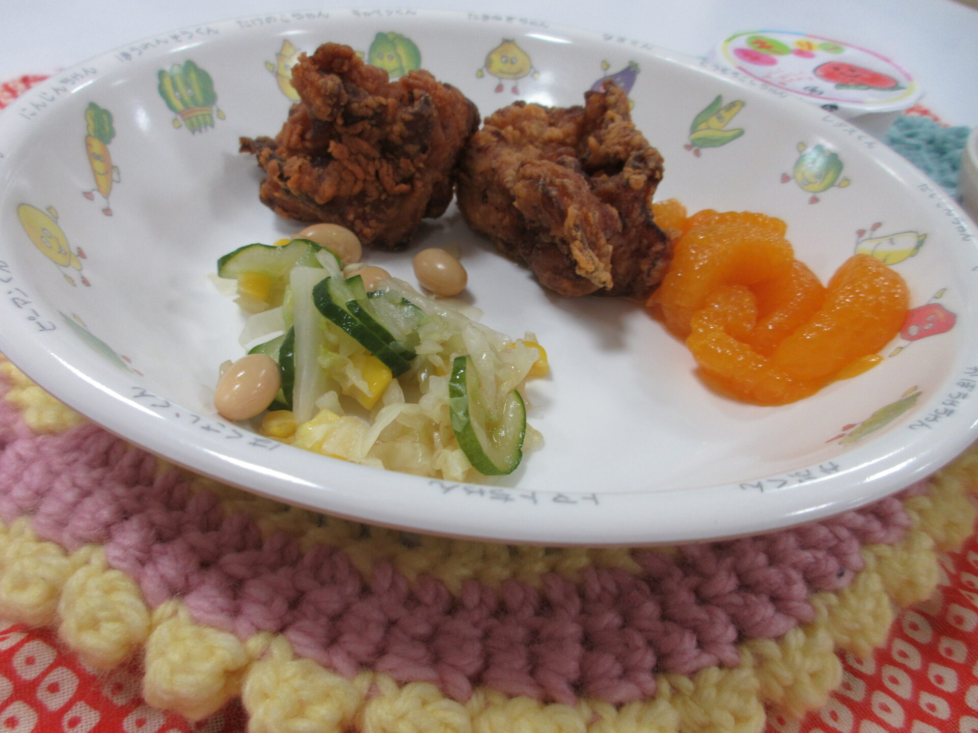 【お誕生日おめでとう 彩りピラフ 鶏唐揚げ まめ豆サラダ 🍑ももゼリー みかん缶】