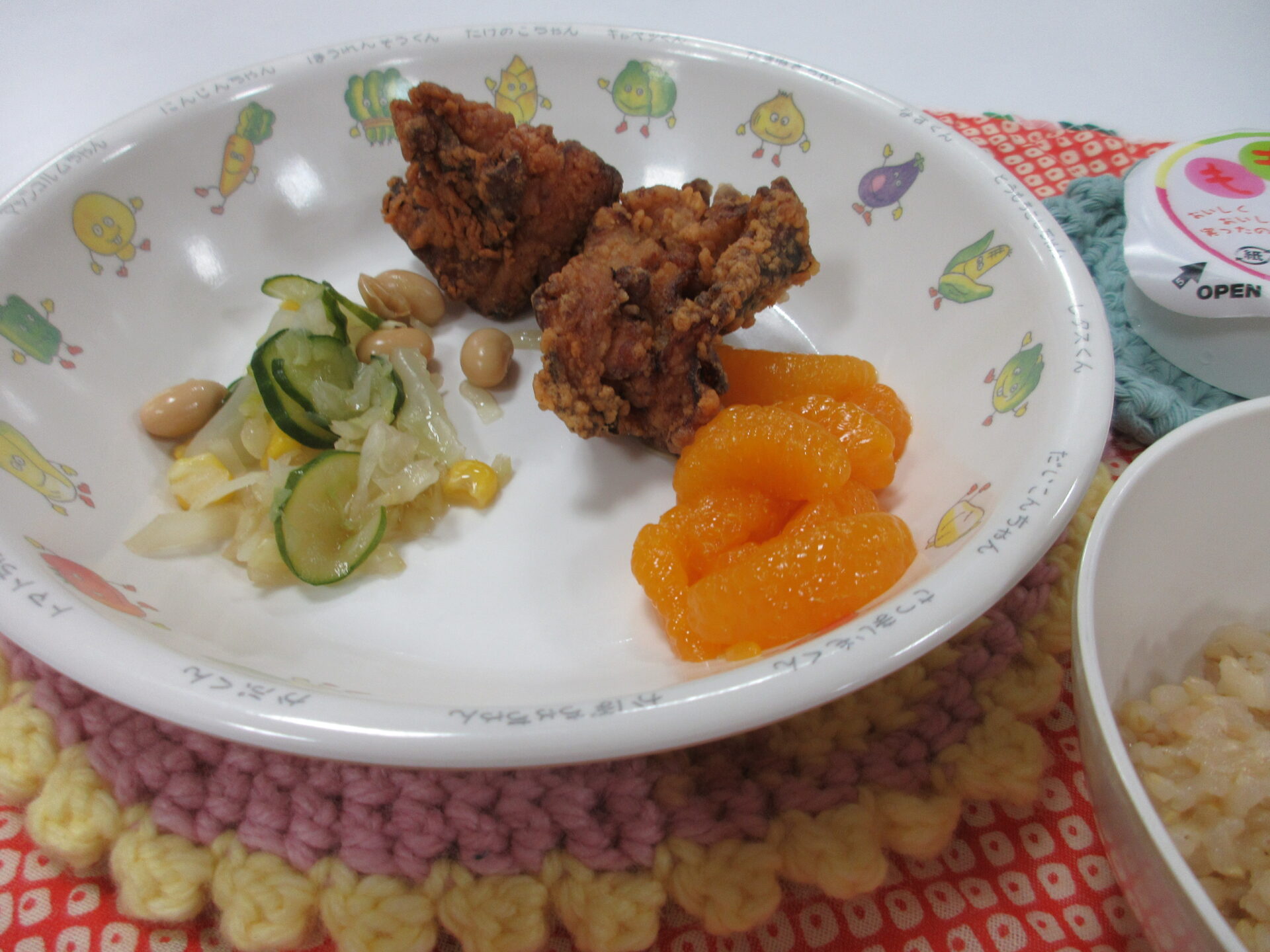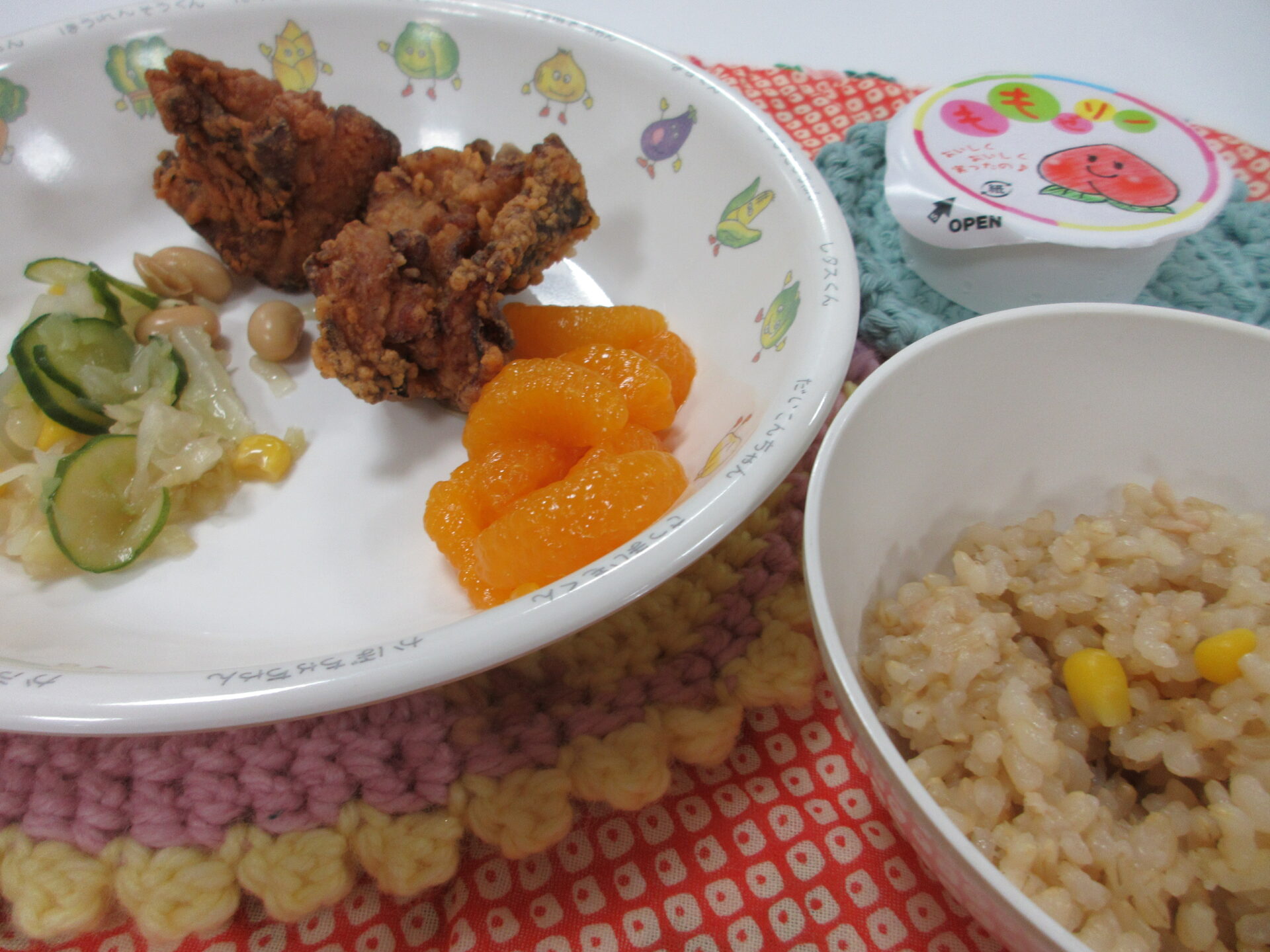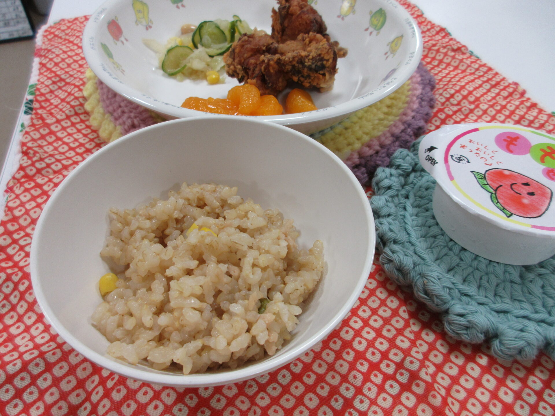 発芽玄米のピラフはミックスベジタブルの色合いがキレイで味も美味しかったです。鶏唐揚げはいつ食べても大好きな献立でした。