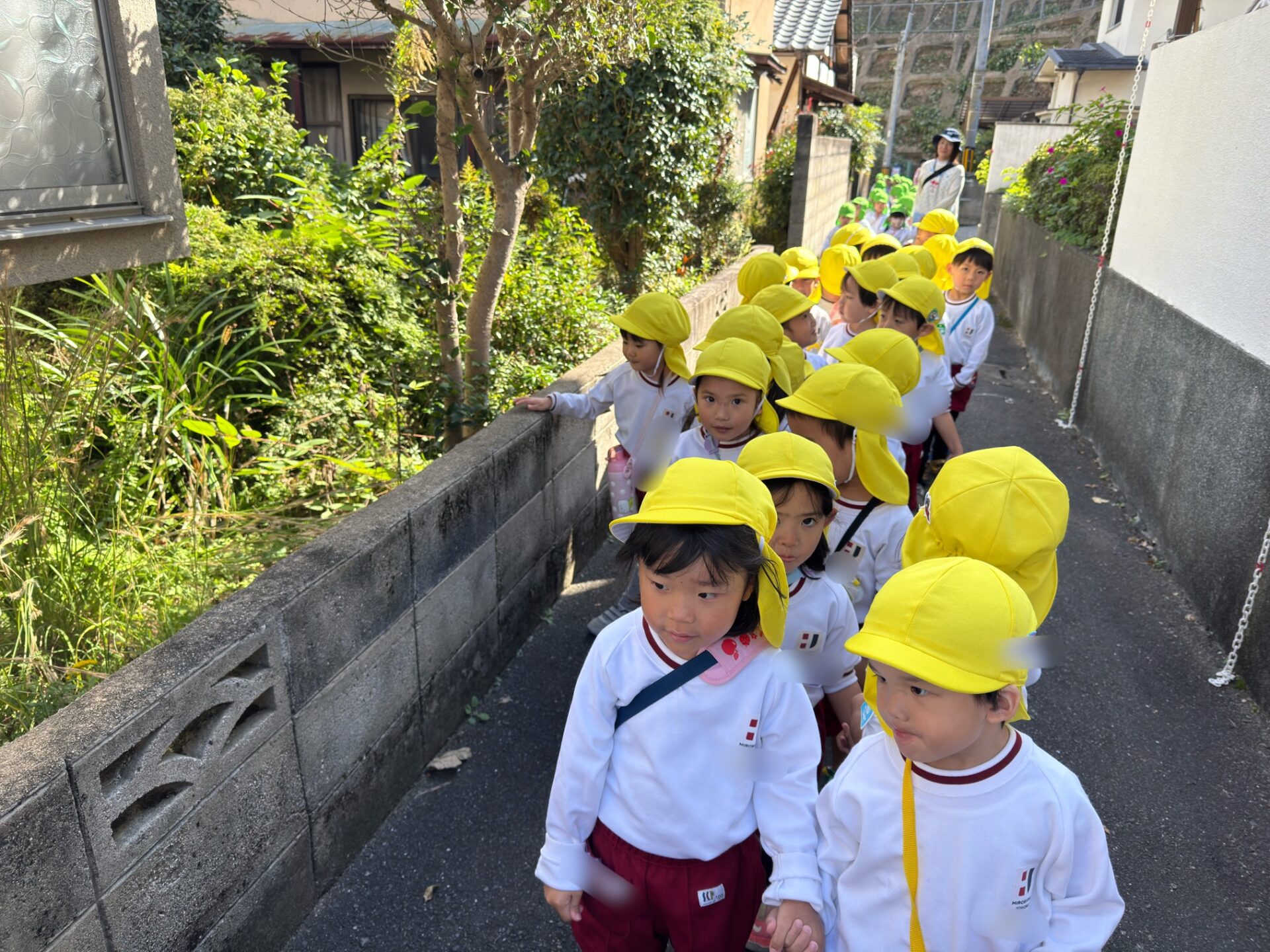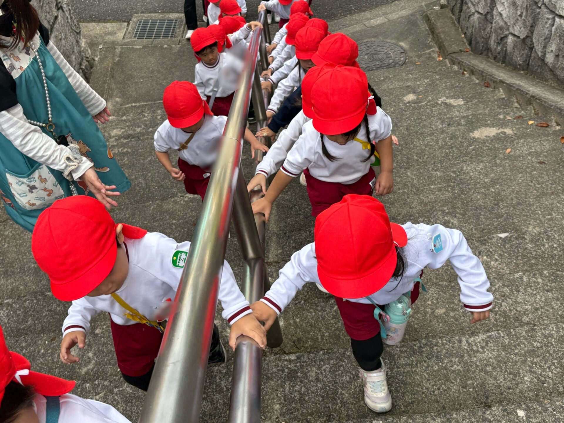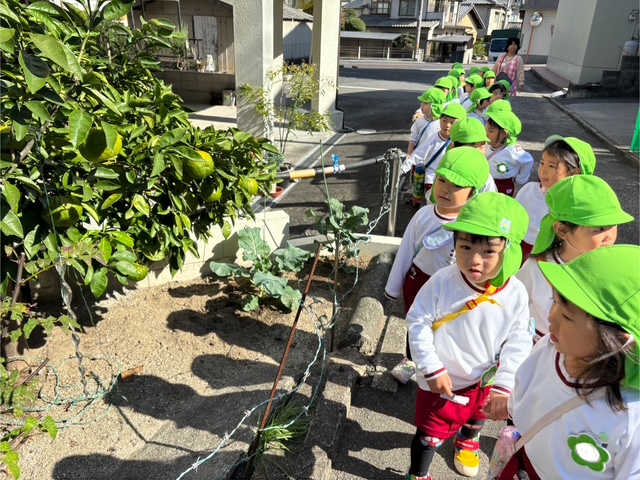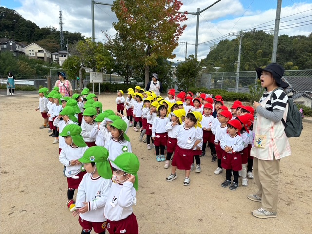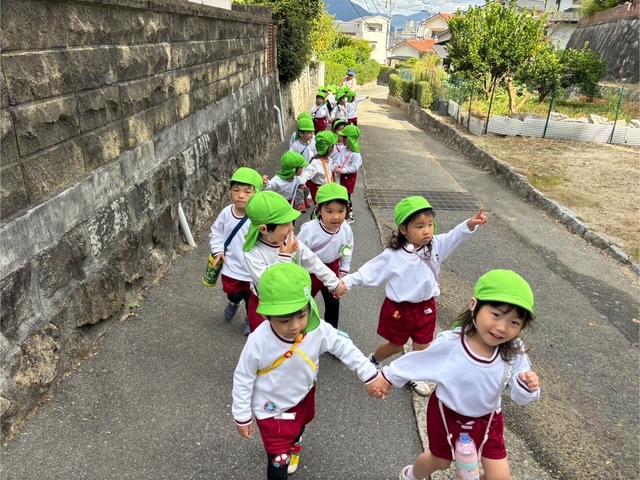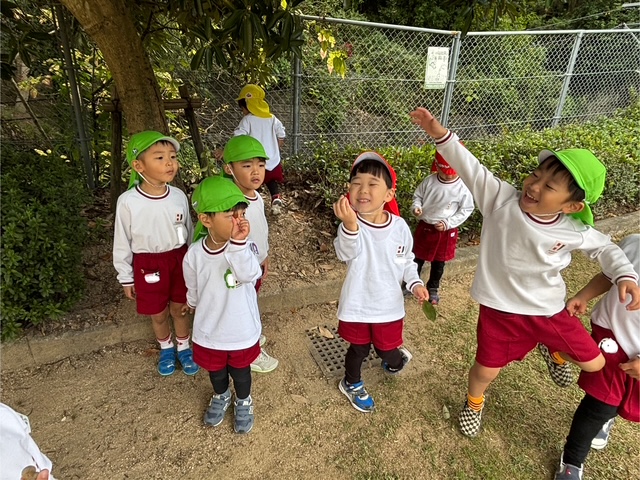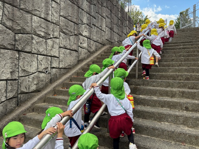 秋らしく涼しい気候になってきたので年少組は散歩へ行きました😊元気よく「行ってきます」と挨拶をしてさっそく出発です!友達と手を繋いで歩きます。歩いていると…木の実を発見したり、地域の方が声をかけてくださったりしました💖公園に行くには長い階段を上らないといけませんが手すりをもって上手にあがることができました!
