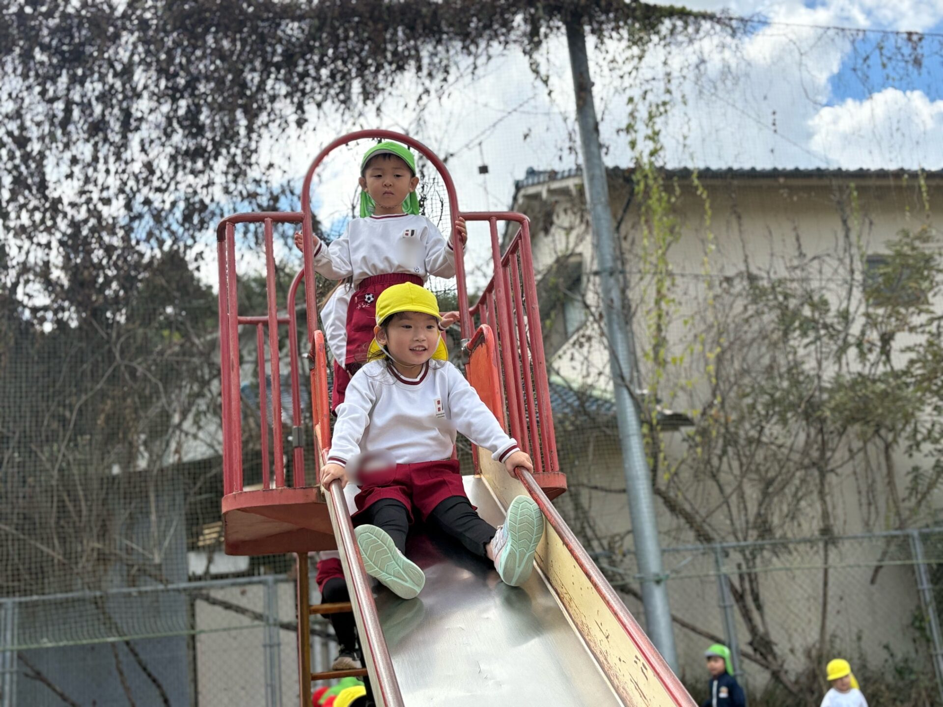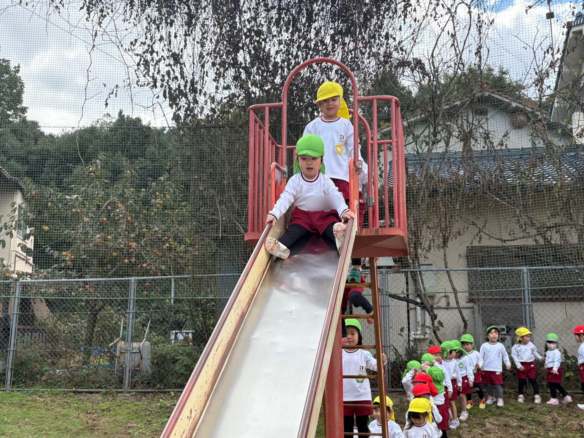 「すべりだいすごく早く滑れるよ😲」「足でブレーキかけて👍」「順番こね😊」園の滑り台とは違うジェットコースターみたいなスリルです😚