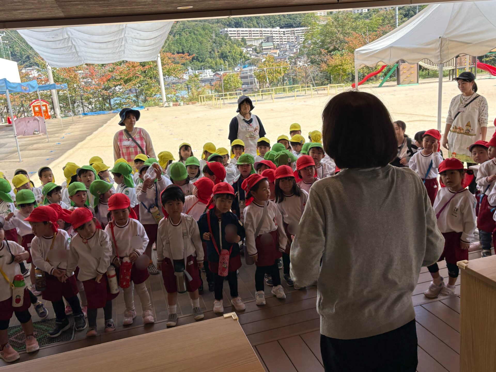 園に帰って園長先生に「ただいま帰りました」の挨拶をした後は、「どんぐり見つけたんだよ!」「葉っぱも見てみて!」と楽しかったことや発見したことをお話ししました😊 また、秋のお散歩に出かけて楽しみたいです。