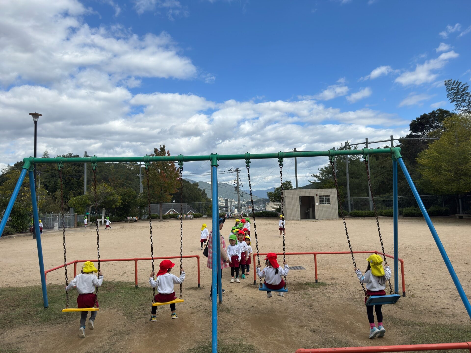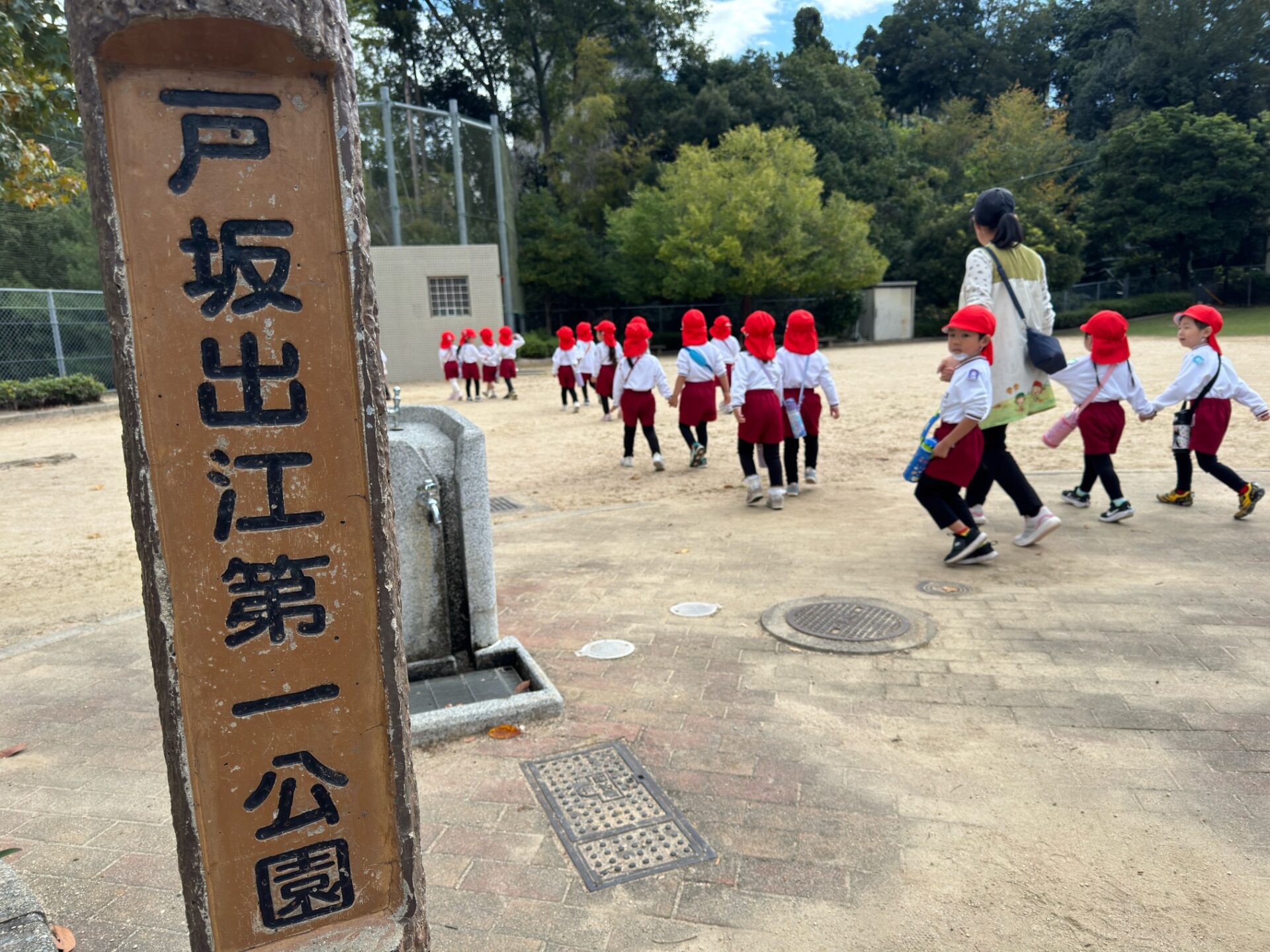 「戸坂出江第一公園」に到着すると「ブランコしたい!」「どんぐりあるかな!?」と目を輝かせる園児たち!公園でのお約束を先生たちと確認したら、お待ちかねの公園で遊ぶ時間です😊
