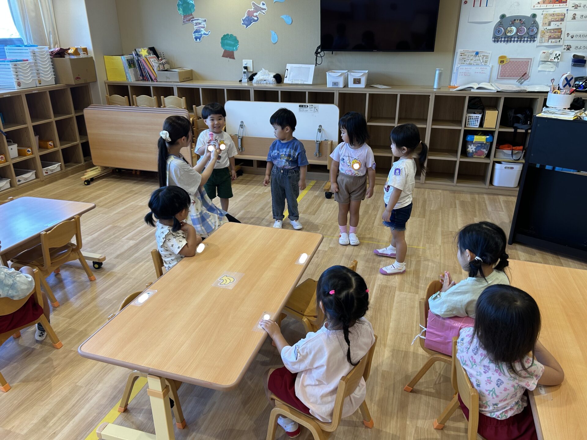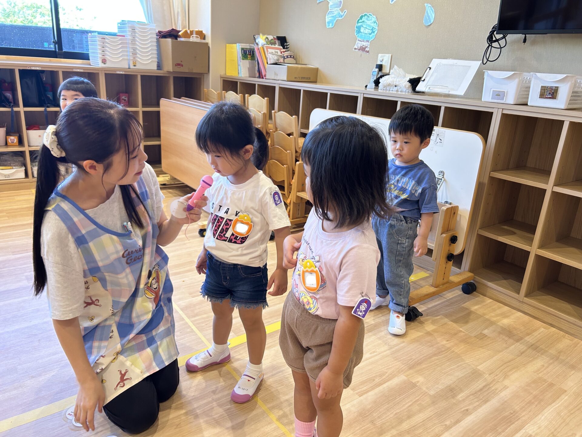 「入園おめでとう会」で新入園児はマイクを持って自分の名前を紹介し、担任からおめでとうワッペンをつけてもらいました。在園児は名前を聞くと、「よろしくね」と優しく拍手をしてあげる姿が見られました👏