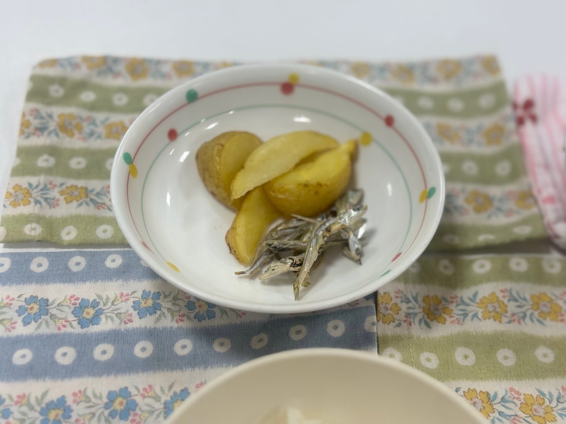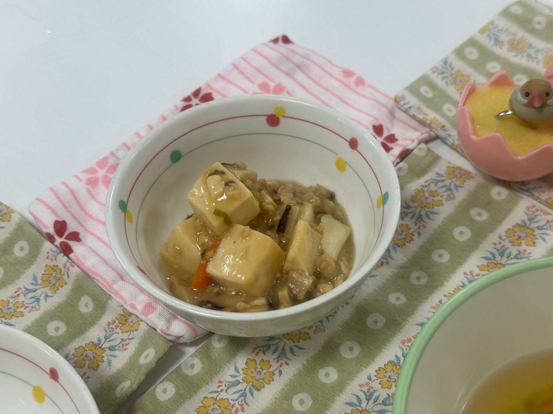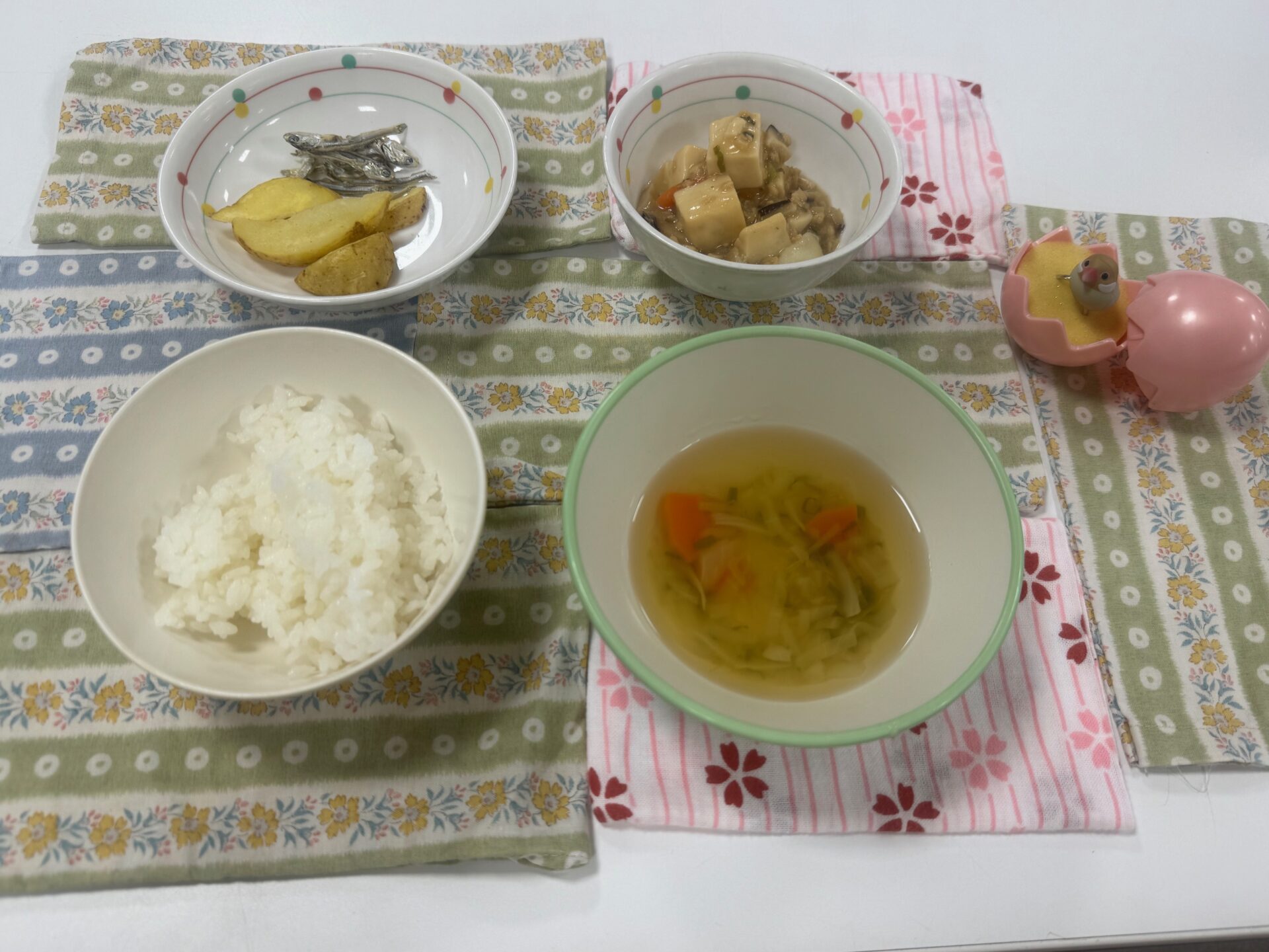 【白米ご飯 麻婆豆腐 🍟フライドポテト 野菜スープ 食べる煮干し】