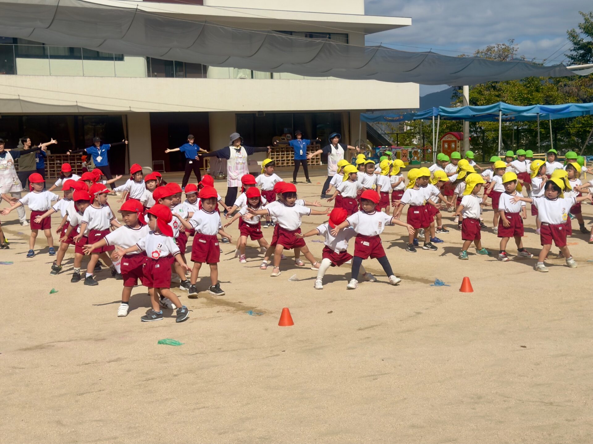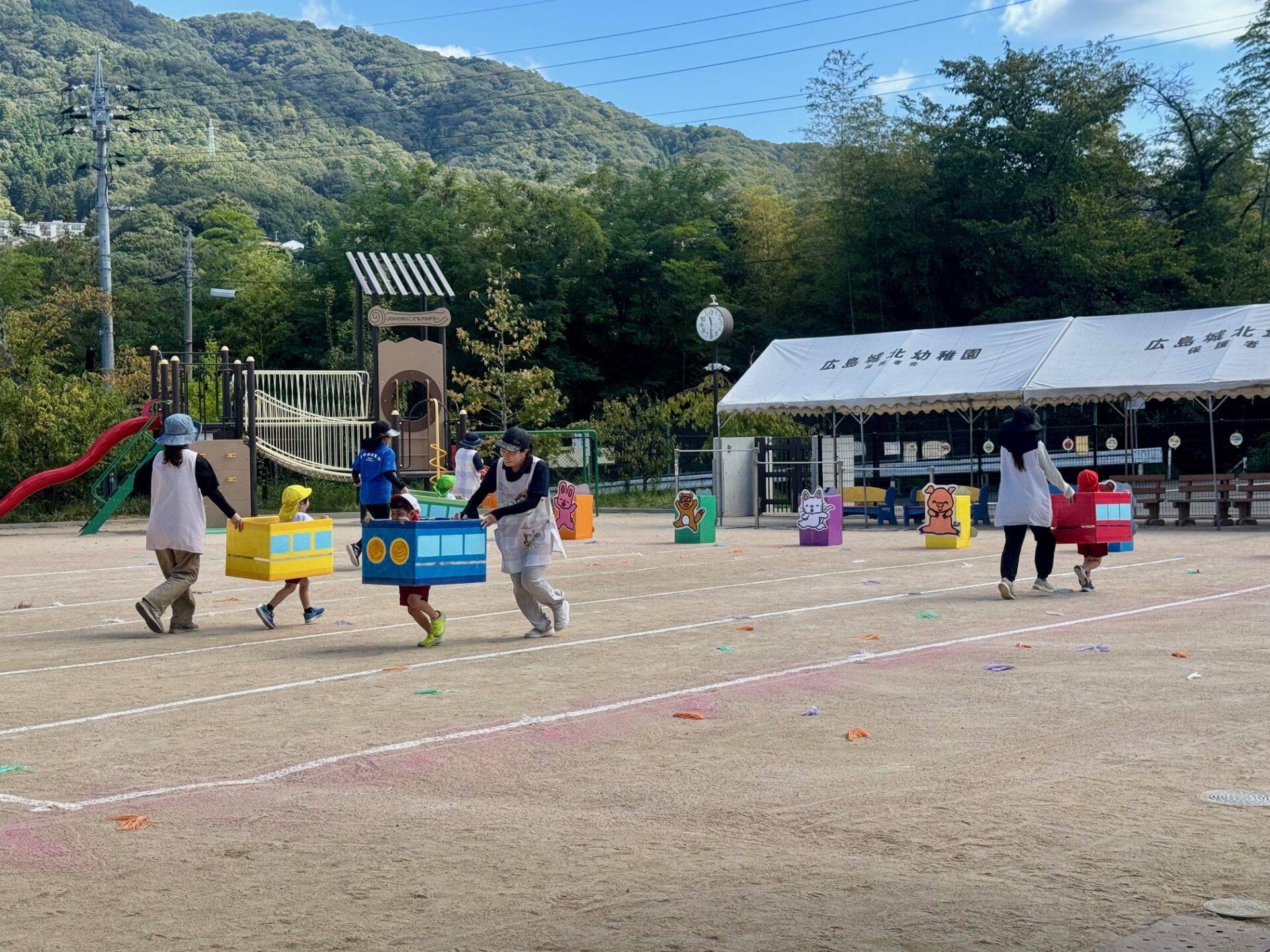 本番では保護者の皆様に参加していただく親子競技の「でんしゃごっこ」。今日は先生たちと練習です。本番で一緒に活動するのをとても楽しみにしています。転ばないように気をつけて~♡