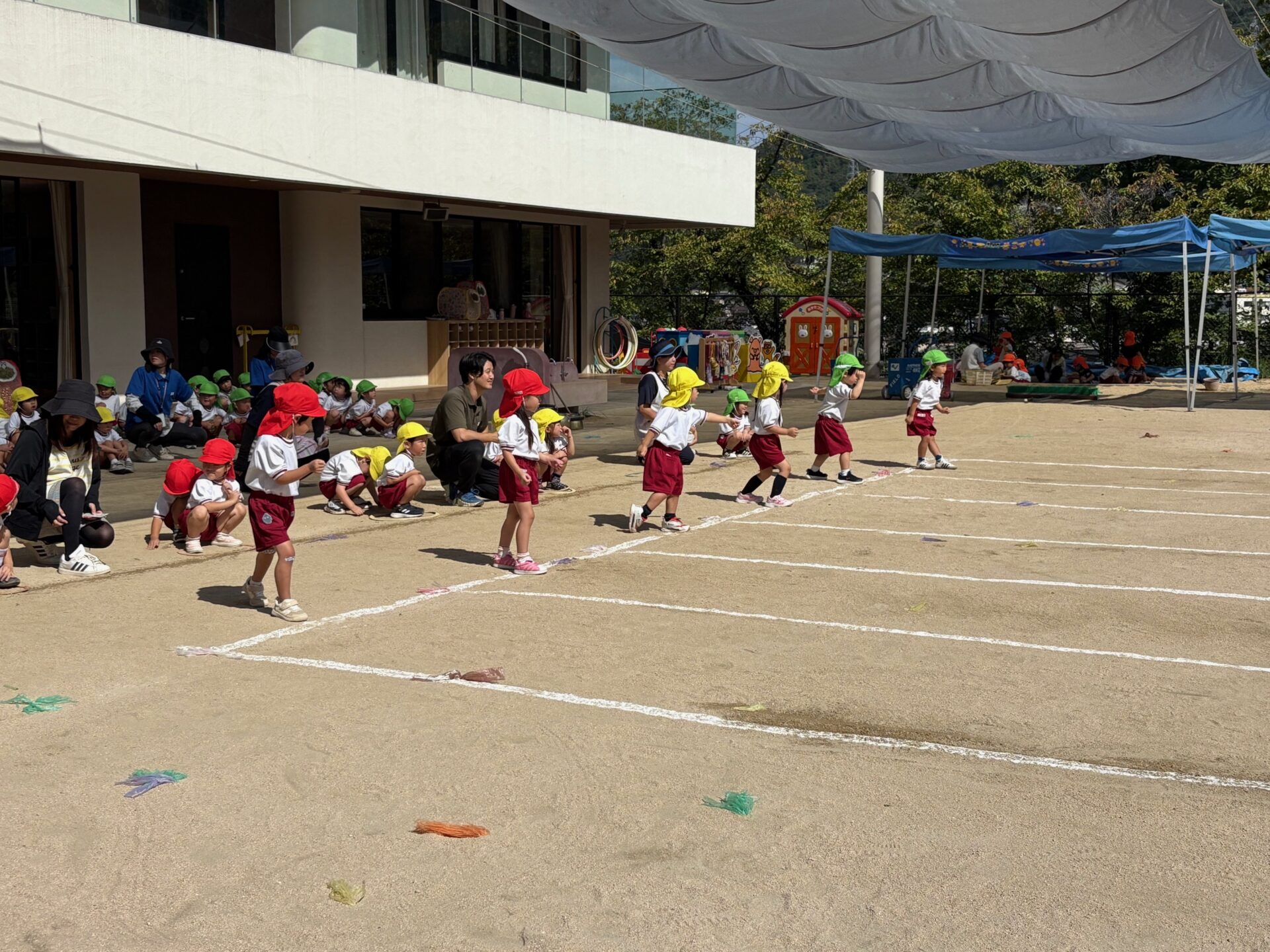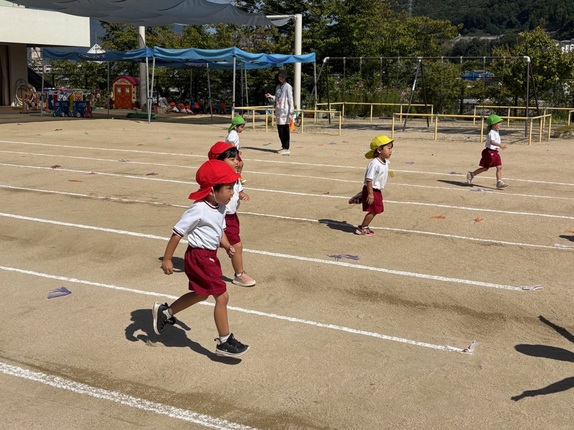 次はかけっこです。元気よくお返事できるかな?ゴールの先生のところまで走りますよ!がんばれ~!