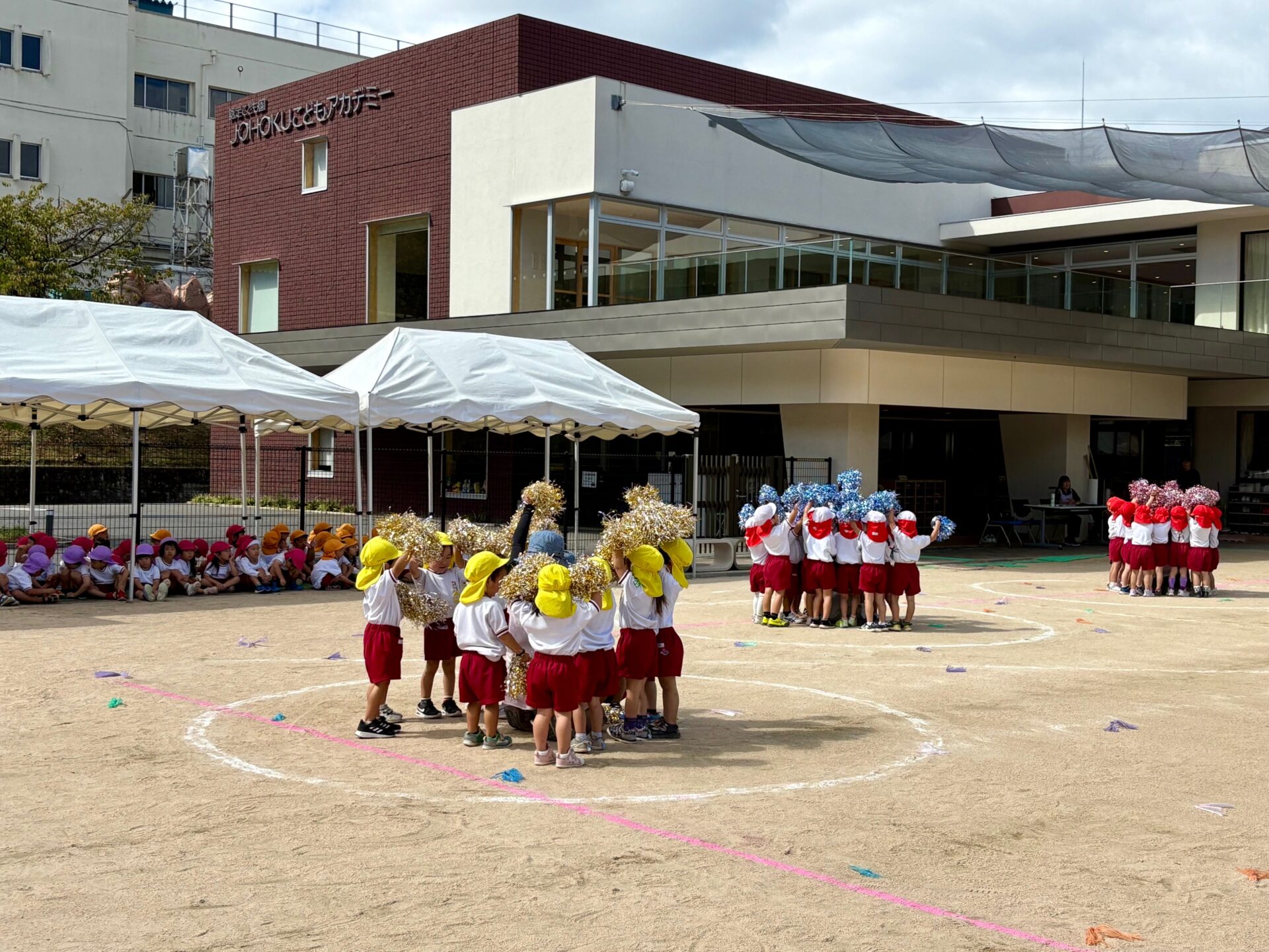 グループごとに違うキラキラのポンポンを持ち、楽しくダンス♪ 隊形移動も上手にできました。