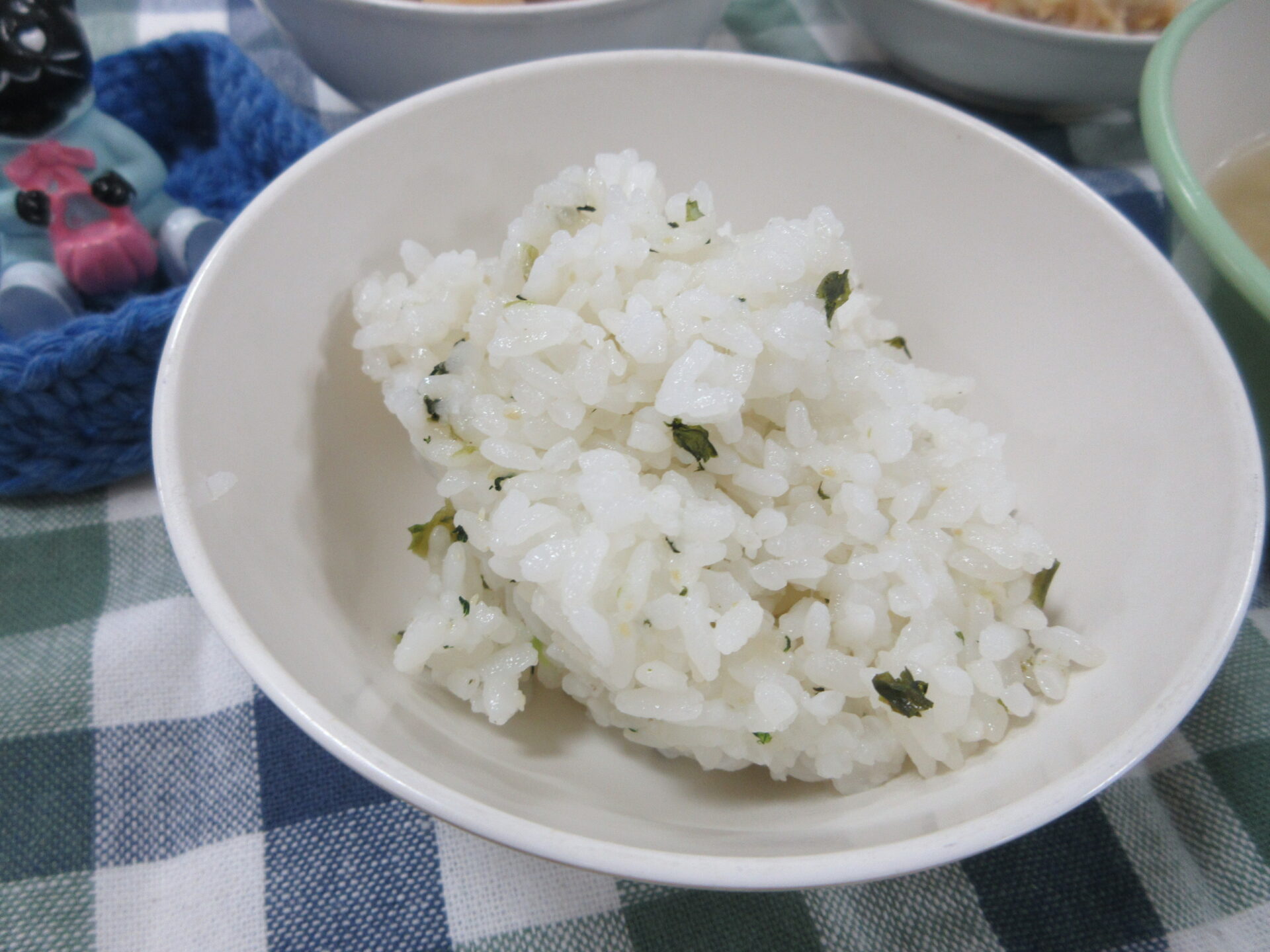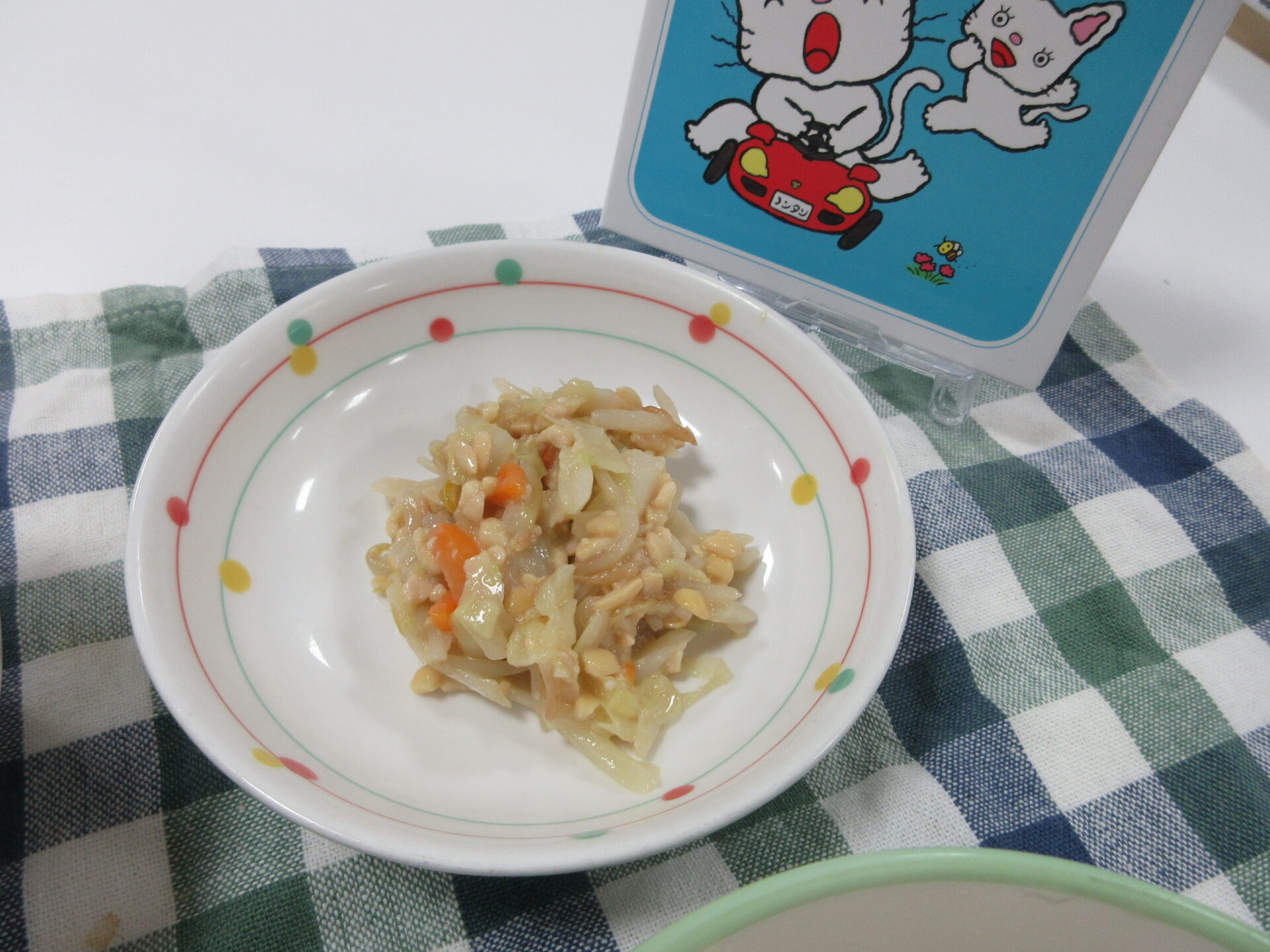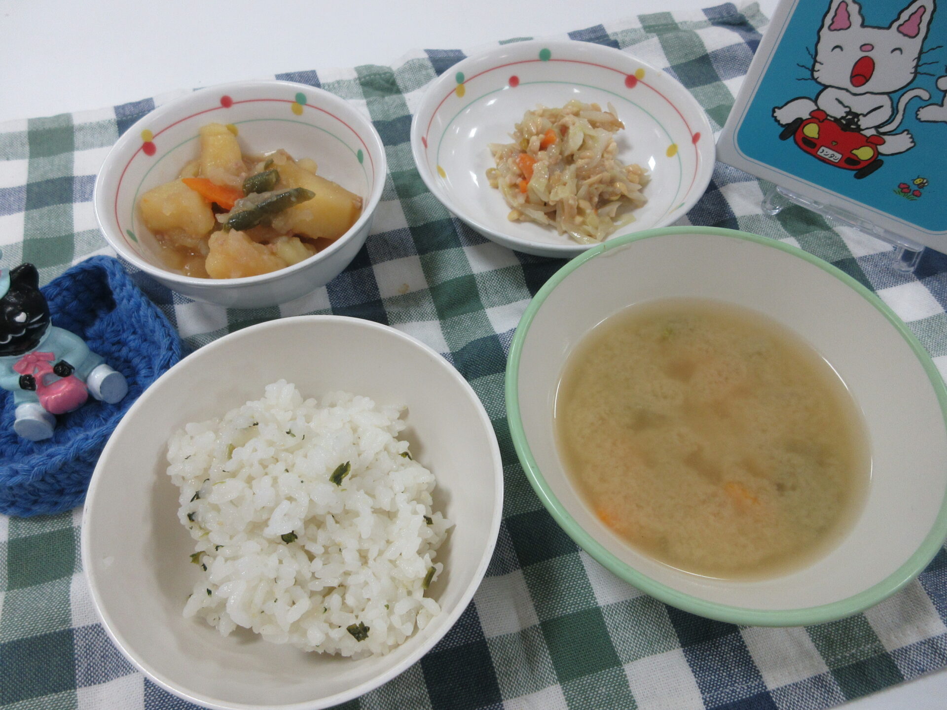 白米菜飯は定番の美味しさでした。豚ミンチやいんげん入りの肉じゃがはジャガイモがホクホクでした。ナムル納豆はゴマ油の香りが食べやすかったです。