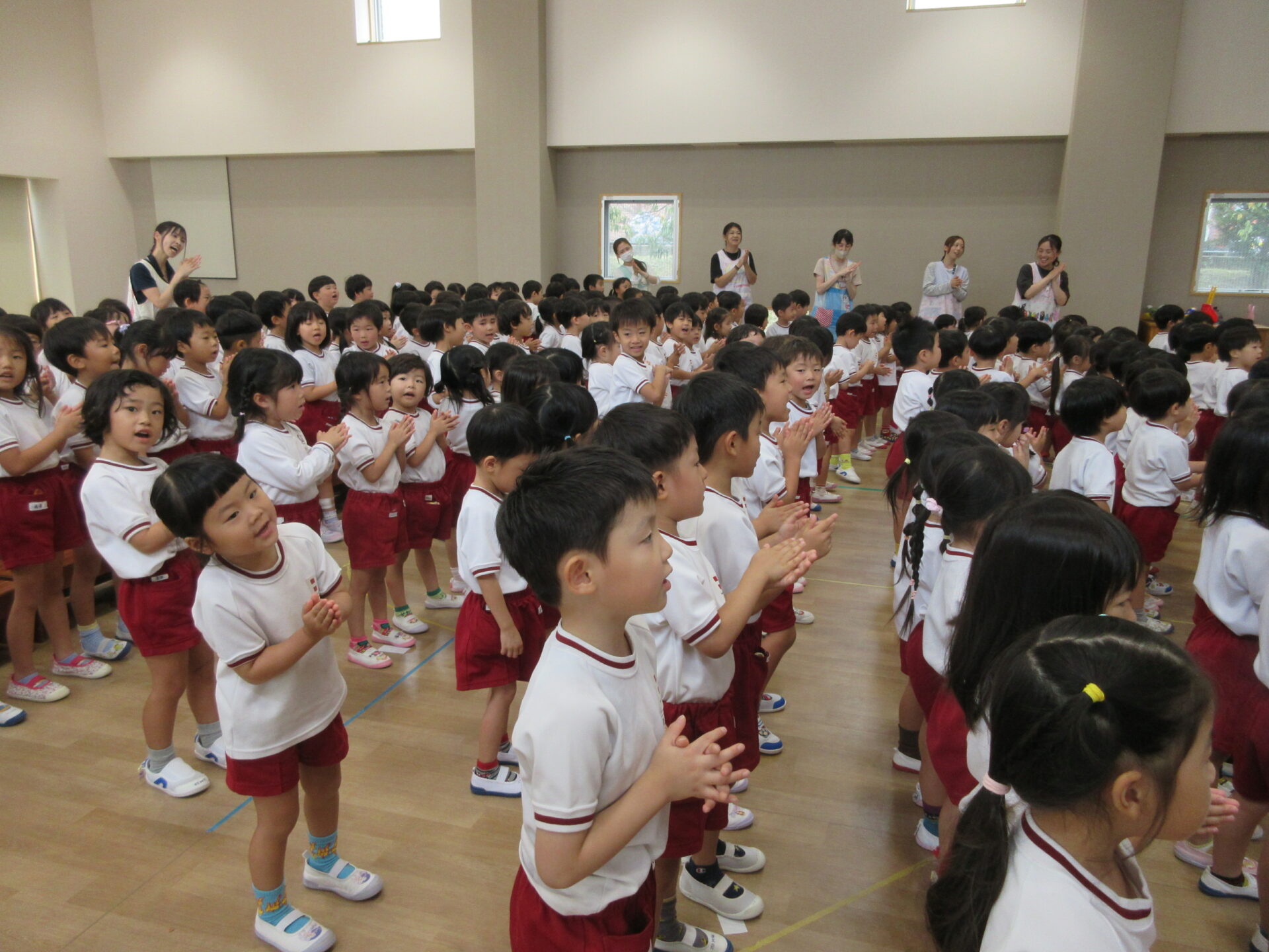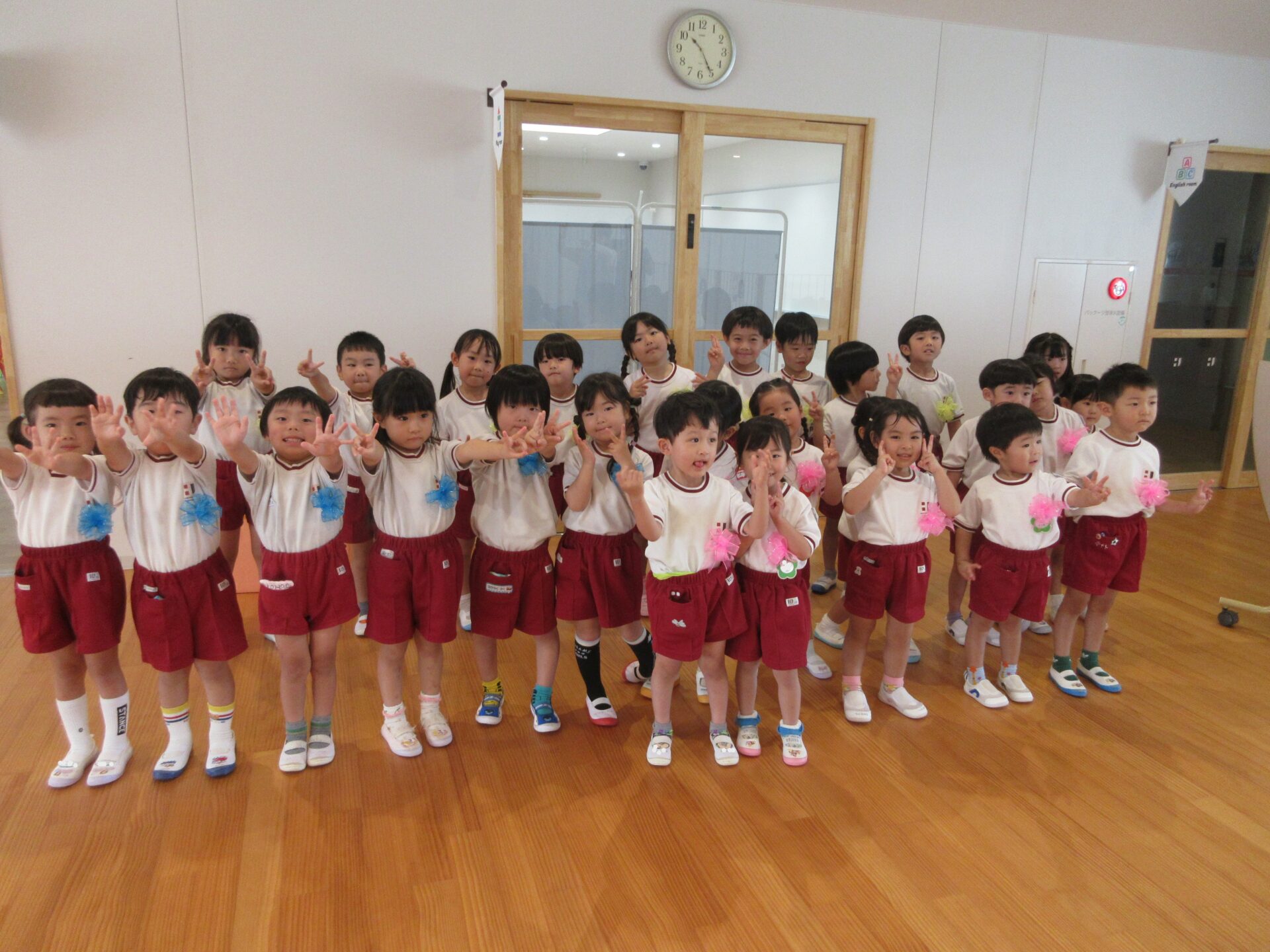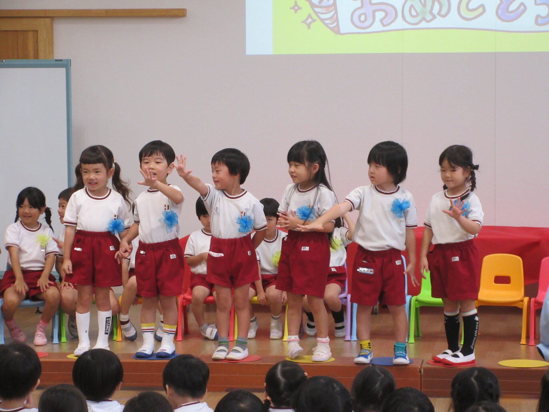 一人ずつ自己紹介をします。たくさんのお友達の前でドキドキしましたが、みんな上手に名前が言えました👌😊