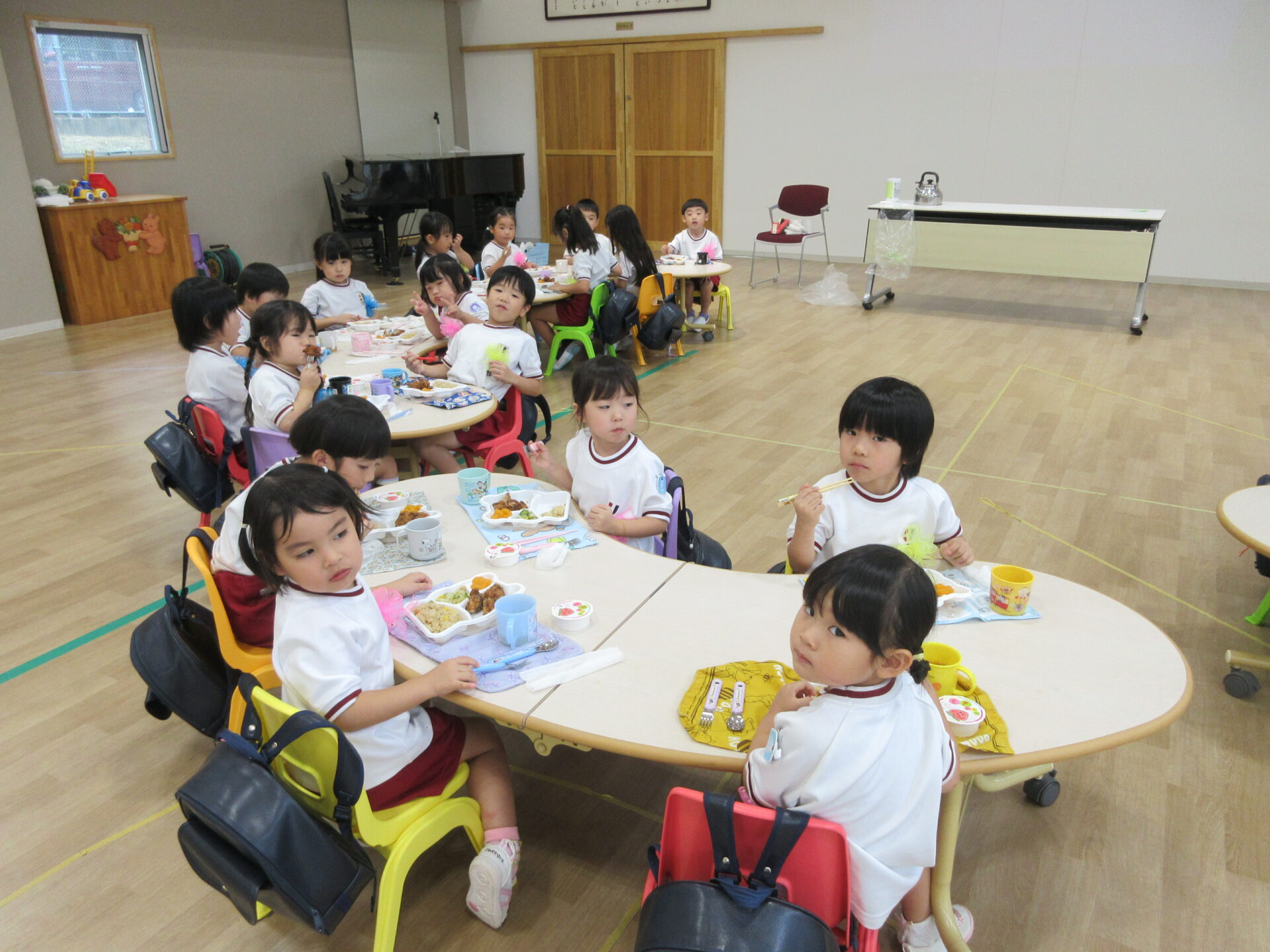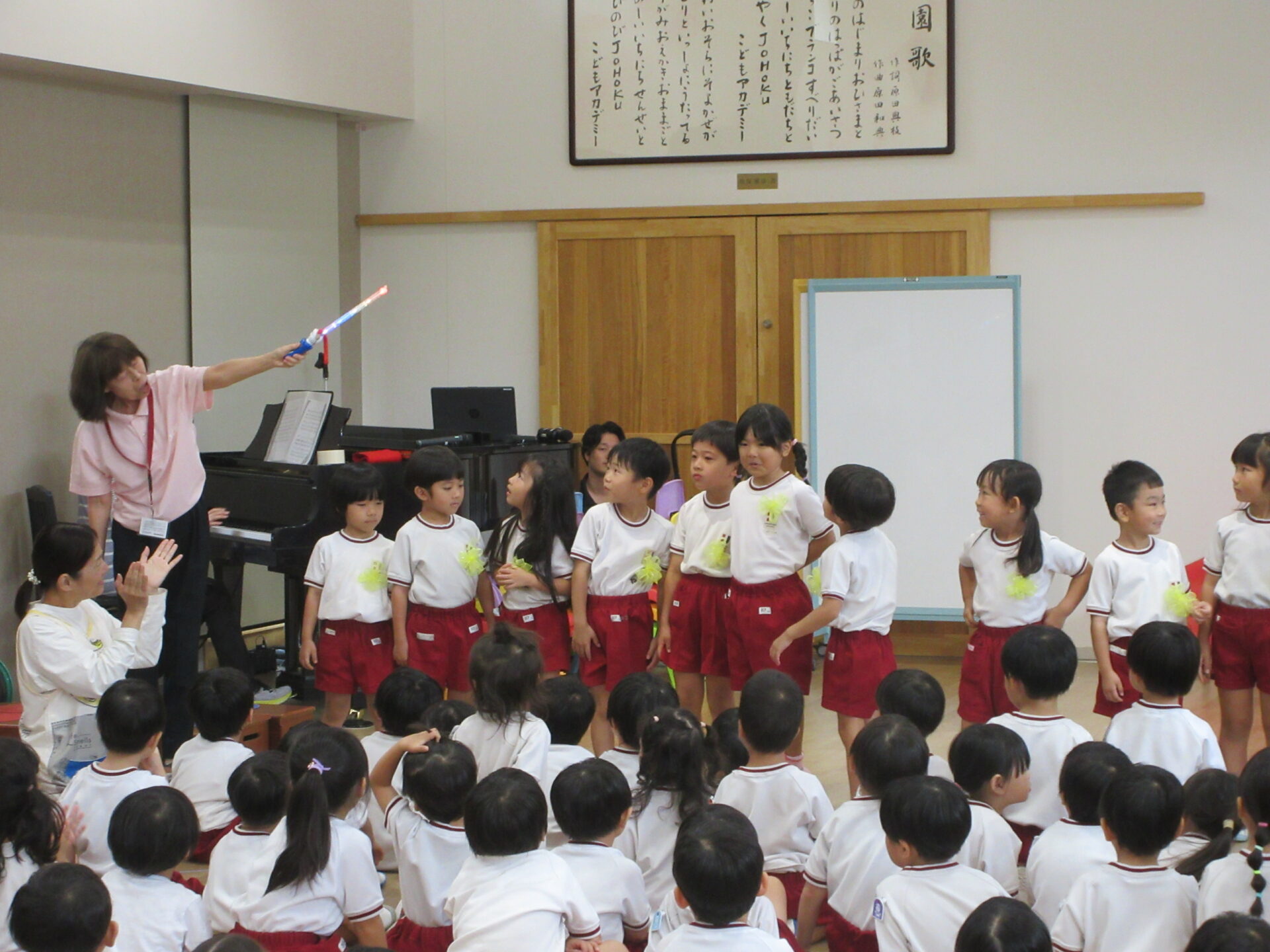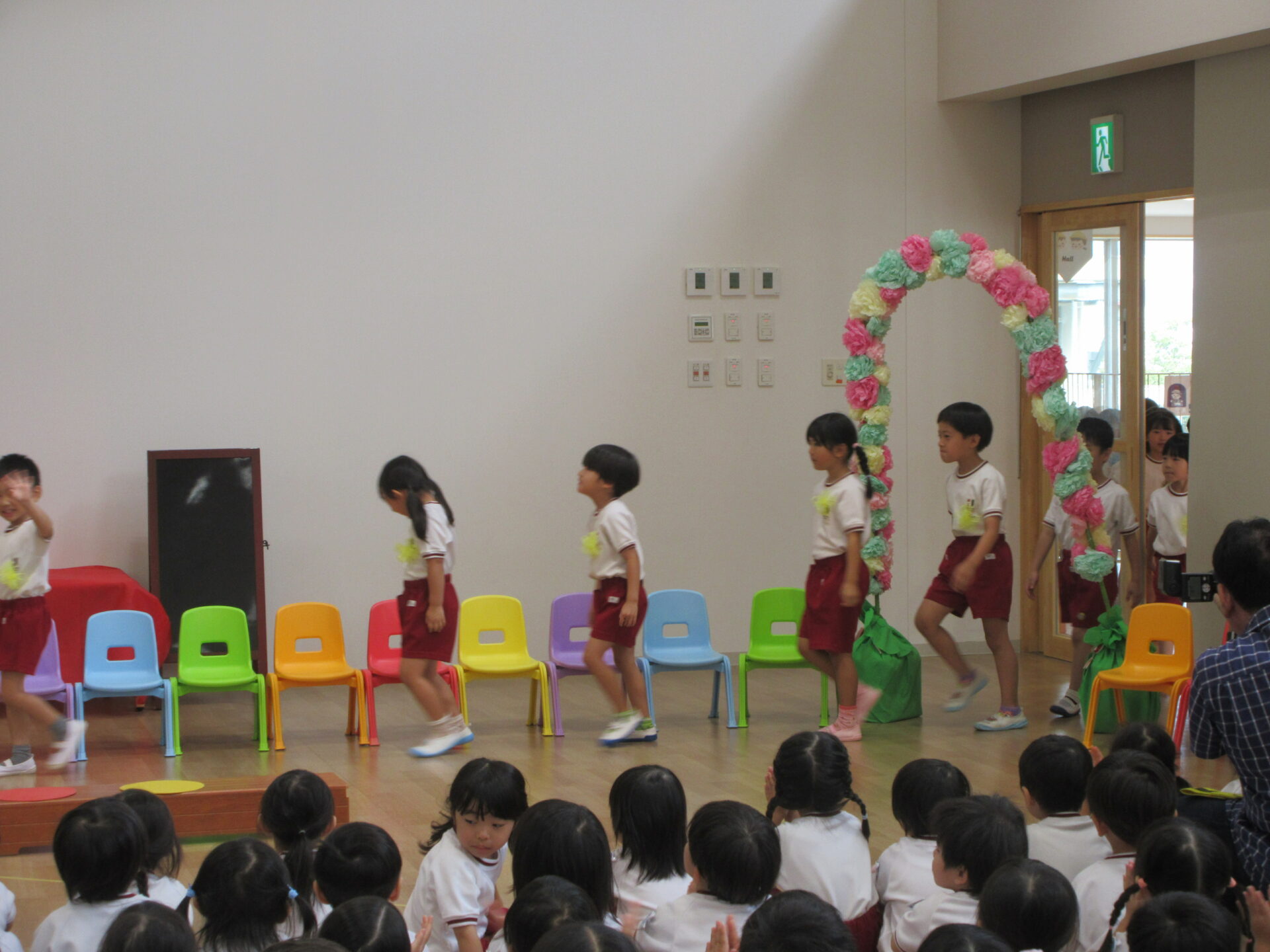 一人ずつ自己紹介をします。たくさんのお友達の前でドキドキしましたが、みんな上手に名前が言えました👌😊