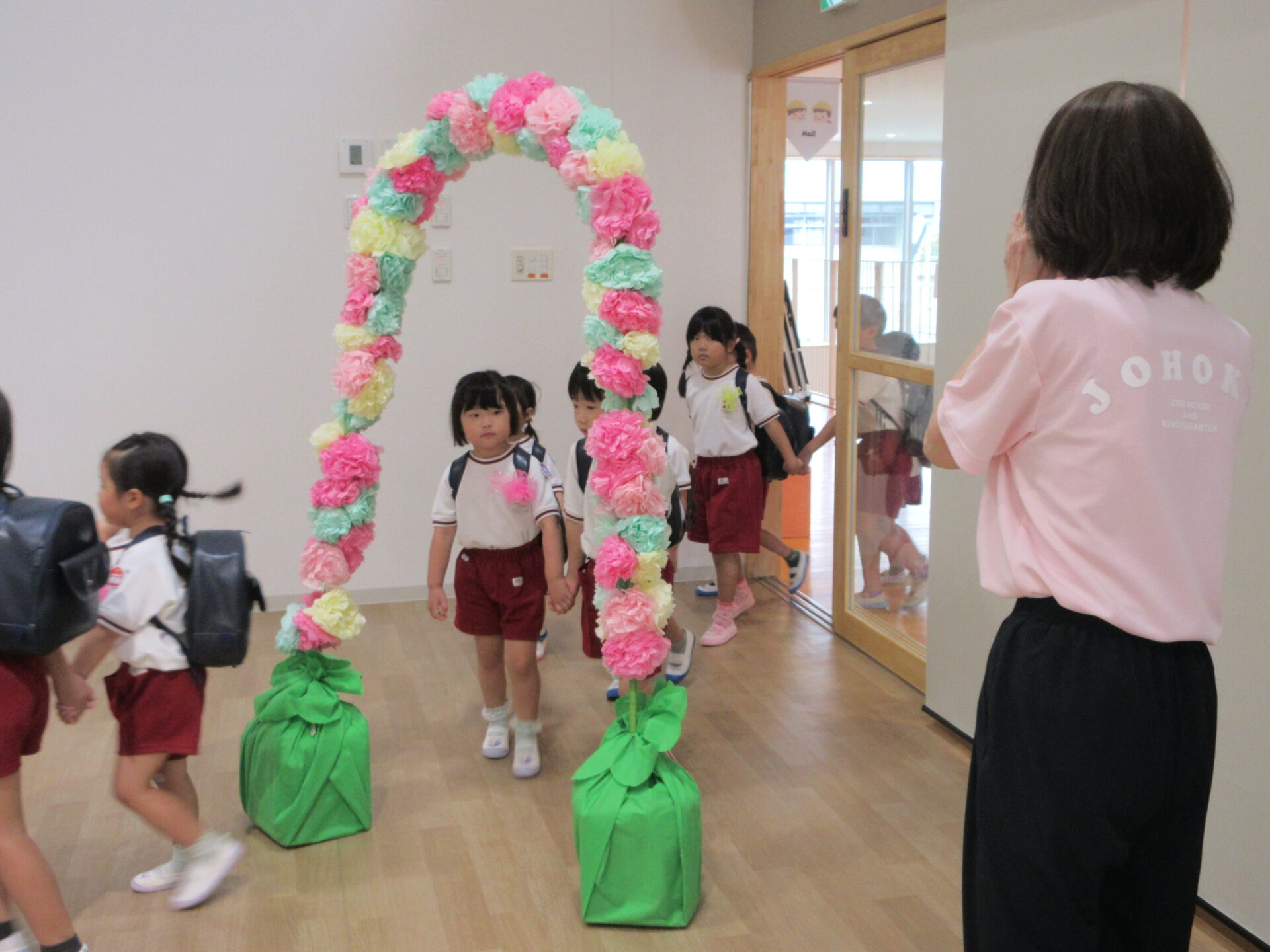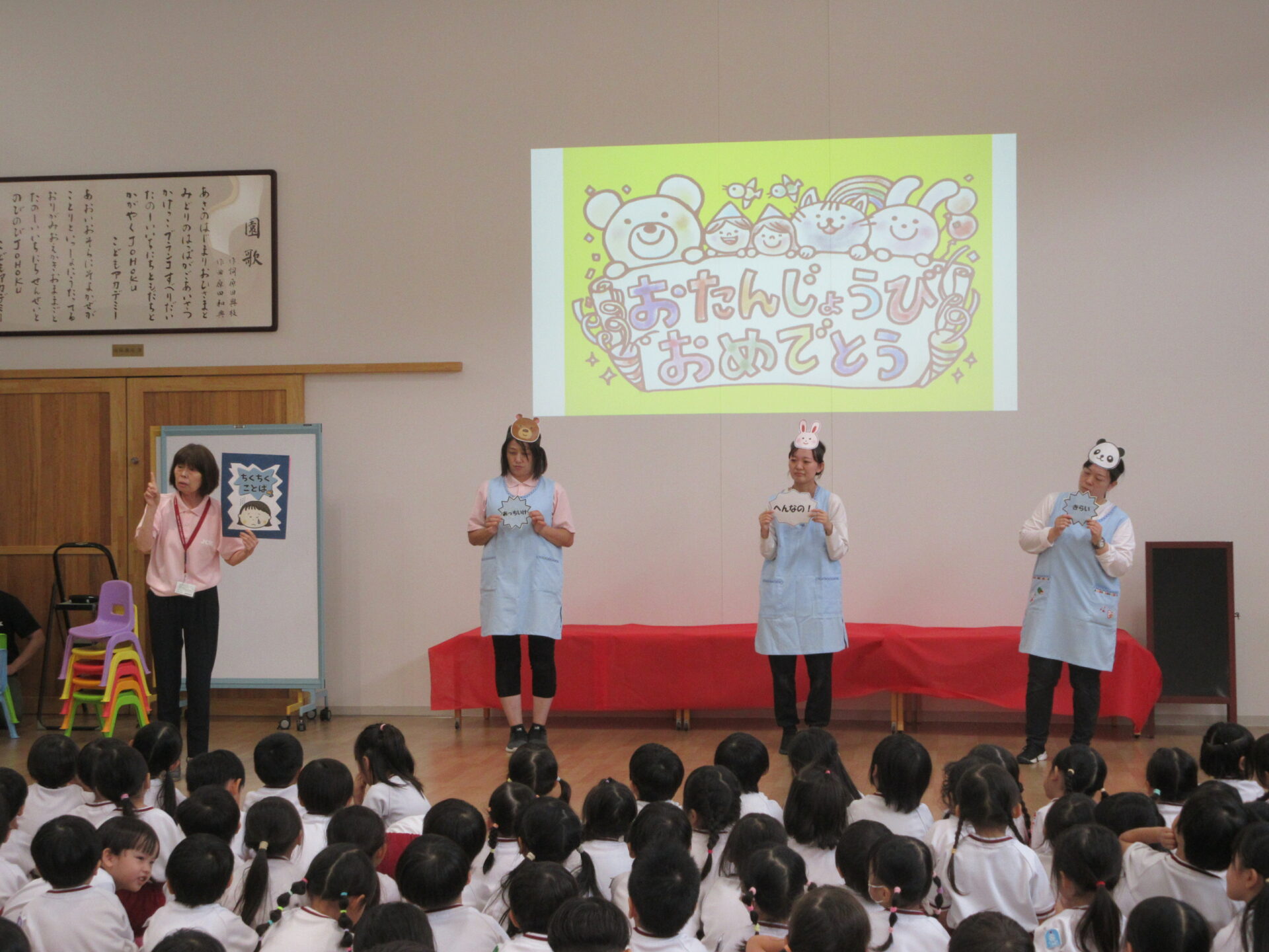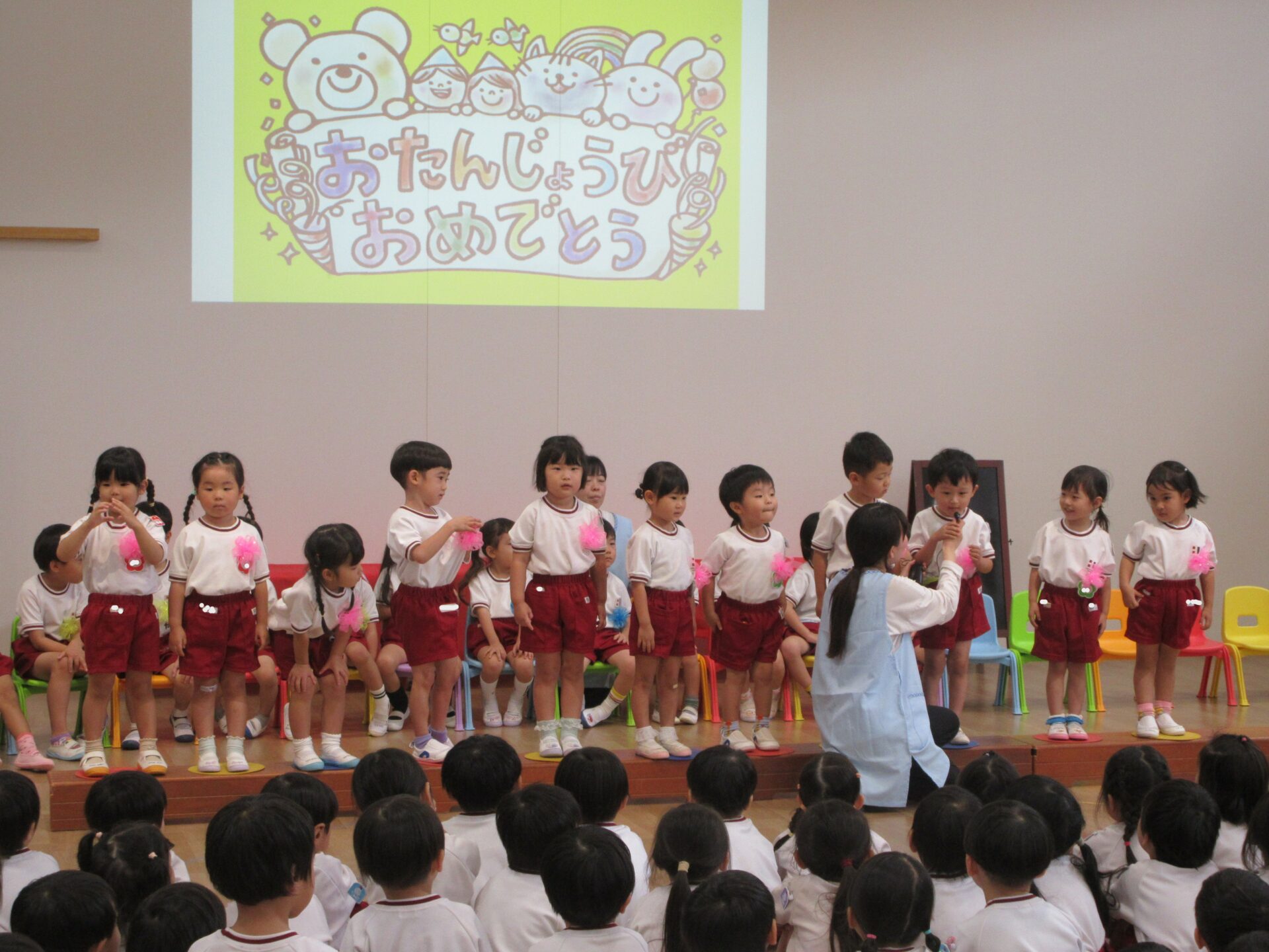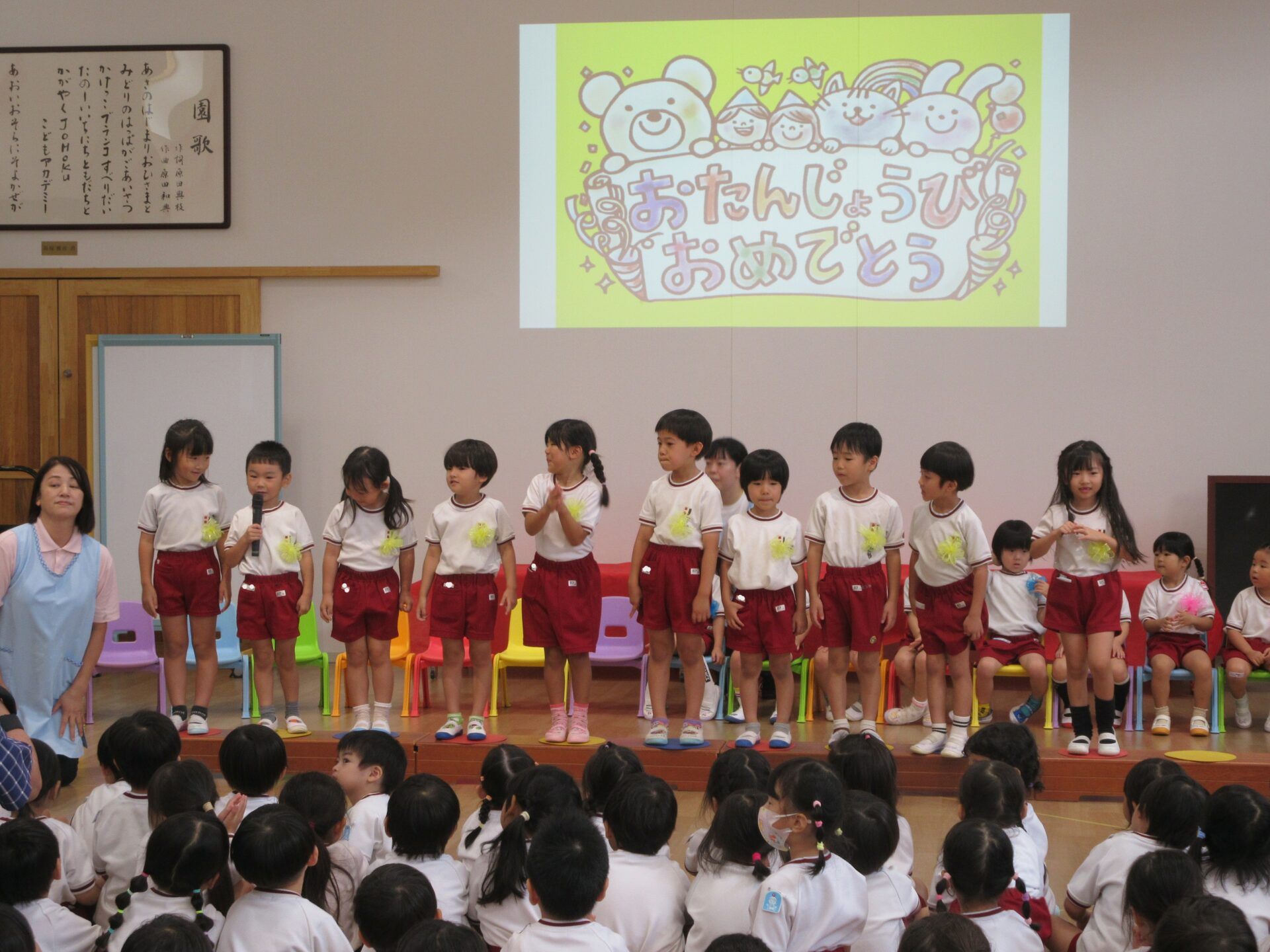 幼児部の10月の誕生日会を行いました。誕生児の園児たちが拍手に迎えられて入場です。