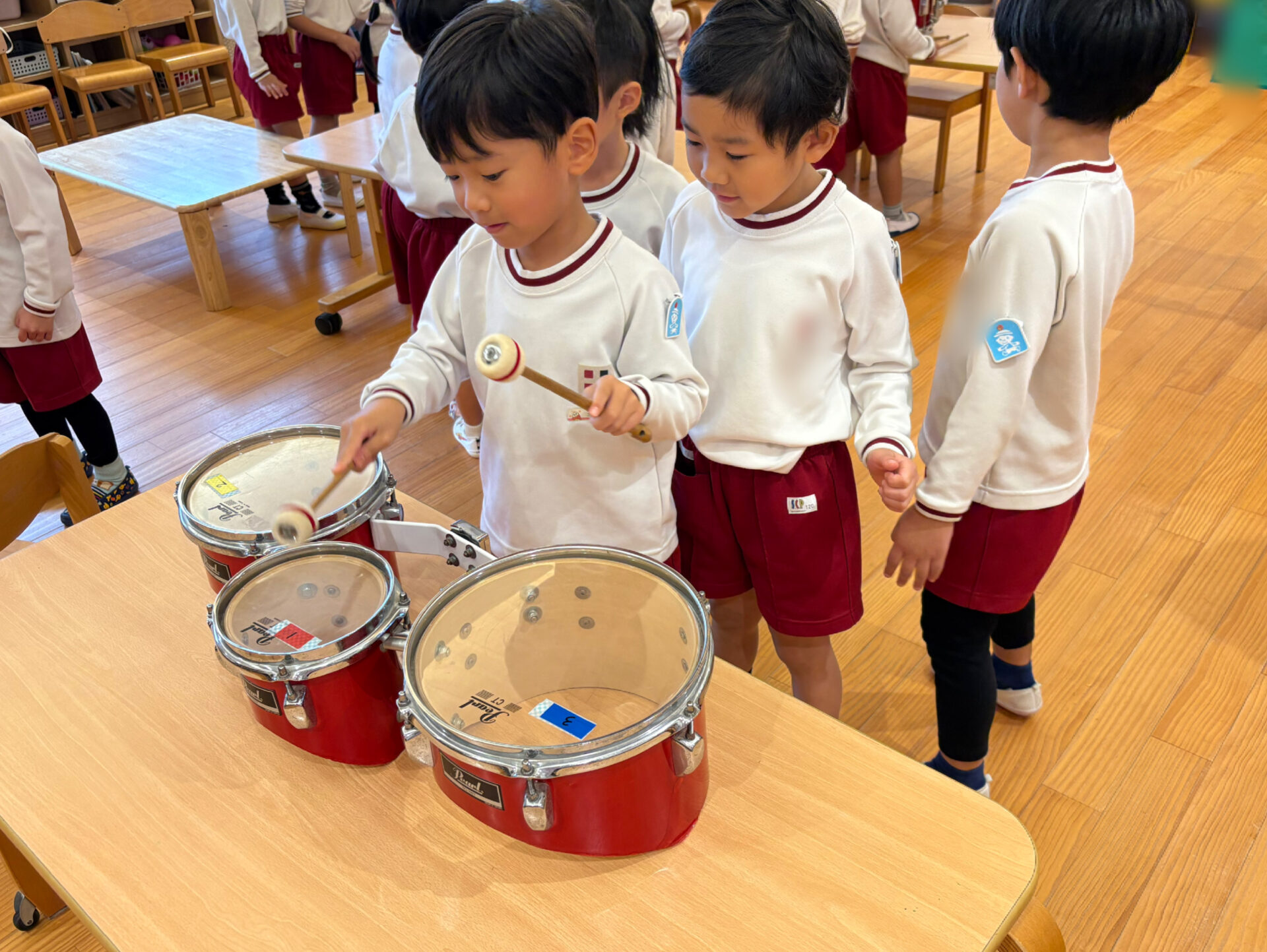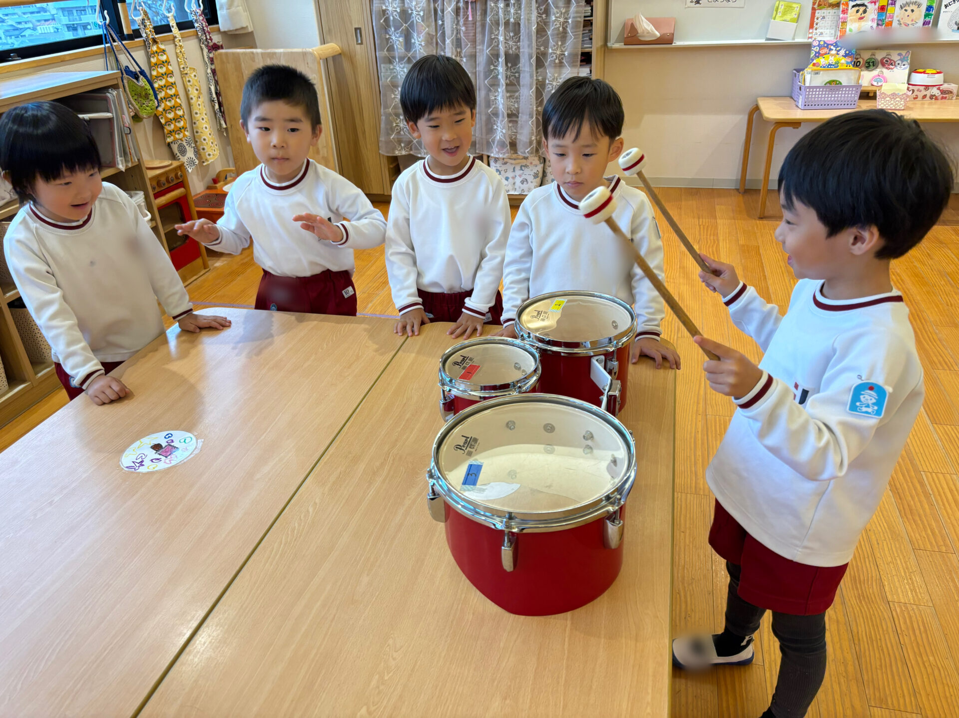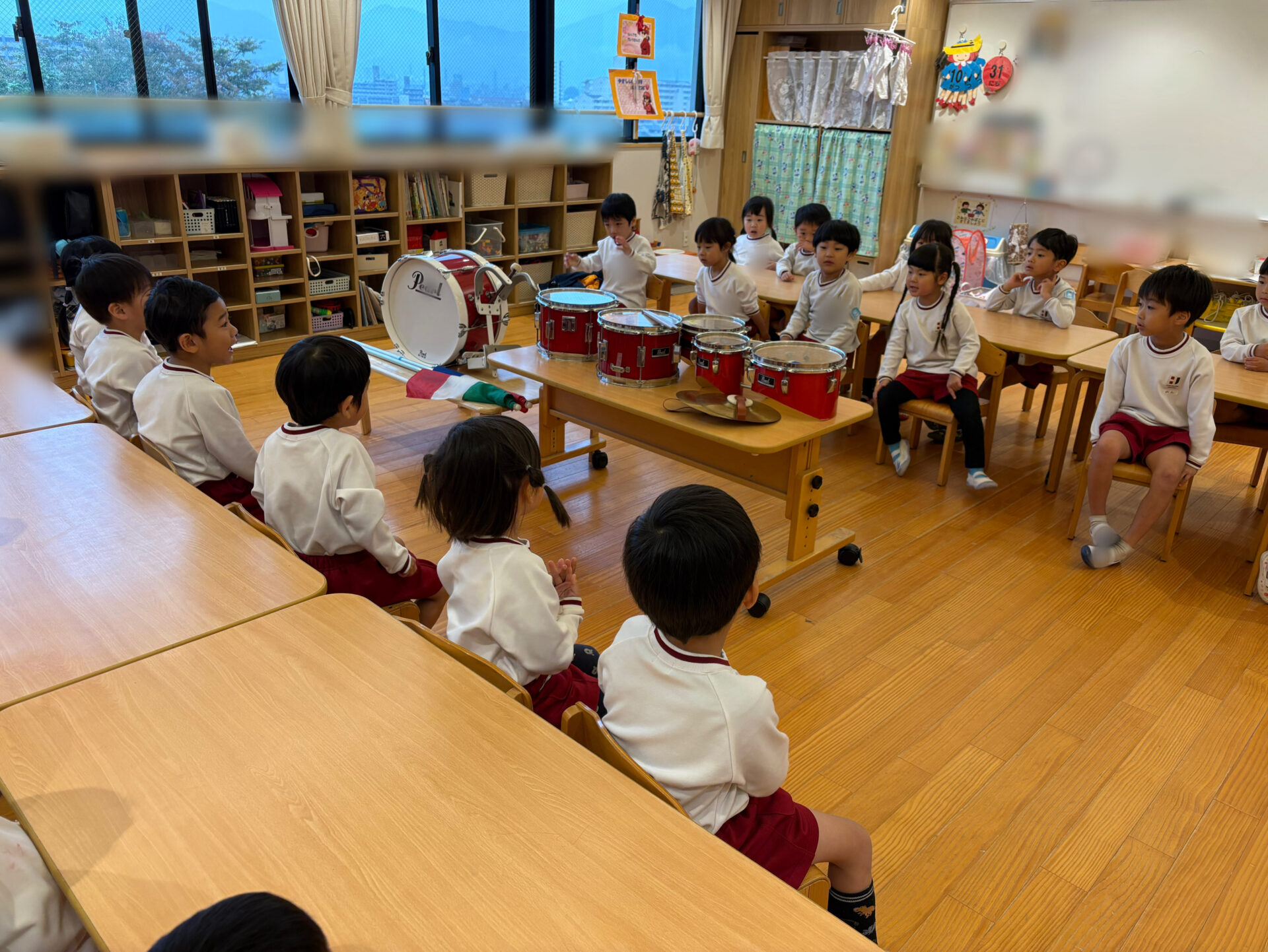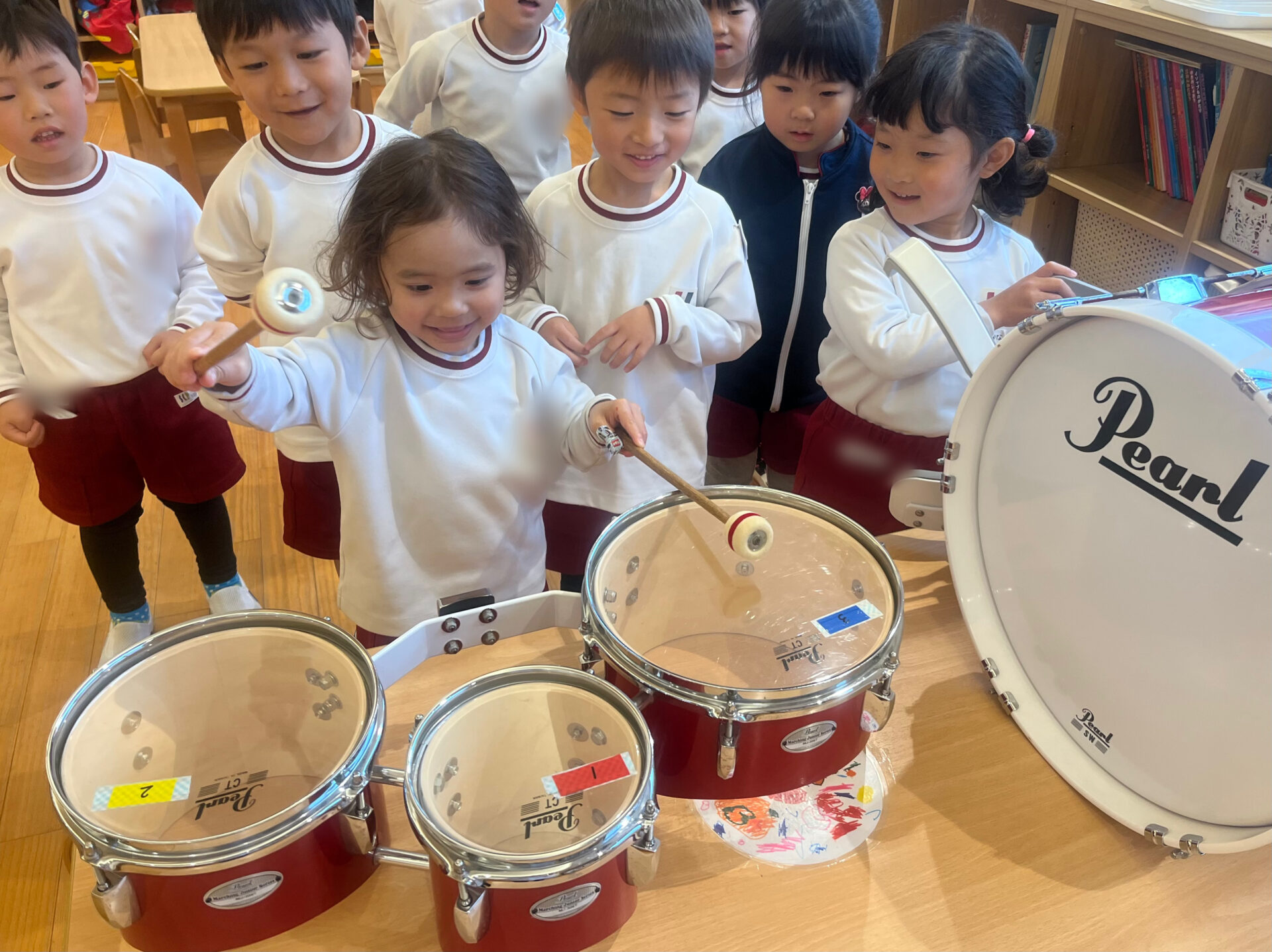 年長さんが運動会で頑張った鼓隊の楽器や旗に触れさせてもらいました。