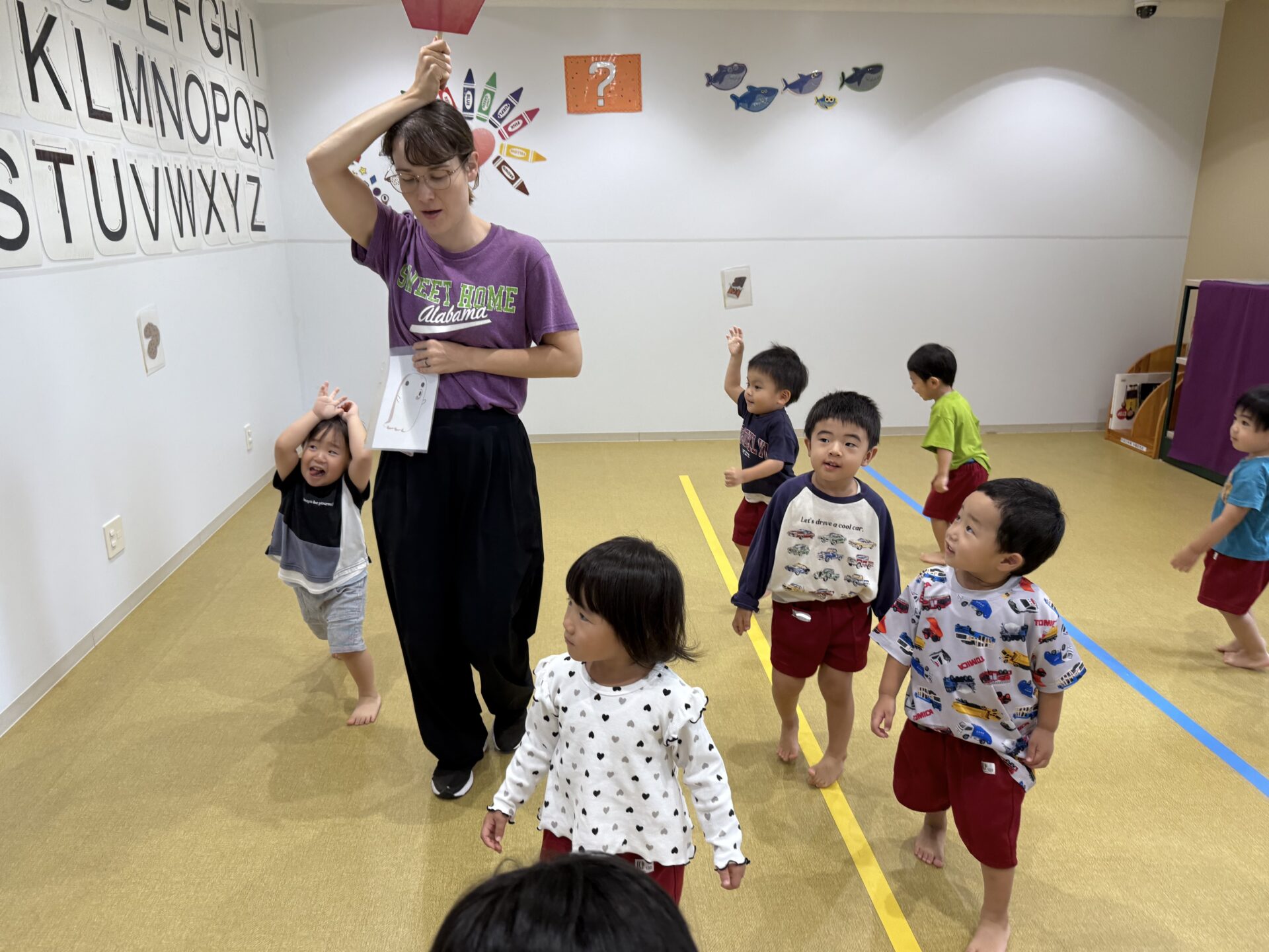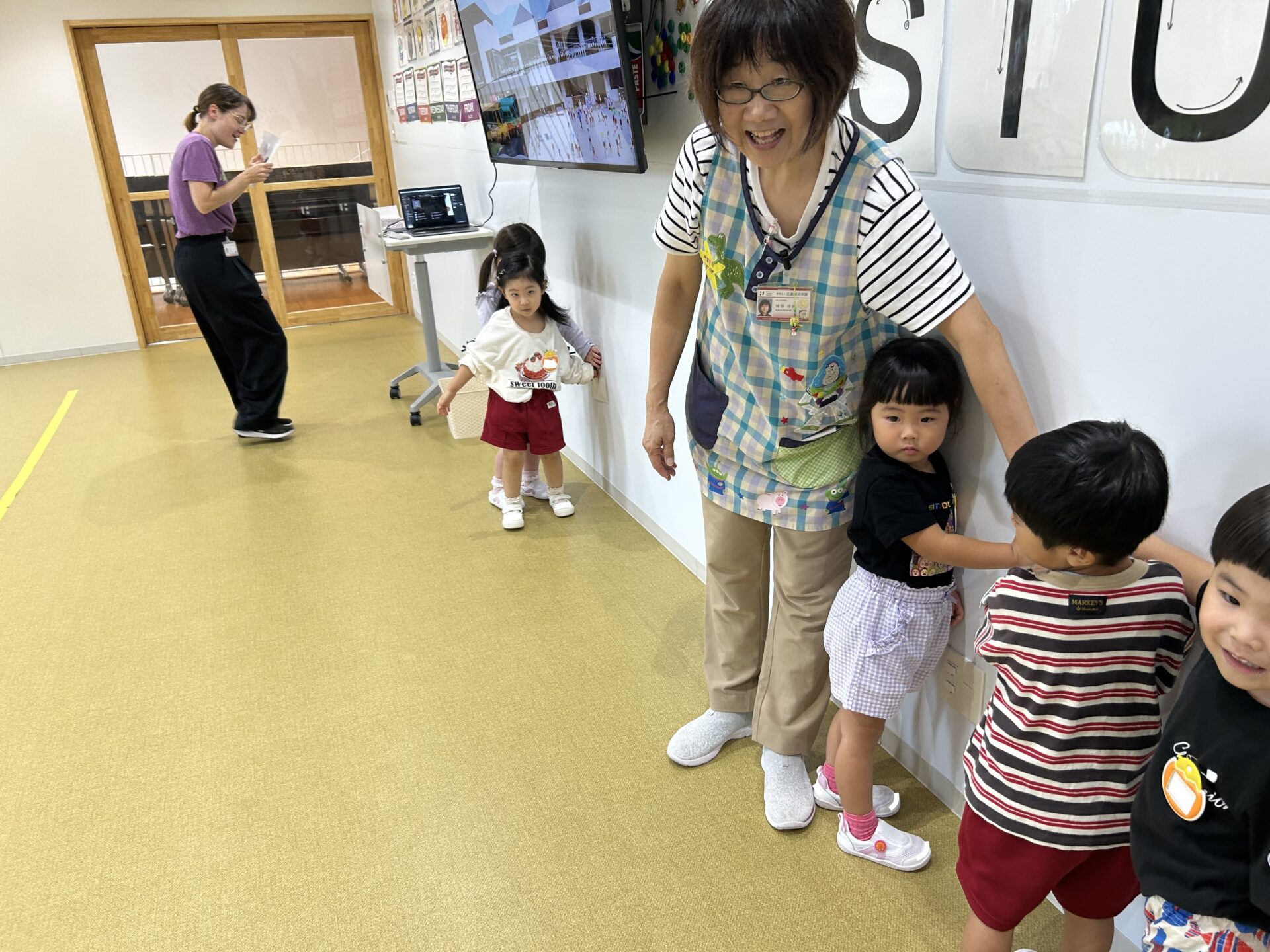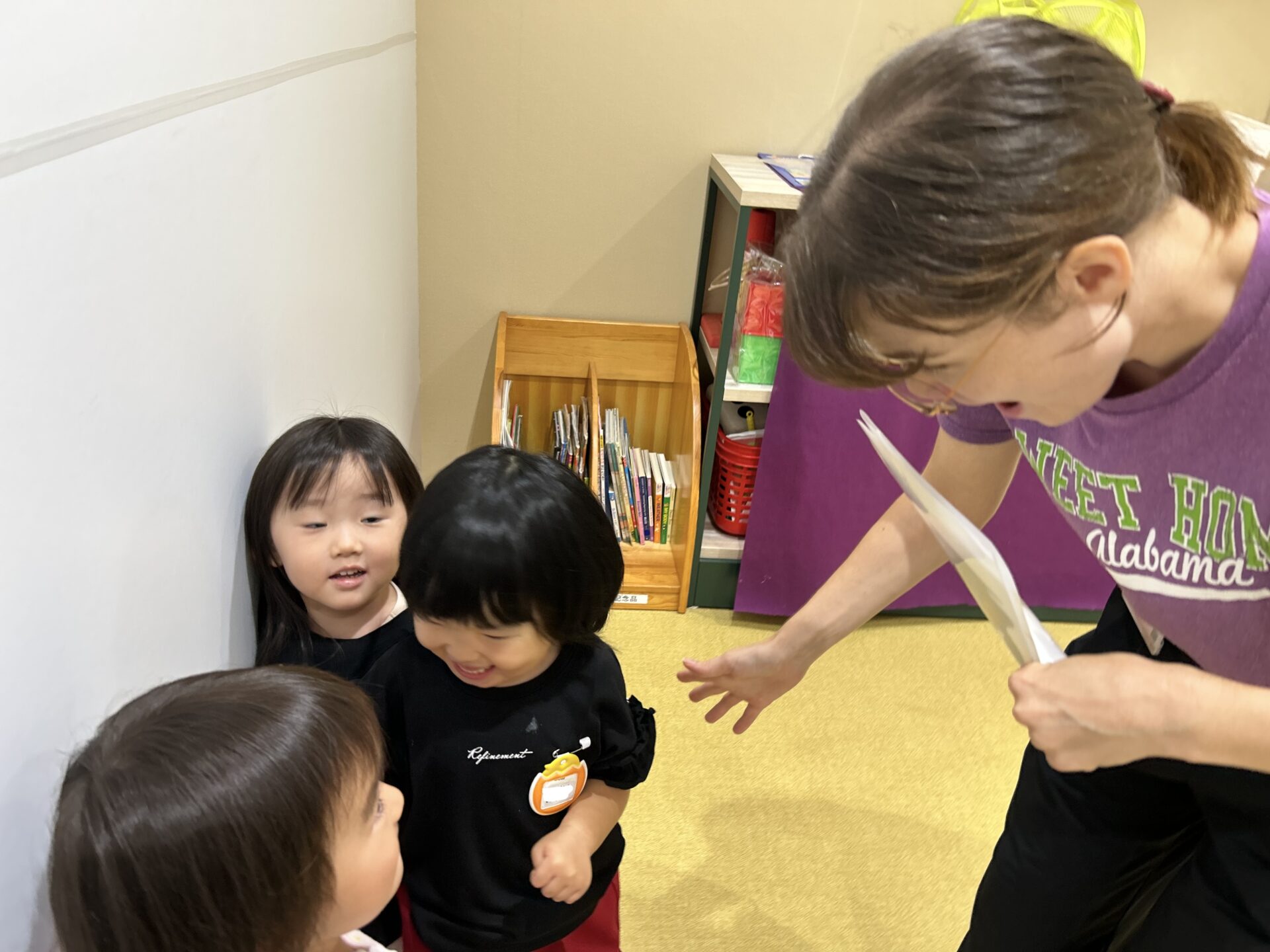 イナイイナイバア!見えるね!小さなお友達がコウモリとゴーストを使ってハロウィンのいないいないばあで遊びに来てくれました。お菓子も用意されていました!音楽が流れてみんな立ち上がって歩き回りましたが、音楽が止まるとゴーストが現れました!みんなゴーストが来る前にお菓子を取りに行っていました。本当に元気いっぱいの時間でした。また遊びに来てね!英語あそびはいつも楽しいですよ。