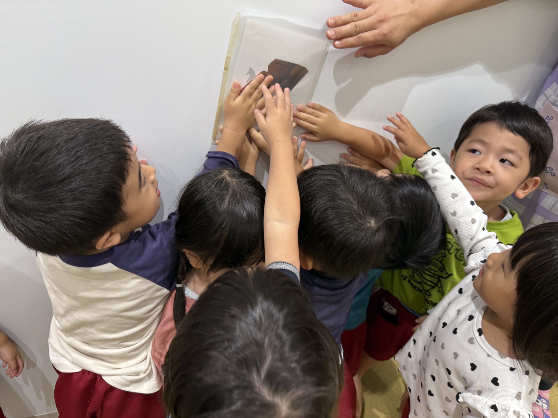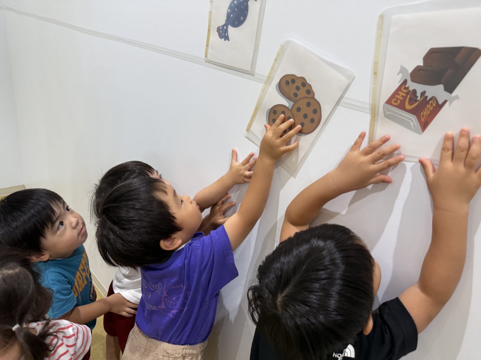 Peek-a-Boo; I see you! Our young friends came to play Halloween peek-a-boo with a bat and ghost. There were also treats involved! Then music played and everyone got up to walk around, but then the music stopped and out came a ghost! Every one ran to grab a treat before the ghost came. It was a really energetic time. Come back and play again! It’s always fun during English Play.