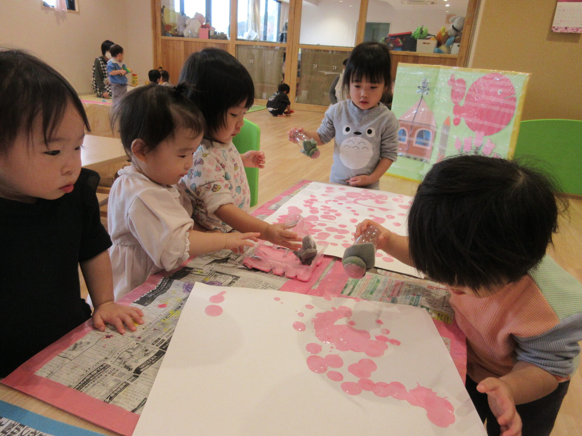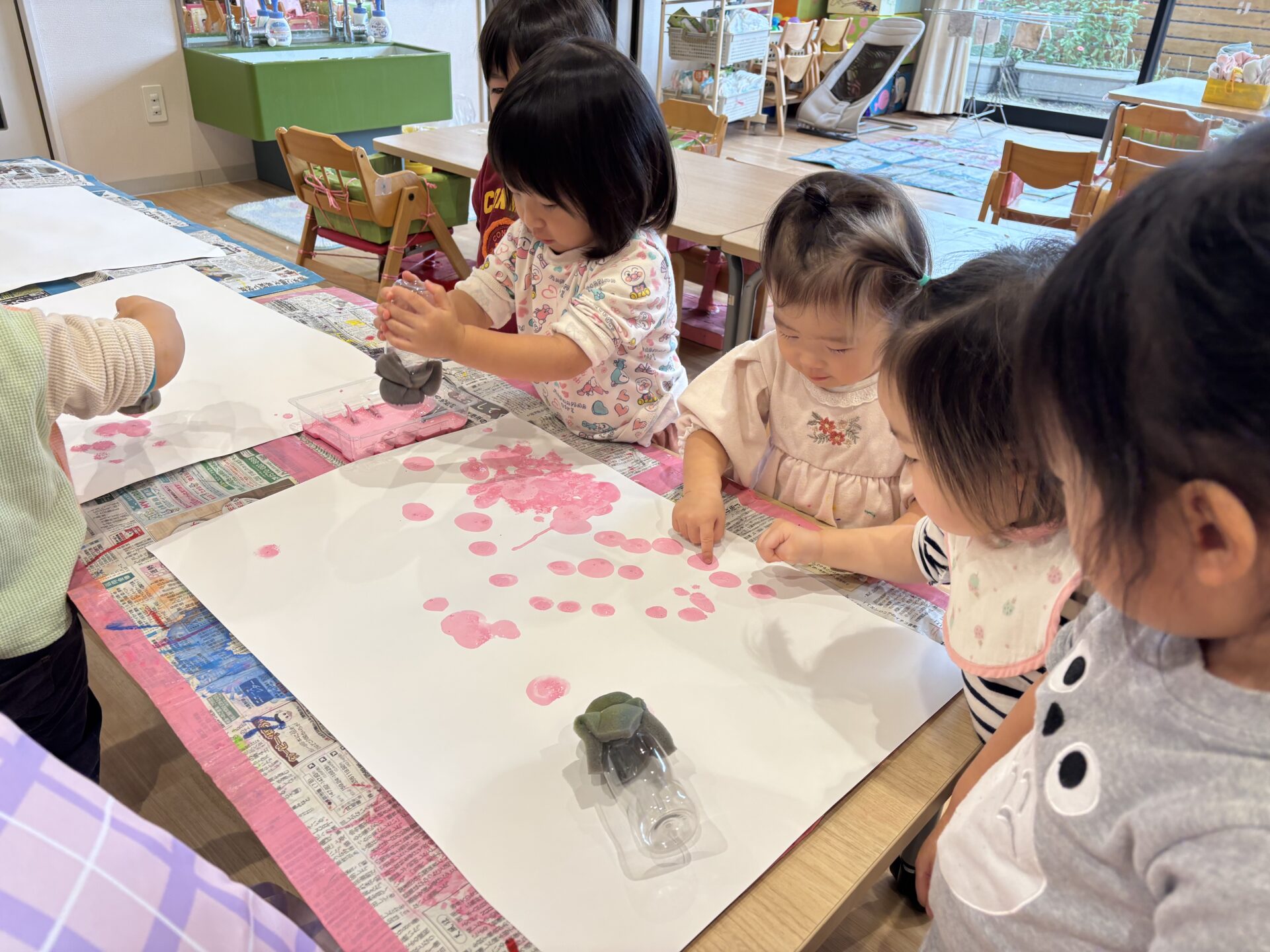 「わぁ~上手だね👏」保育教諭の声が響きます👂絵の具をたんぽに付けて「とんとんとん」と画用紙の上に乗せていきます🖌何度かやったことがあるので今回は、再チャレンジです✨Squirrel組も“やりたい~”アピール全開です🐿♡