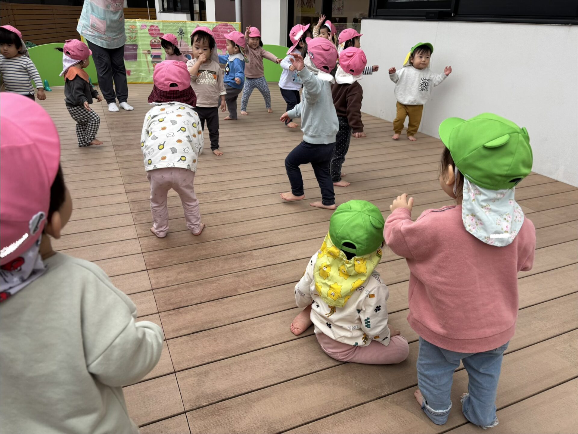 ウッドデッキでは、運動遊びや体操をして身体をたくさん使って遊びました☆また…明日も遊ぼうね🩷💚